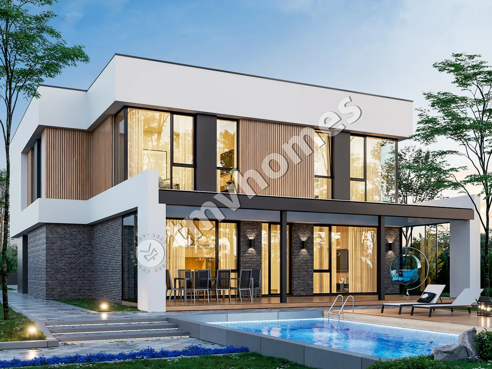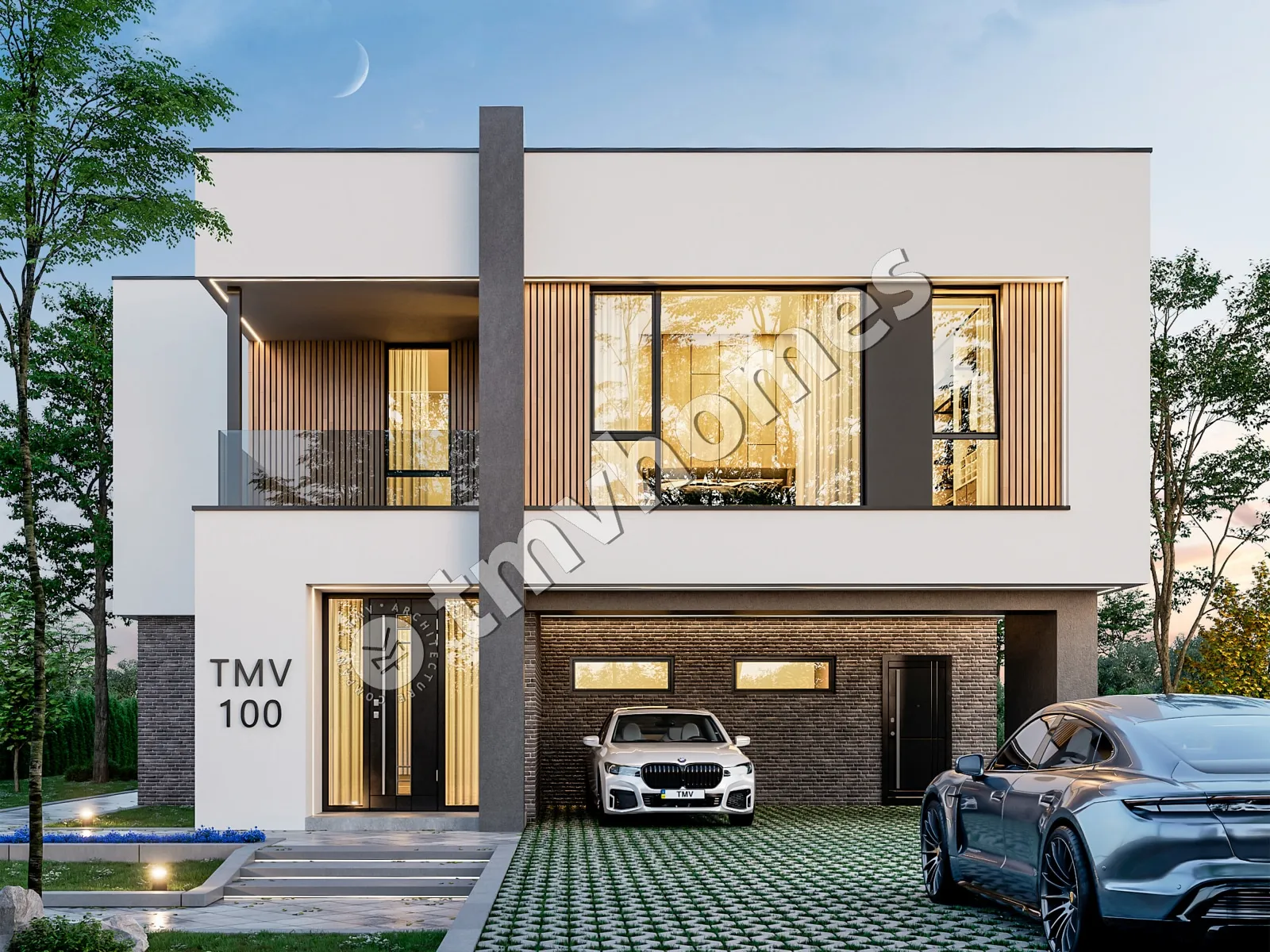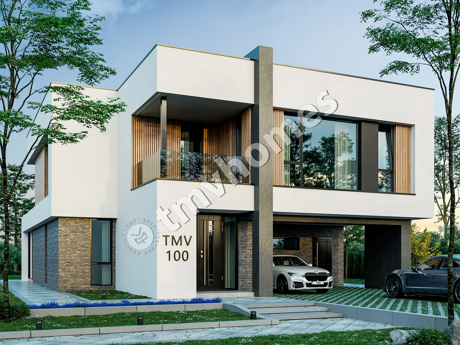 Project TMV 100 - a modern two-storey high-tech house with a flat roof, a terrace, a balcony and a carport for 2 cars. Composition of premises: entrance hall, living room, kitchen-dining room, cabinet, 3 bedrooms, 3 bathrooms, laundry room, dressing room, storage room, boiler room.