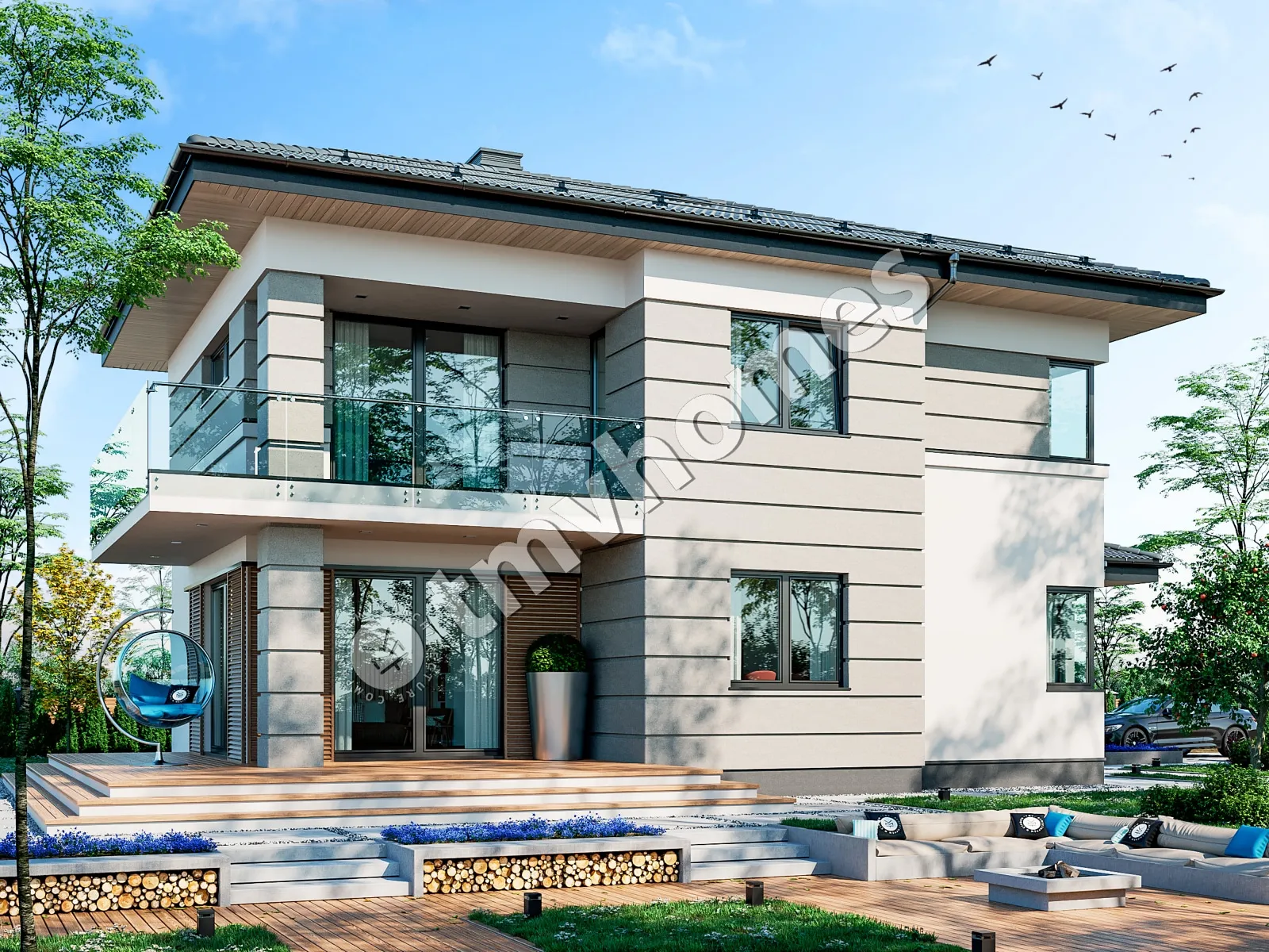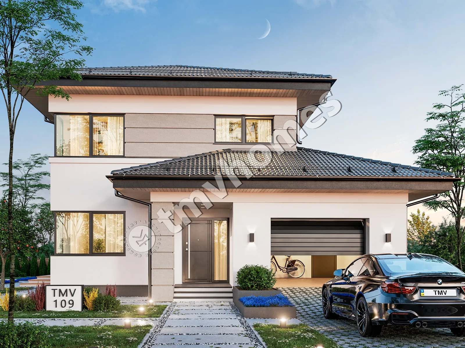 Project TMV 109 - a modern two-storey house with a terrace, balcony and garage for 1 car. Composition of the premises: entrance hall, living room, kitchen-dining room, 3 bedrooms, 3 bathrooms, dressing room, boiler room.