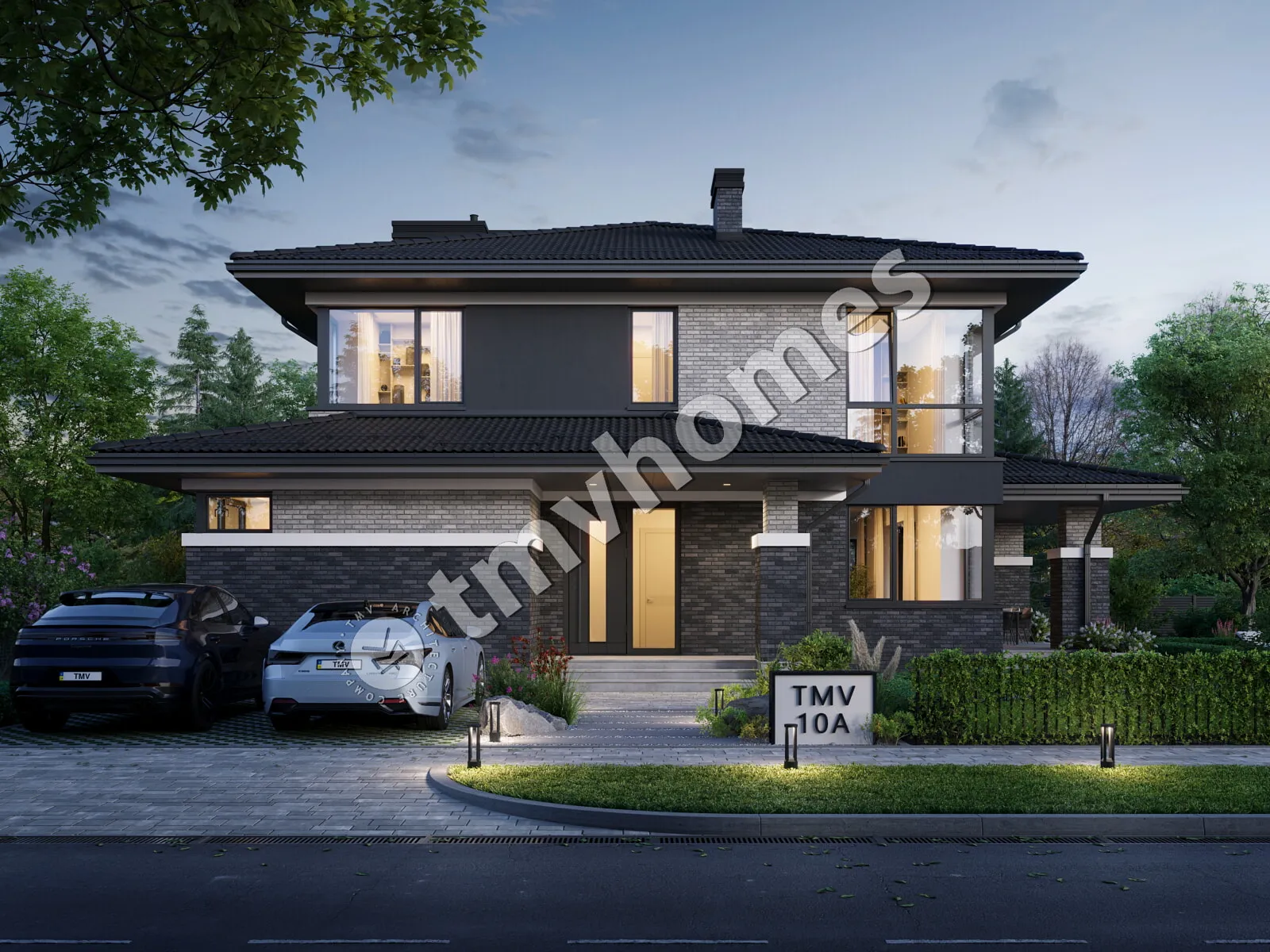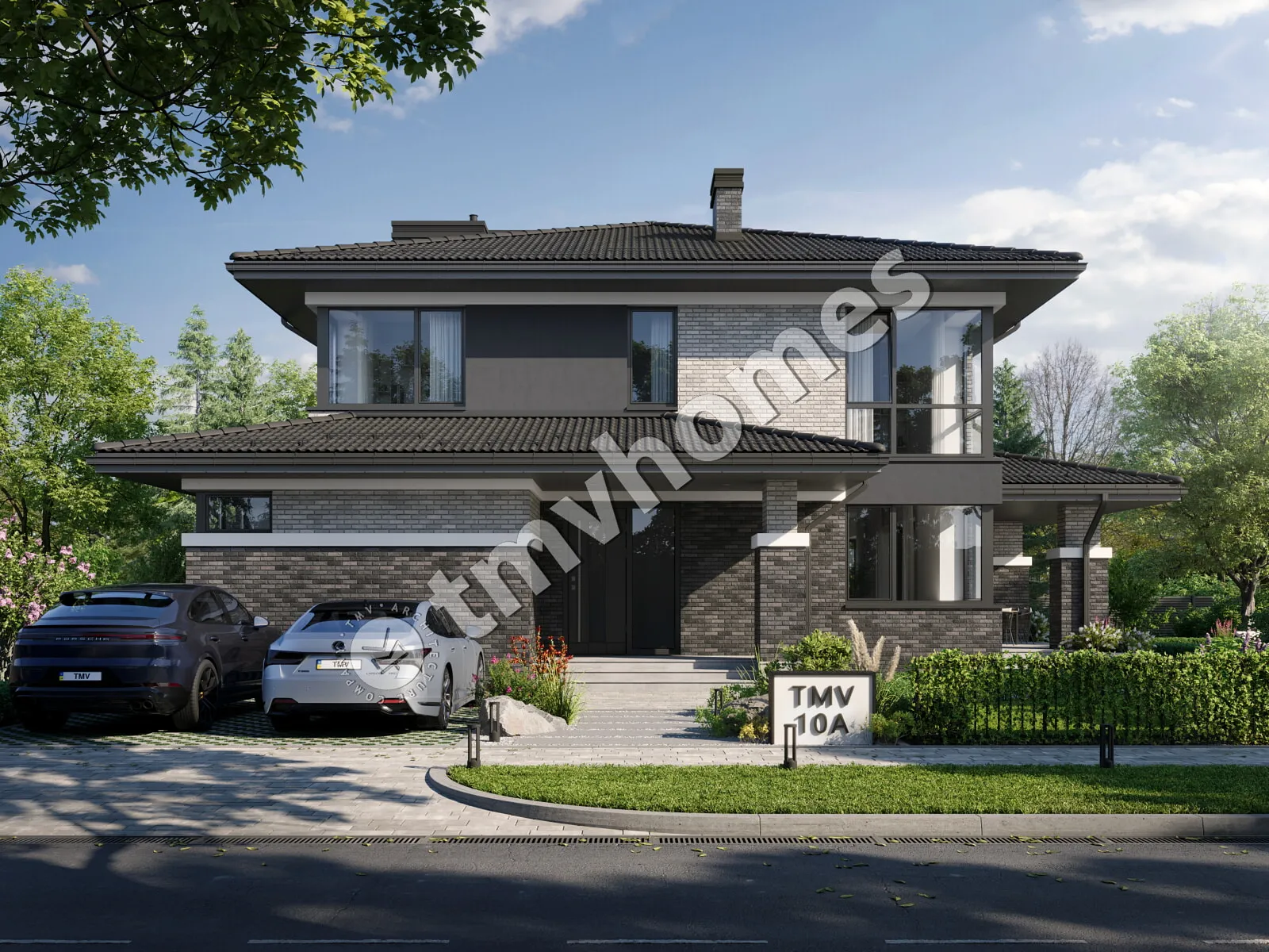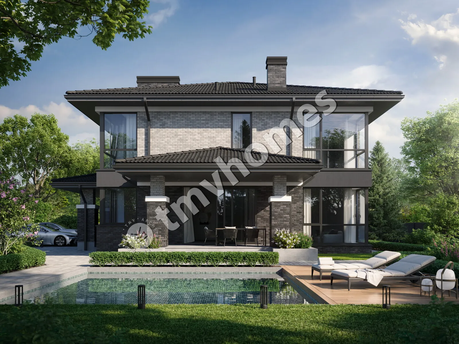 Project TMV 10A - a brick two-storey house with a covered terrace. Composition of the premises: entrance hall, hall, kitchen-living room, 4 bedrooms, 3 bathrooms, dressing room, storage room, boiler room.