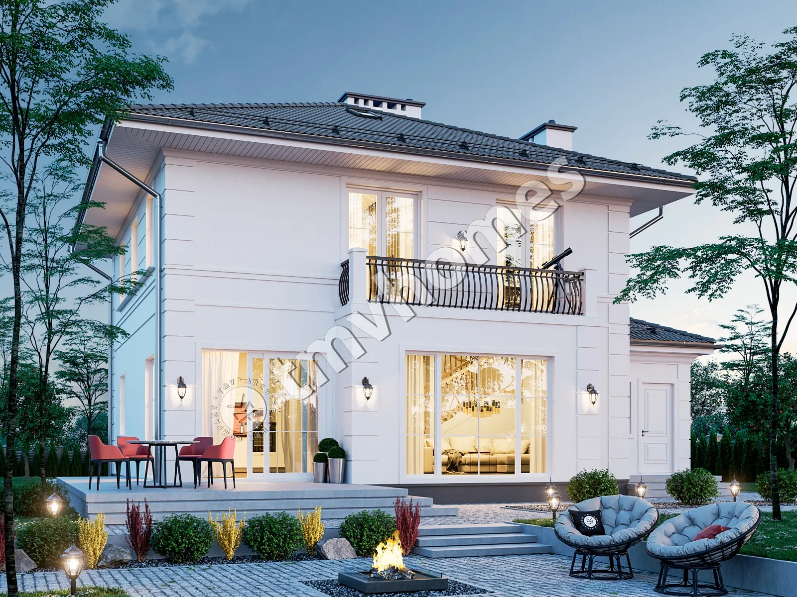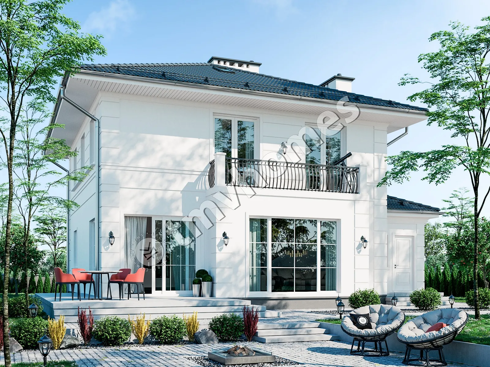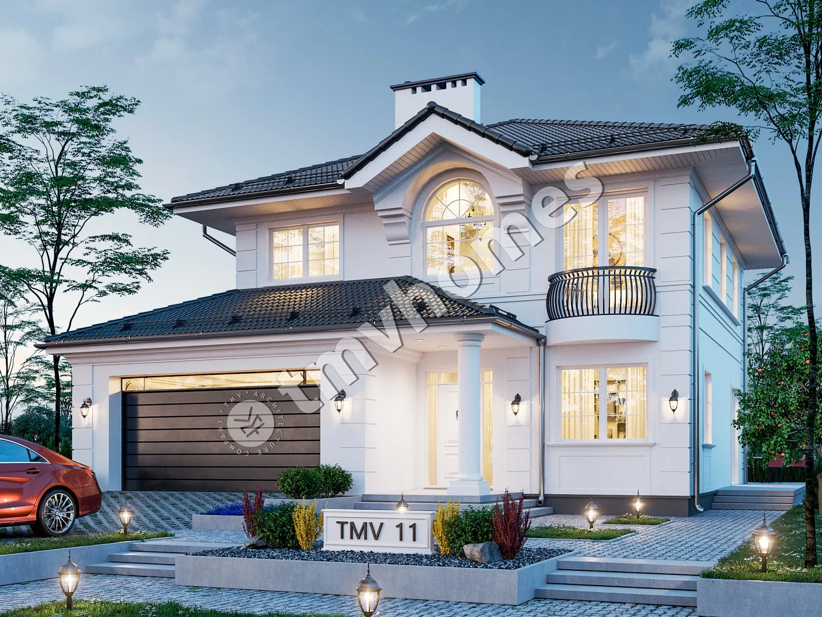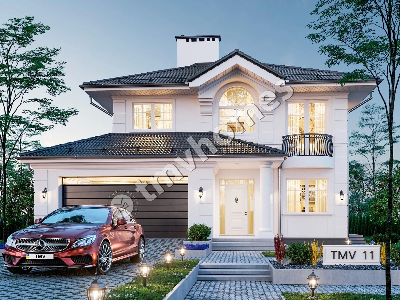 Project TMV 11 - a classic two-storey mansion with a terrace and a garage for 2 cars. Composition of the premises: entrance hall, kitchen-dining room, living room, cabinet, 3 bedrooms, 3 bathrooms, dressing room, boiler room.
