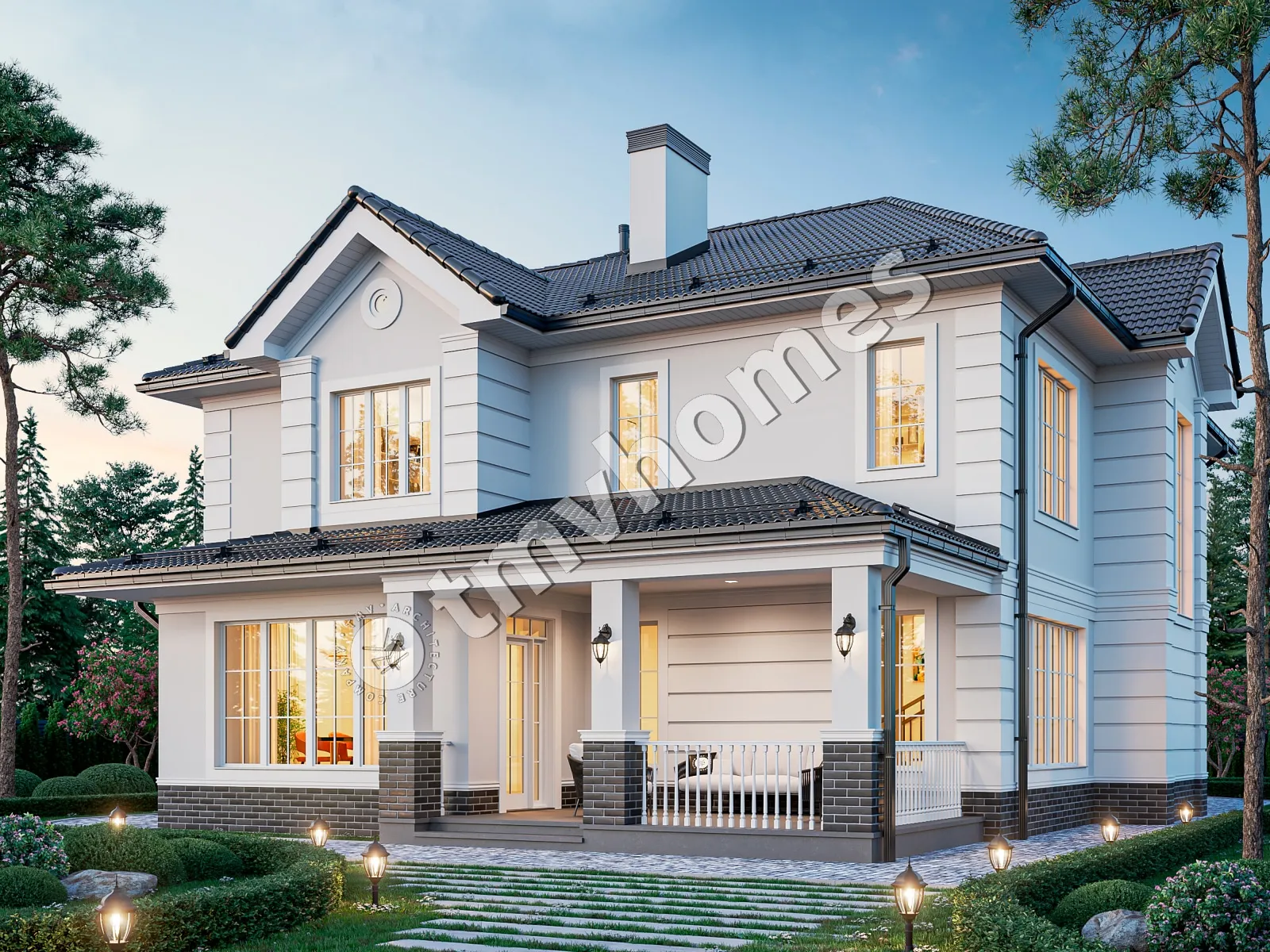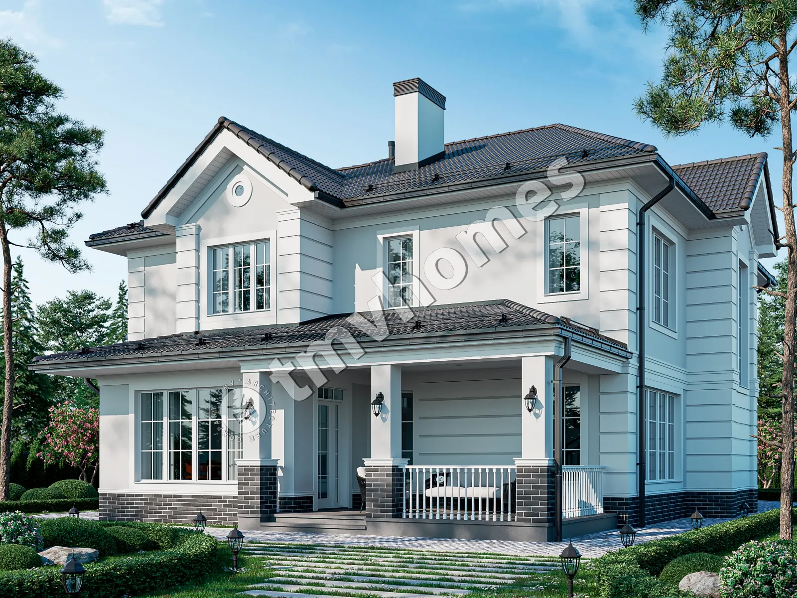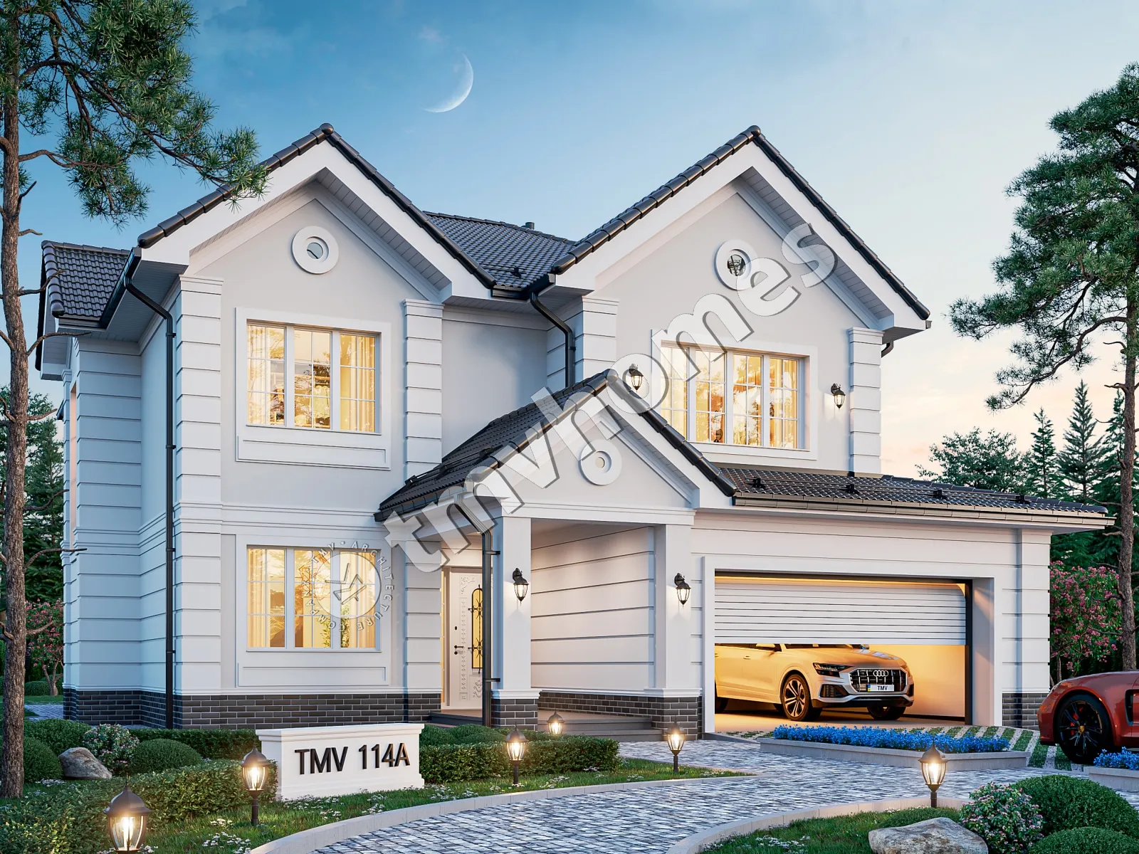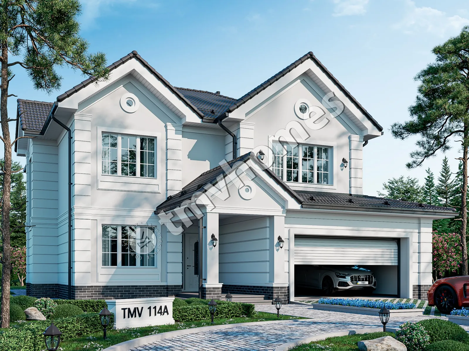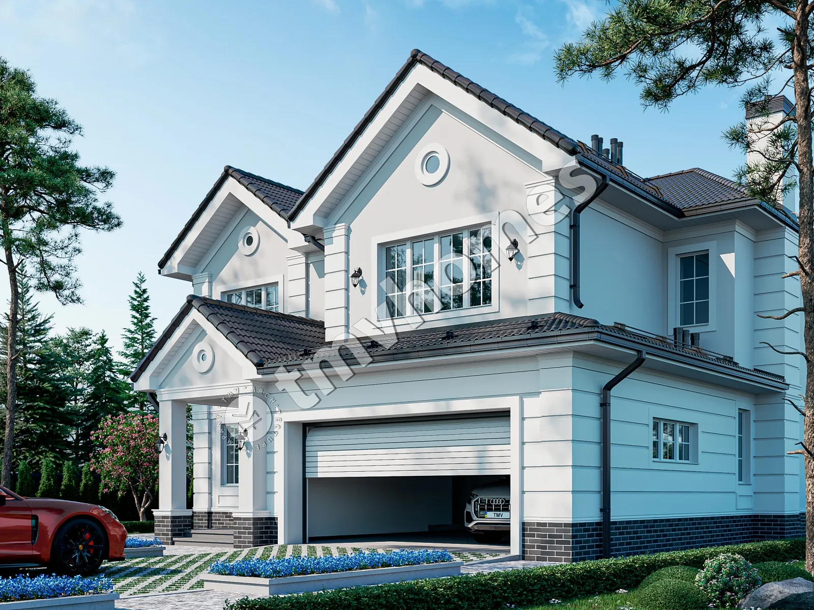 Project TMV 114A - a classic two-storey mansion in English style, with a terrace and a garage for 2 cars. Composition of the premises: entrance hall, hall, cabinet, living room, kitchen-dining room, 4 bedrooms, 4 bathrooms, dressing room, storage room, laundry room, boiler room.