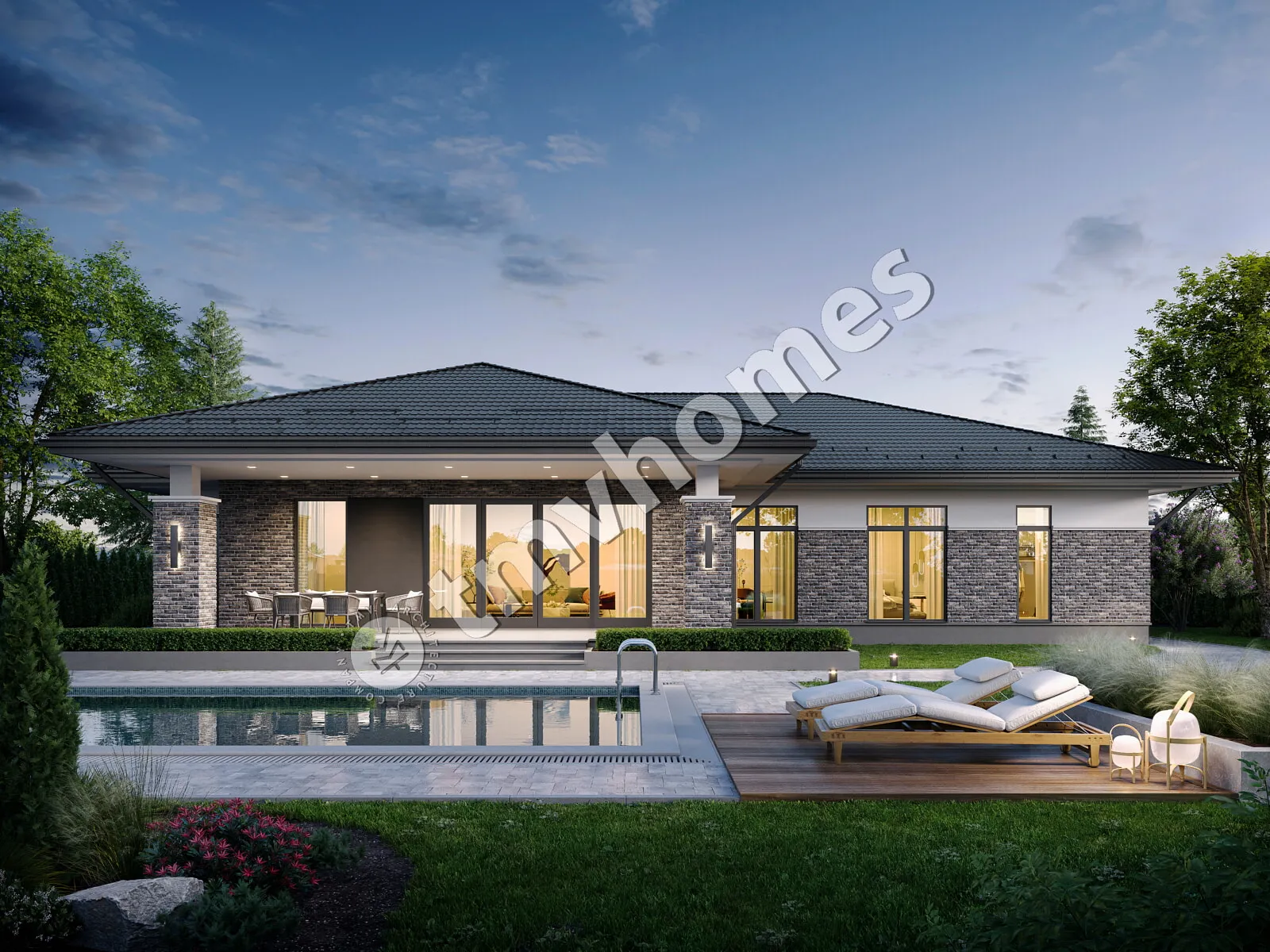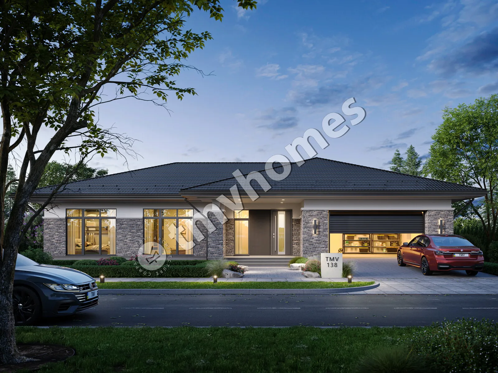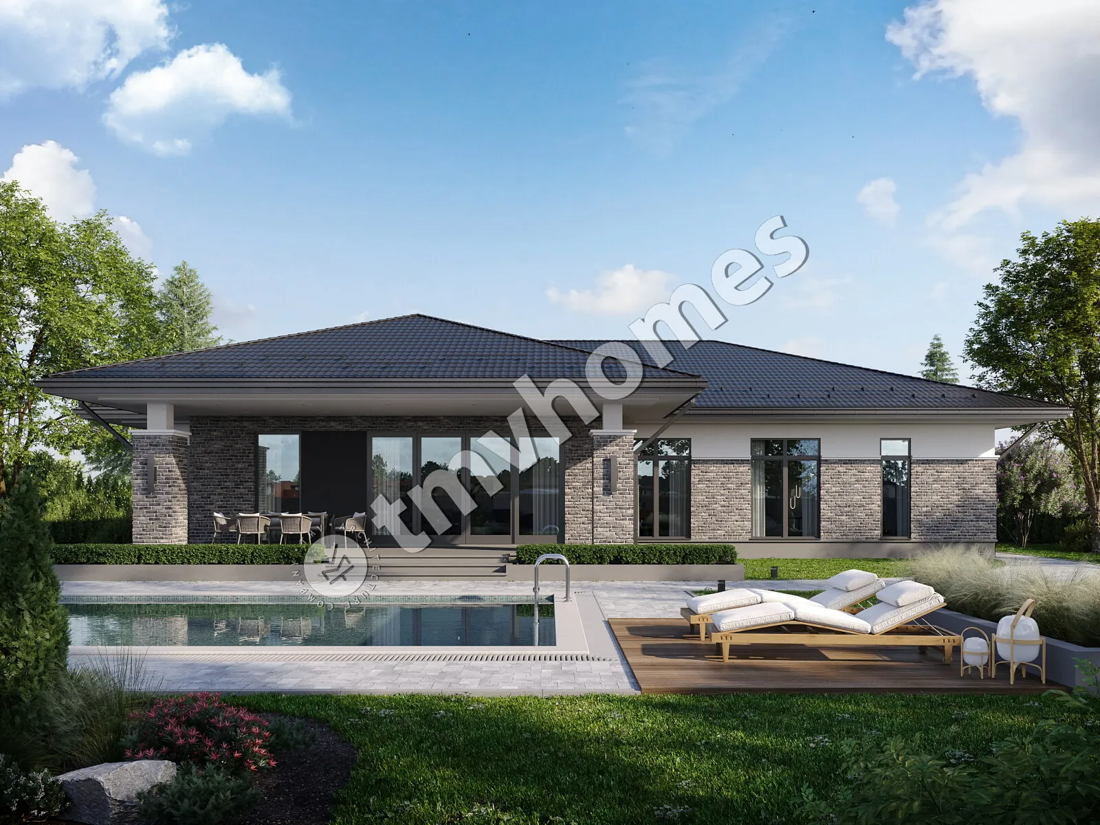 Project TMV 138 - a comfortable one-storey house with a terrace and a garage for 2 cars. Composition of the premises: entrance hall, hall, living room, kitchen-dining room, 3 bedrooms, 3 bathrooms, dressing room, storage room, boiler room.