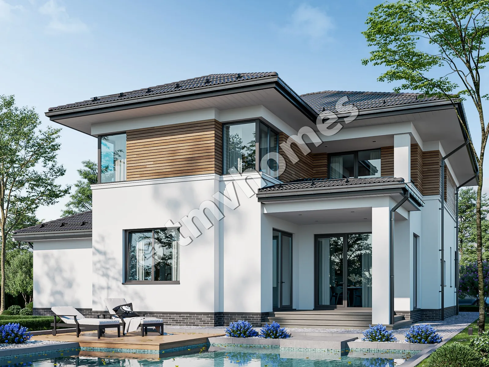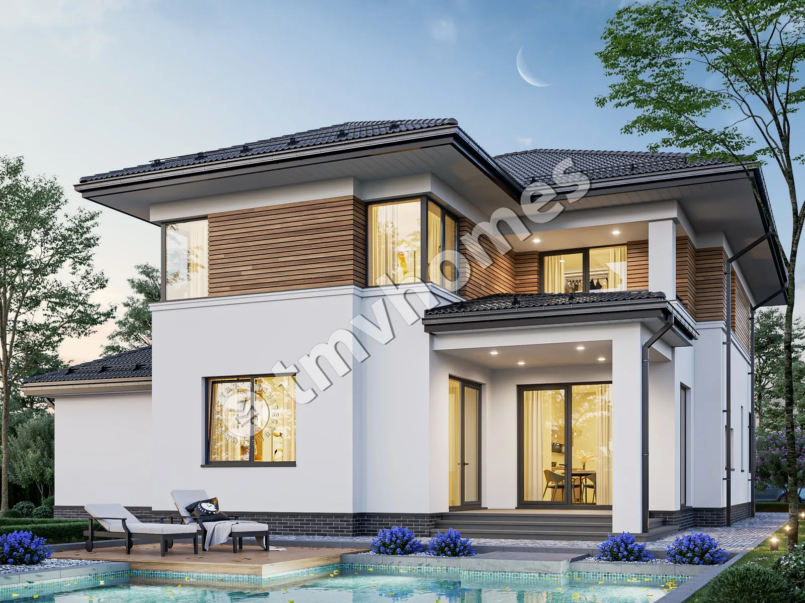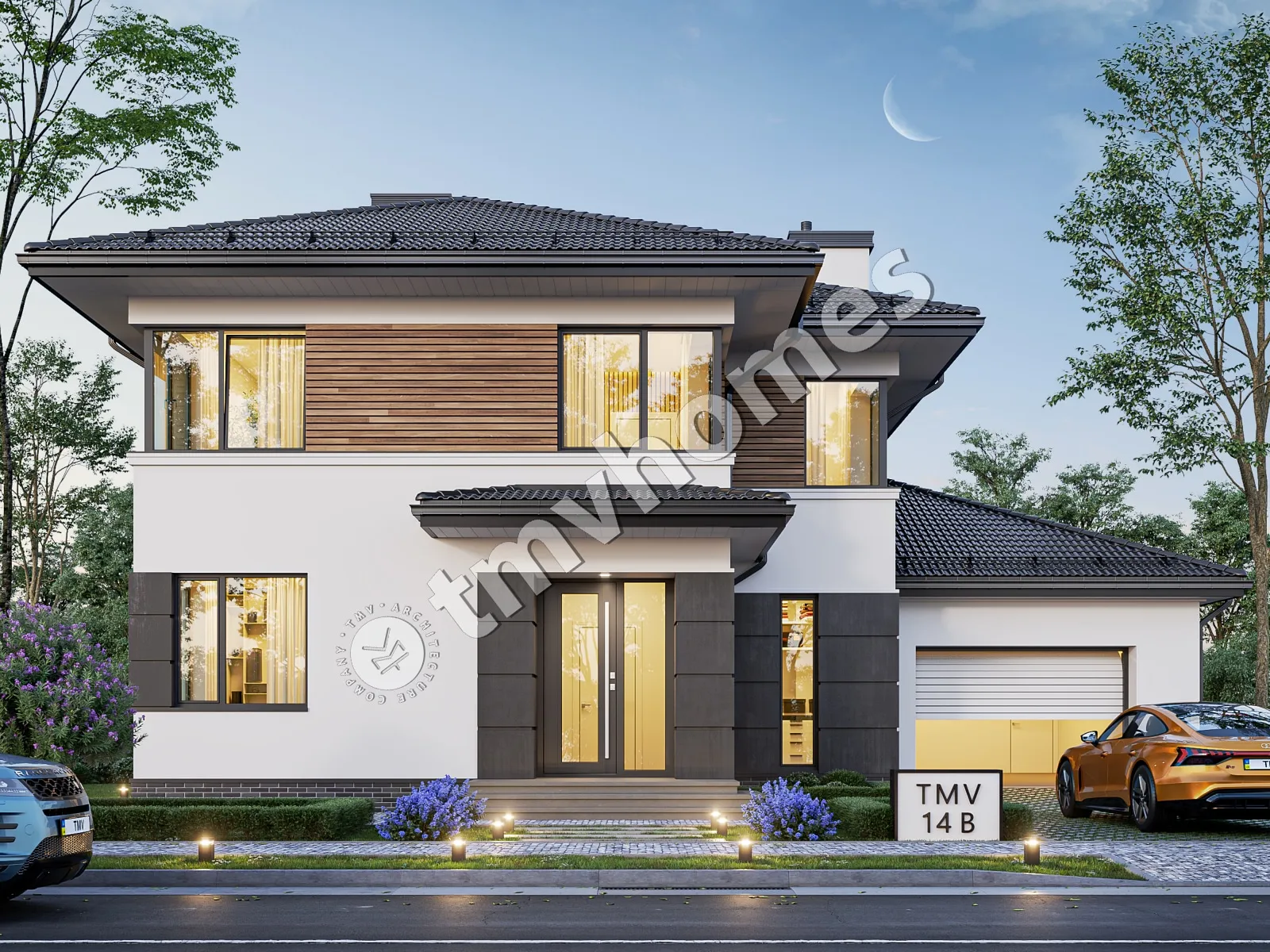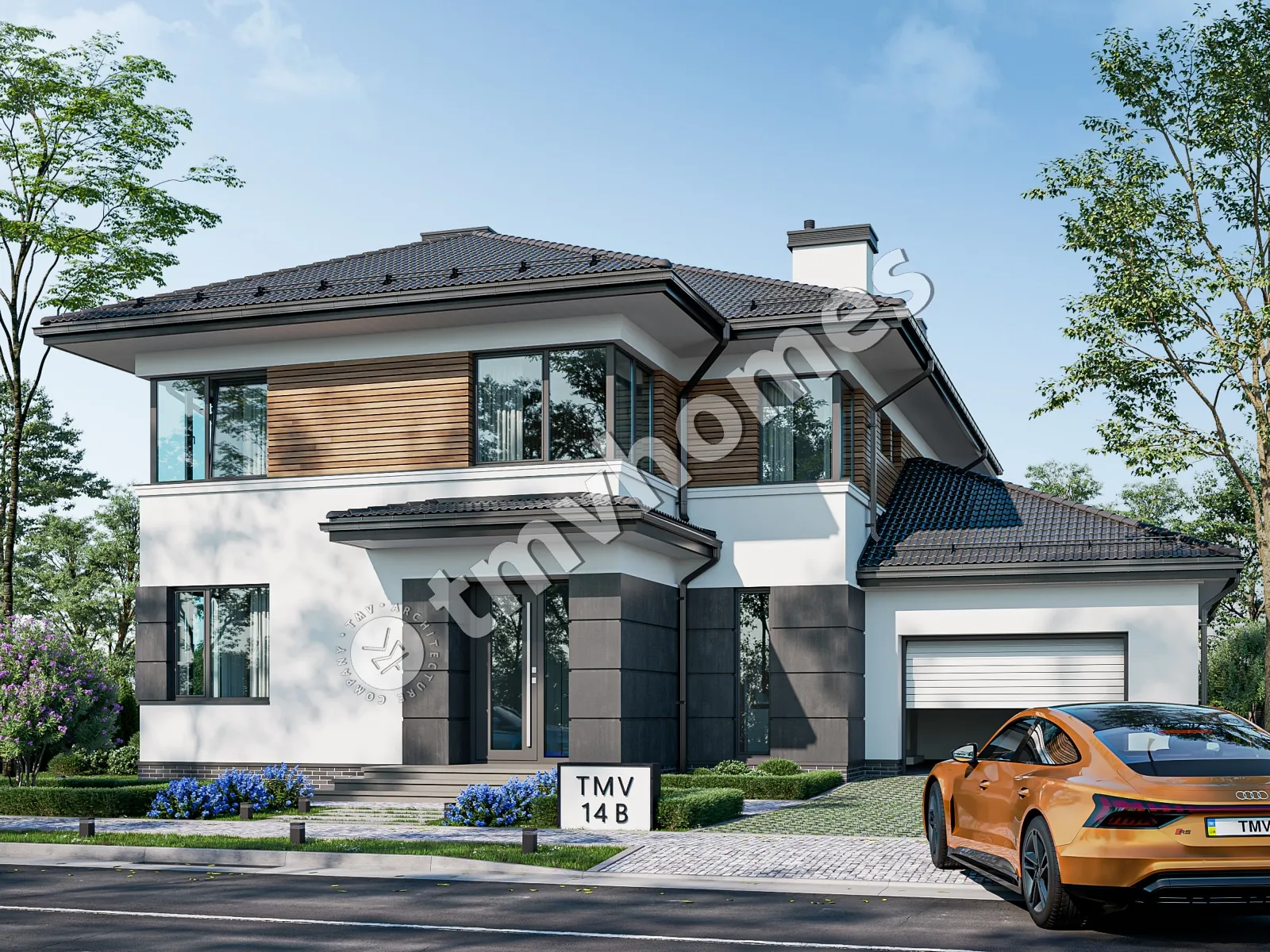 Project TMV 14B - a modern two-storey house with a terrace, balcony and garage for 1 car. Composition of the premises: entrance hall, hall, kitchen-dining room, living room, 5 bedrooms, 3 bathrooms, laundry room, dressing room, storage room, boiler room.
