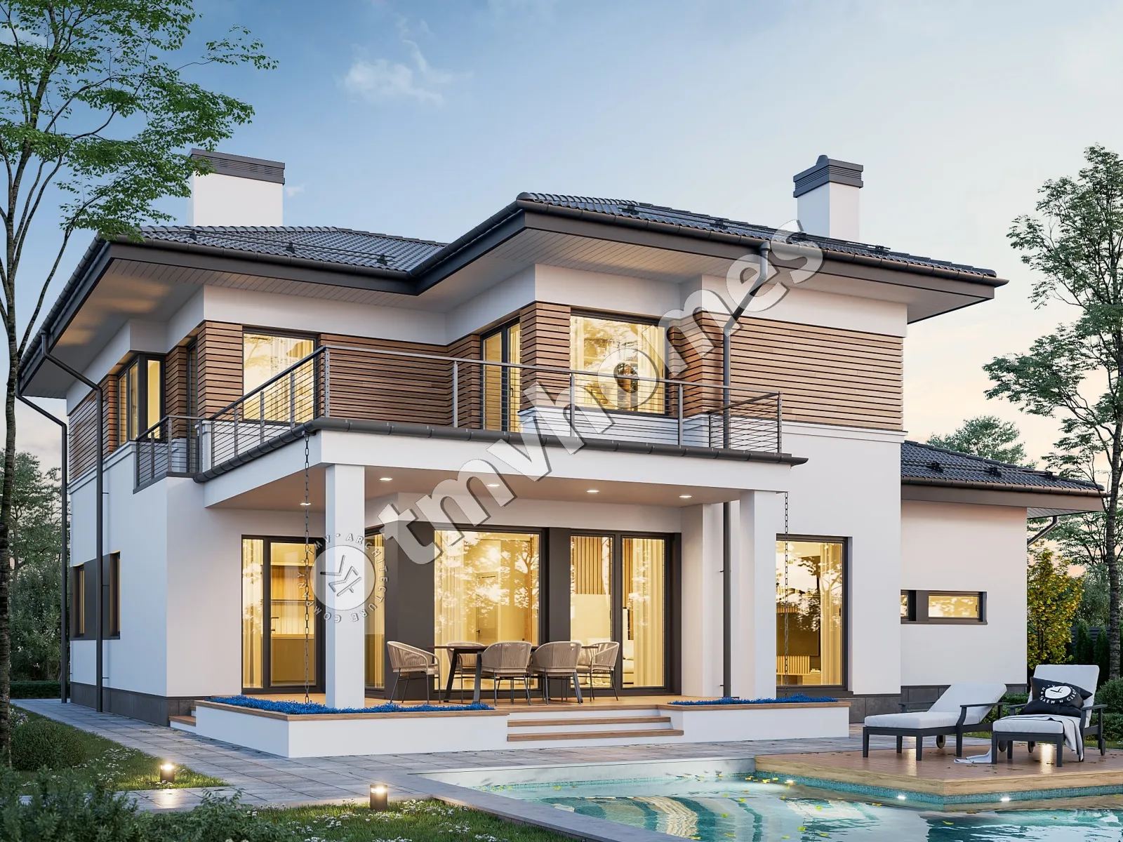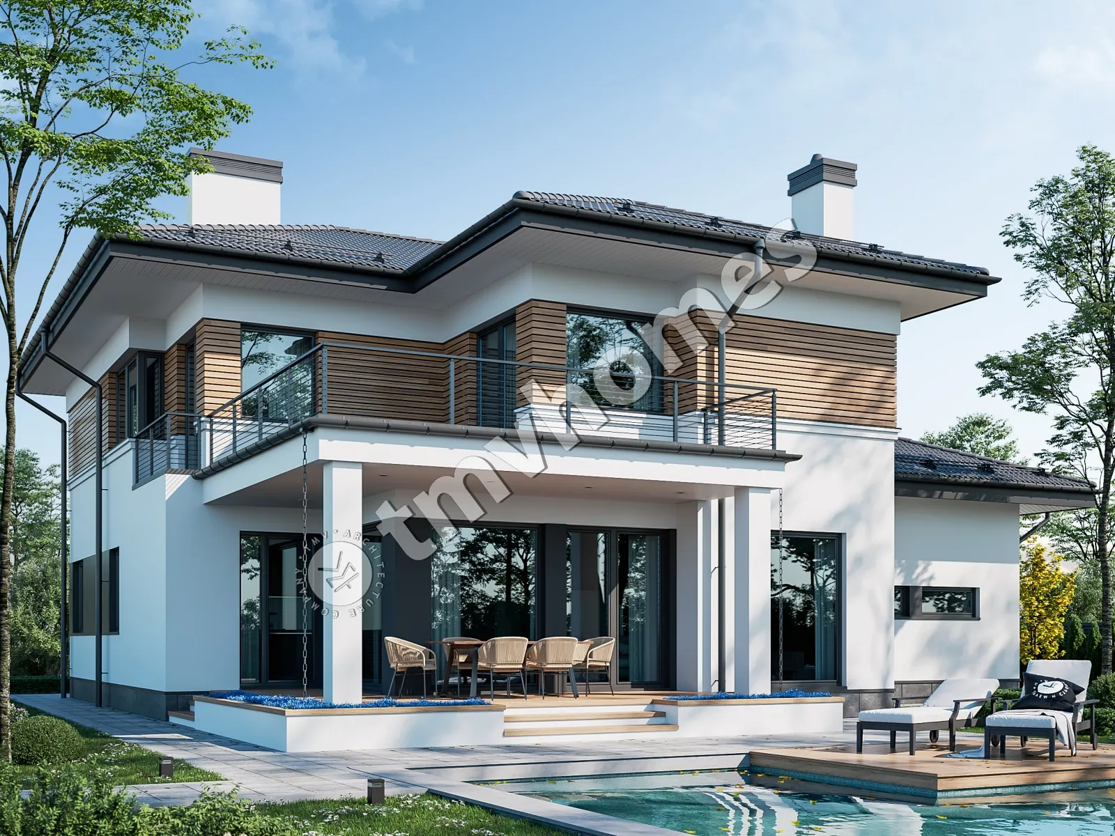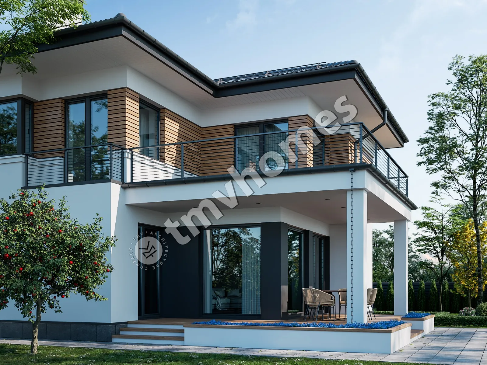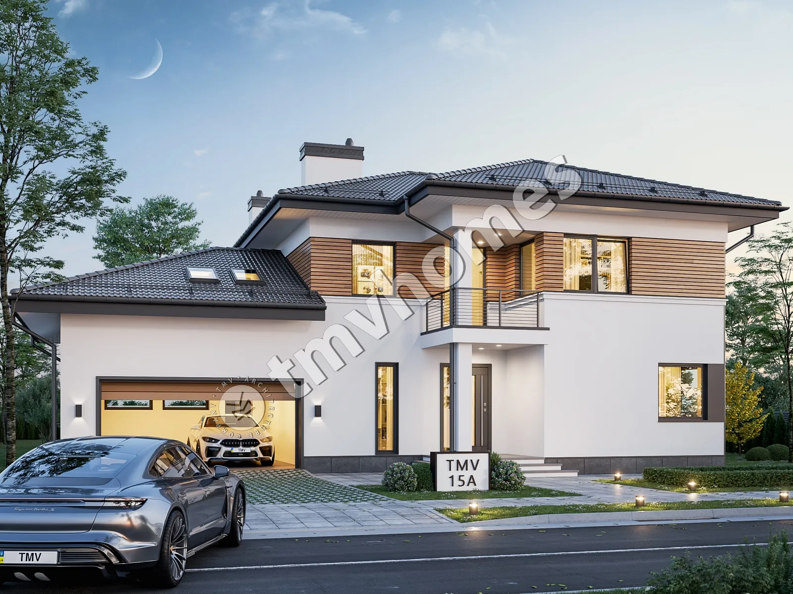 Project TMV 15A - a modern two-storey house with terraces, balcony and garage for 2 cars. Composition of the premises: entrance hall, hall, kitchen-dining room, living room, cabinet, 3 bedrooms, 3 bathrooms, rest room, dressing room, storage room, boiler room.