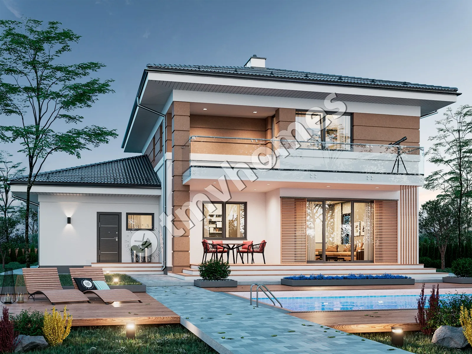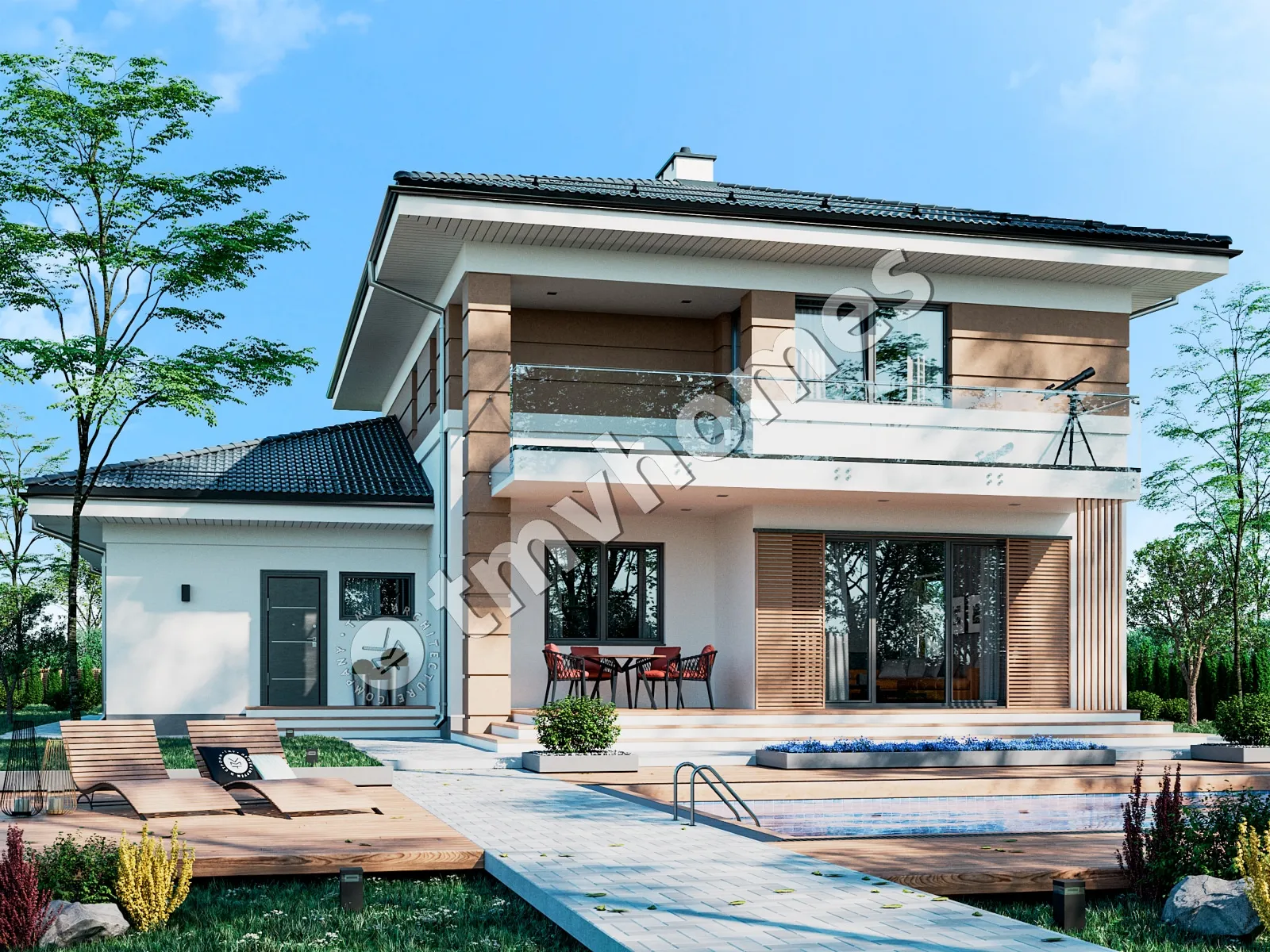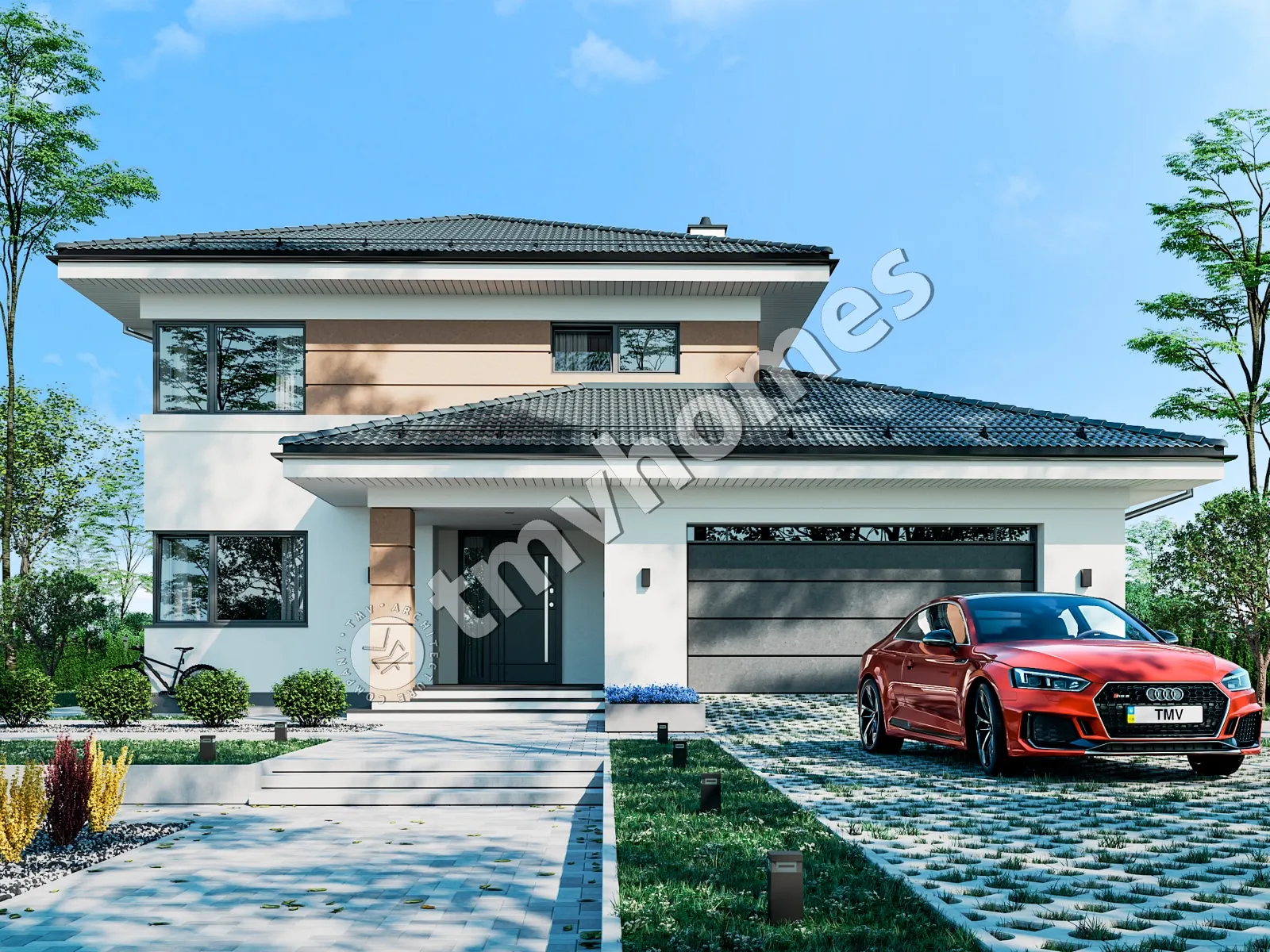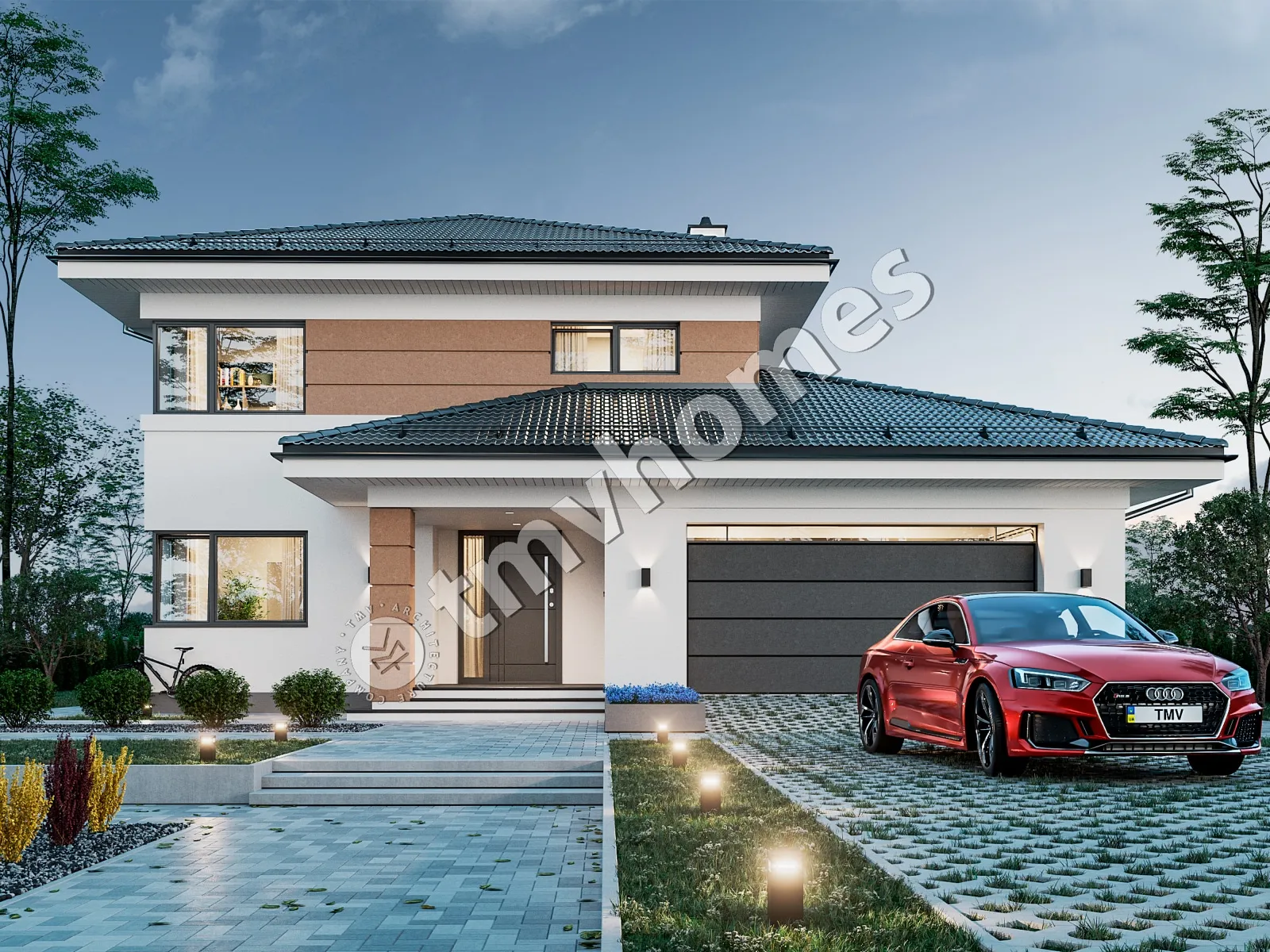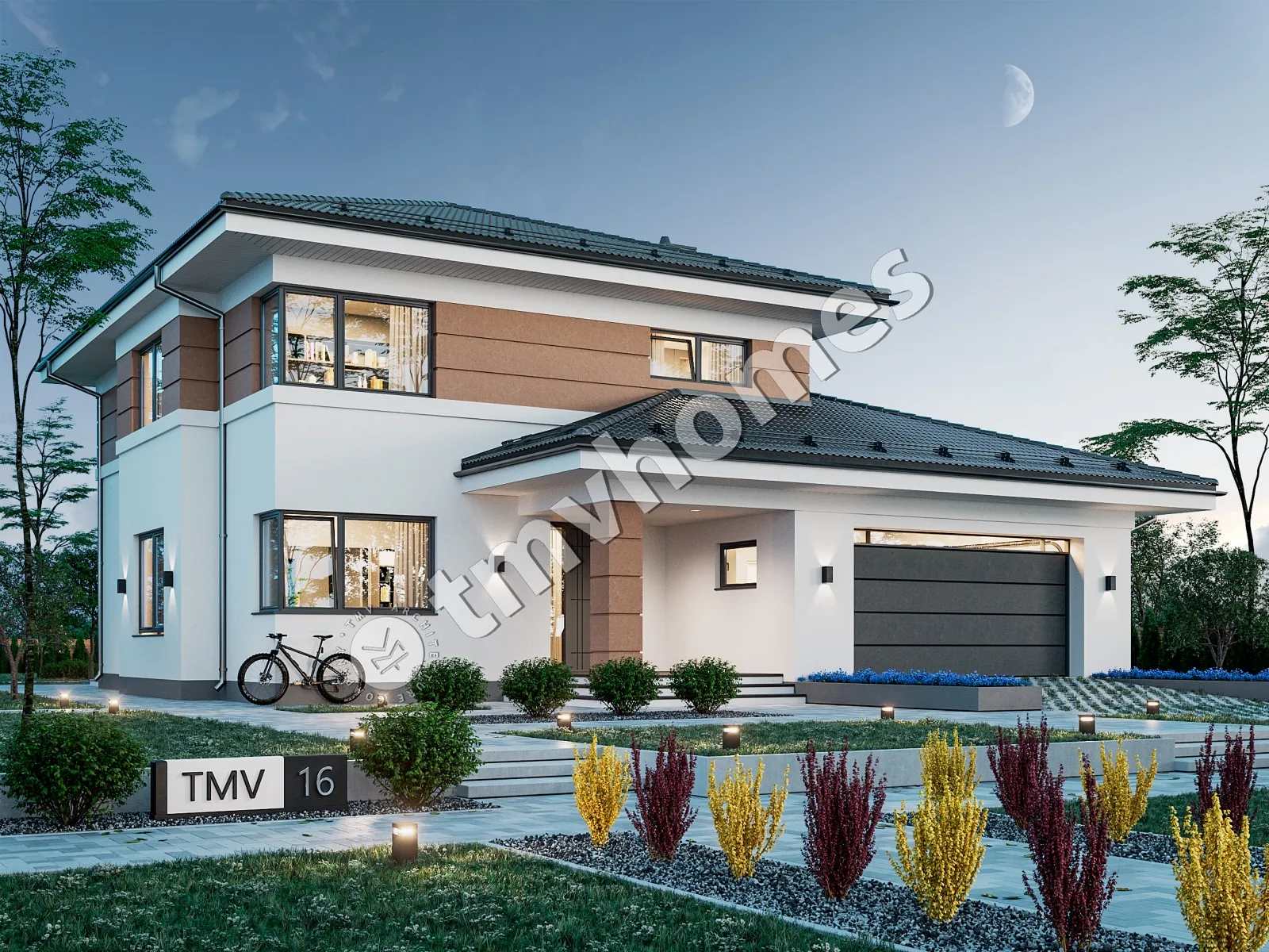 Project TMV 16 - a two-storey house with a terrace, balcony and a garage for 2 cars. Composition of the premises: entrance hall, hall, kitchen-dining room, living room, cabinet, 3 bedrooms, 3 bathrooms, dressing room, storage room, inventory room, boiler room.