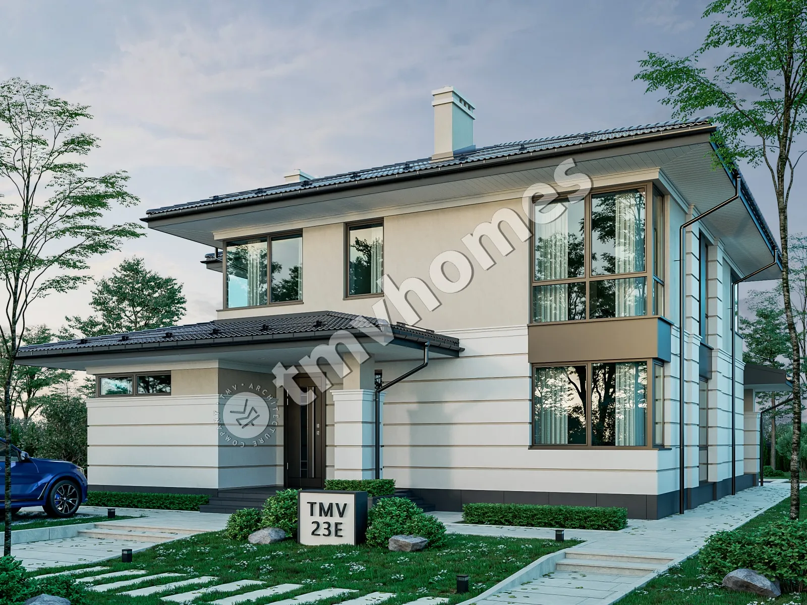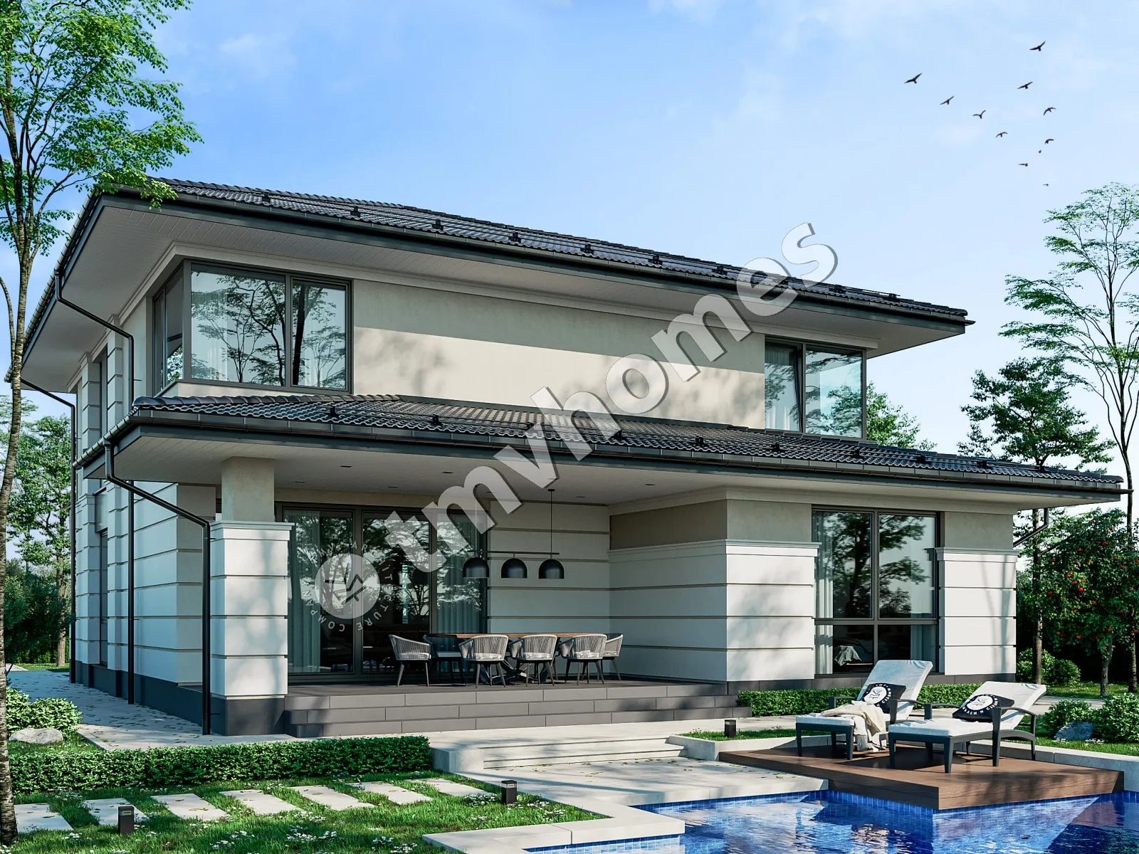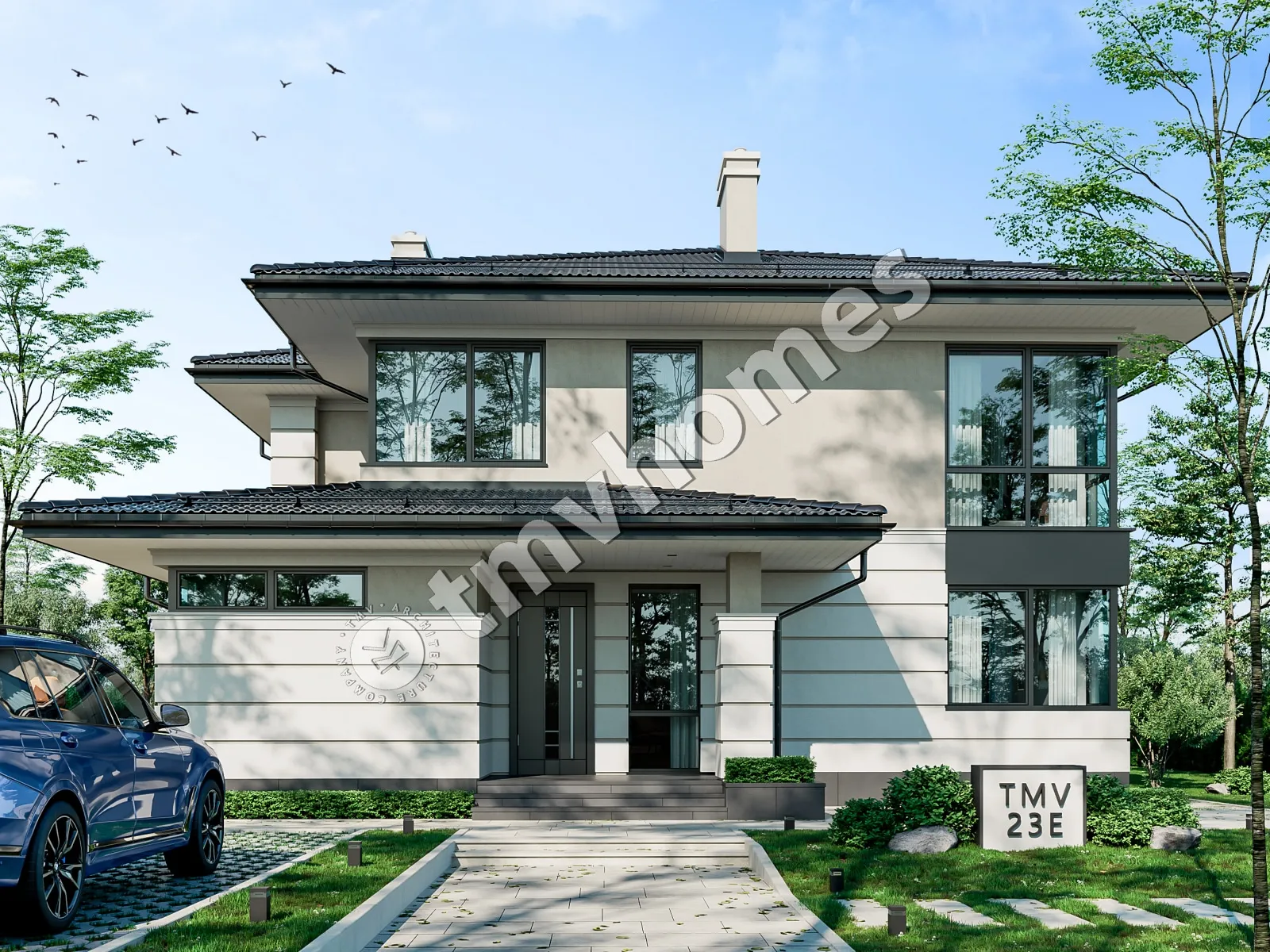 Project TMV 23E - a modern two-storey house in Wright style with a terrace. Composition of the premises: entrance hall, hall, living room, kitchen-dining room, cabinet, 4 bedrooms, 3 bathrooms, laundry room, dressing room, boiler room.