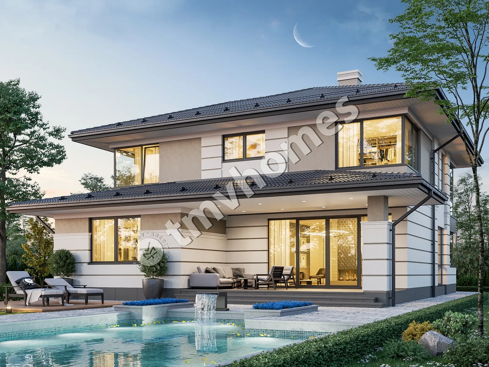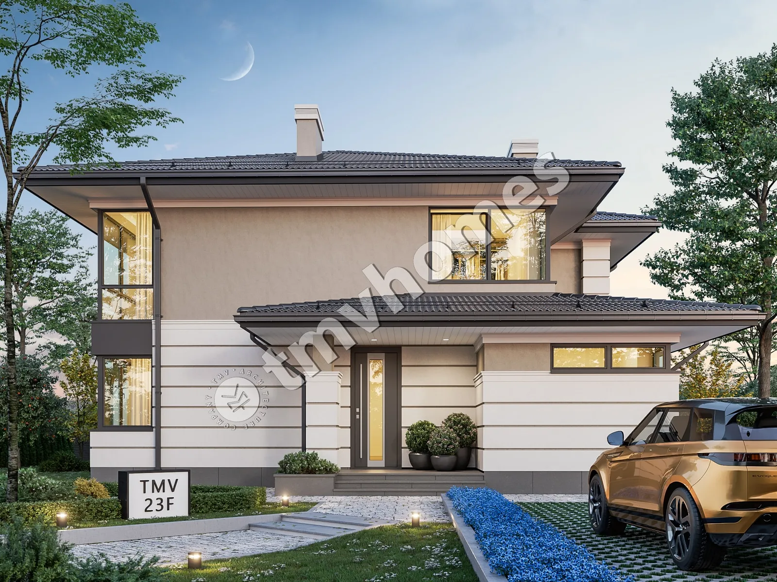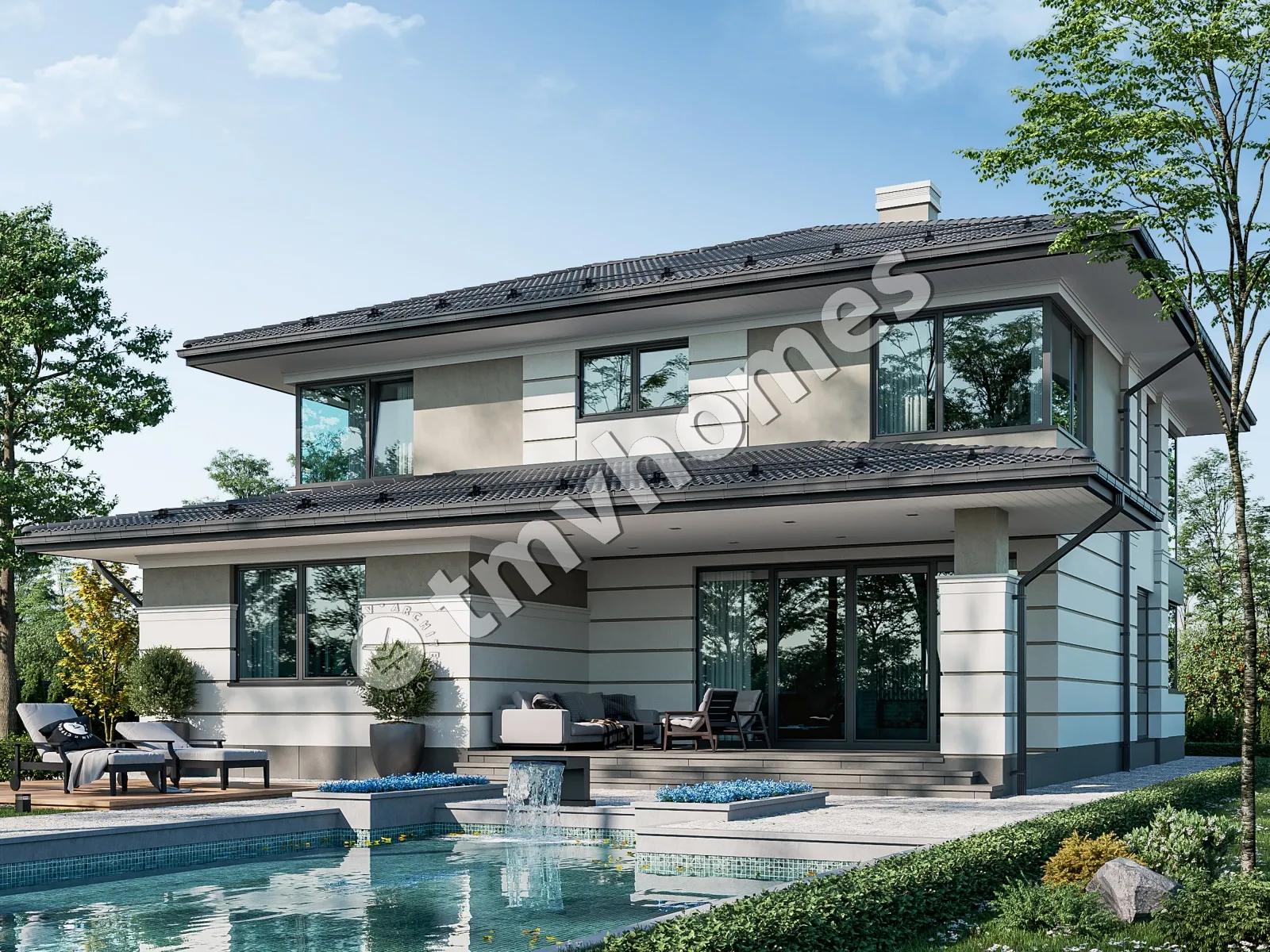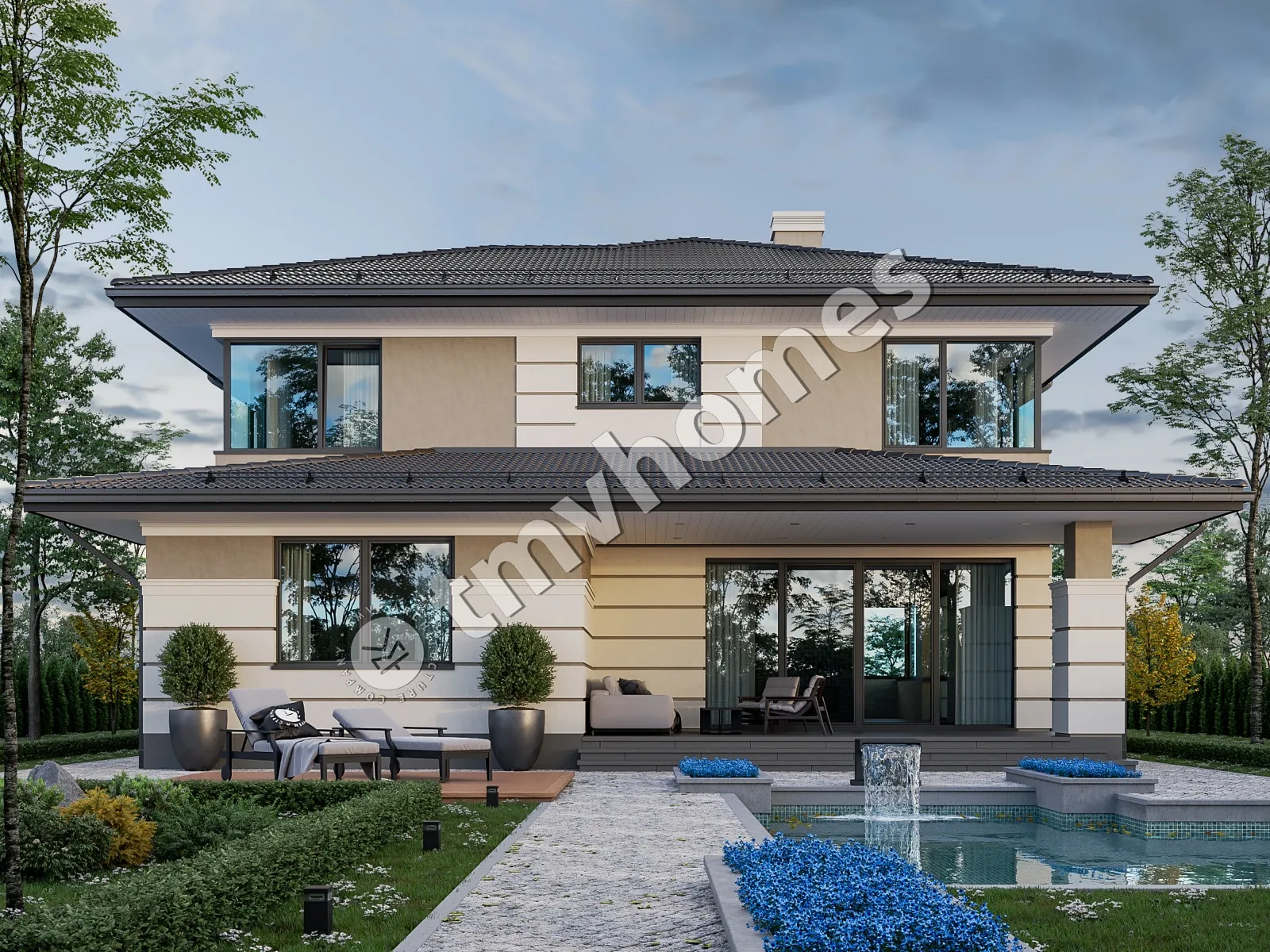 Project TMV 23F - a modern two-storey house in Wright style with a terrace. Composition of the premises: entrance hall, hall, living room, kitchen-dining room, cabinet, 4 bedrooms, 3 bathrooms, laundry room, dressing room, storage room, boiler room.