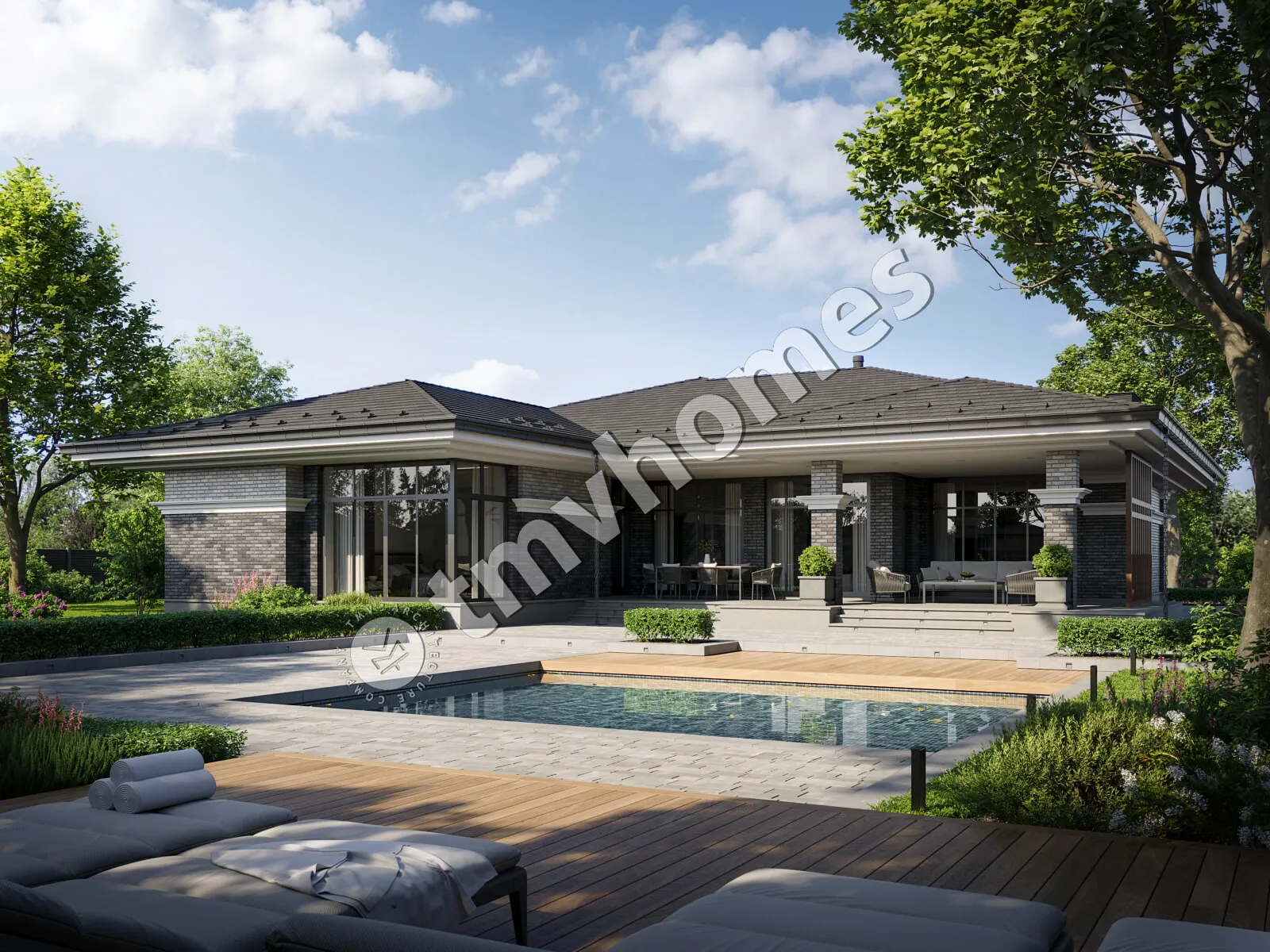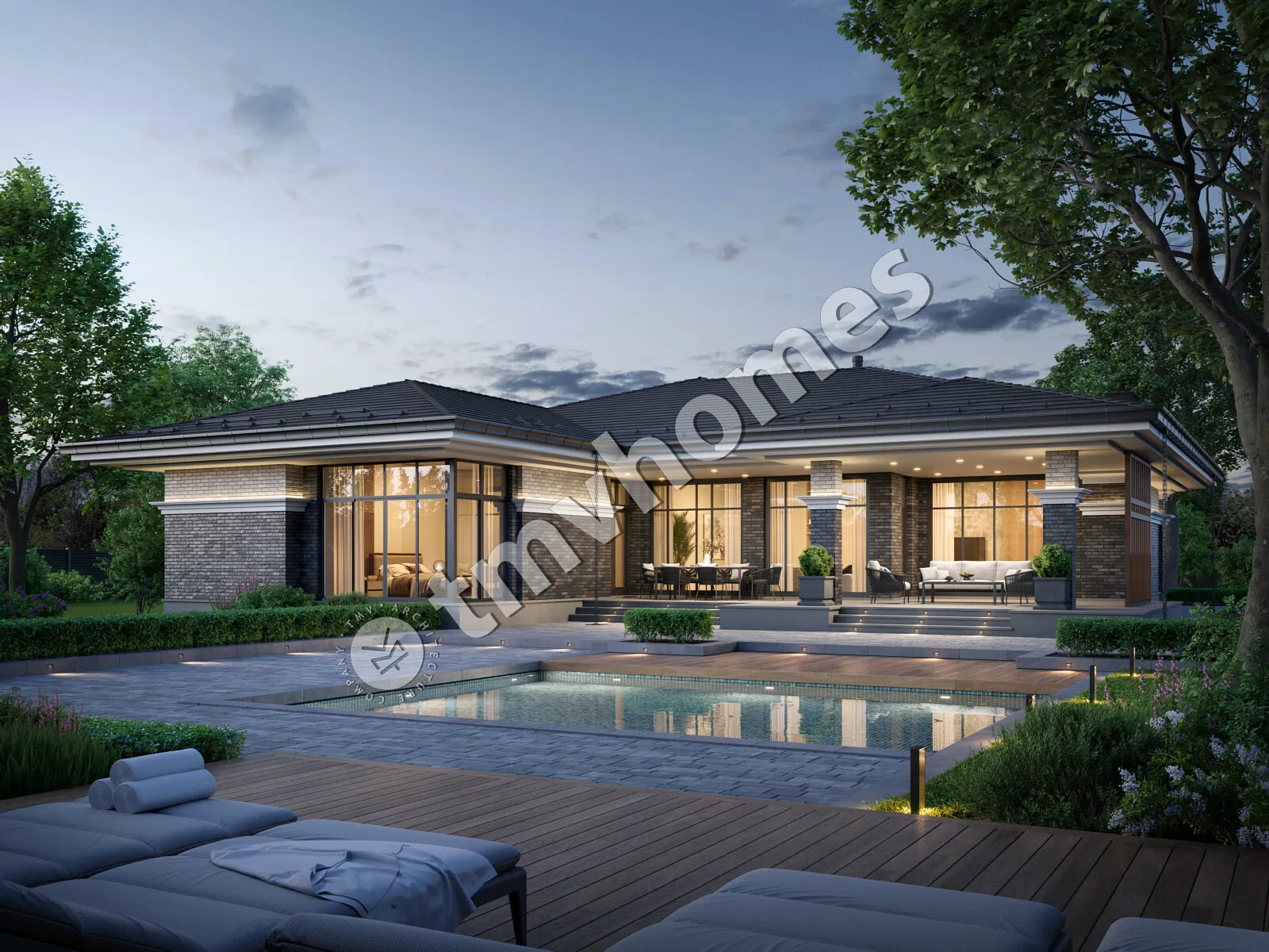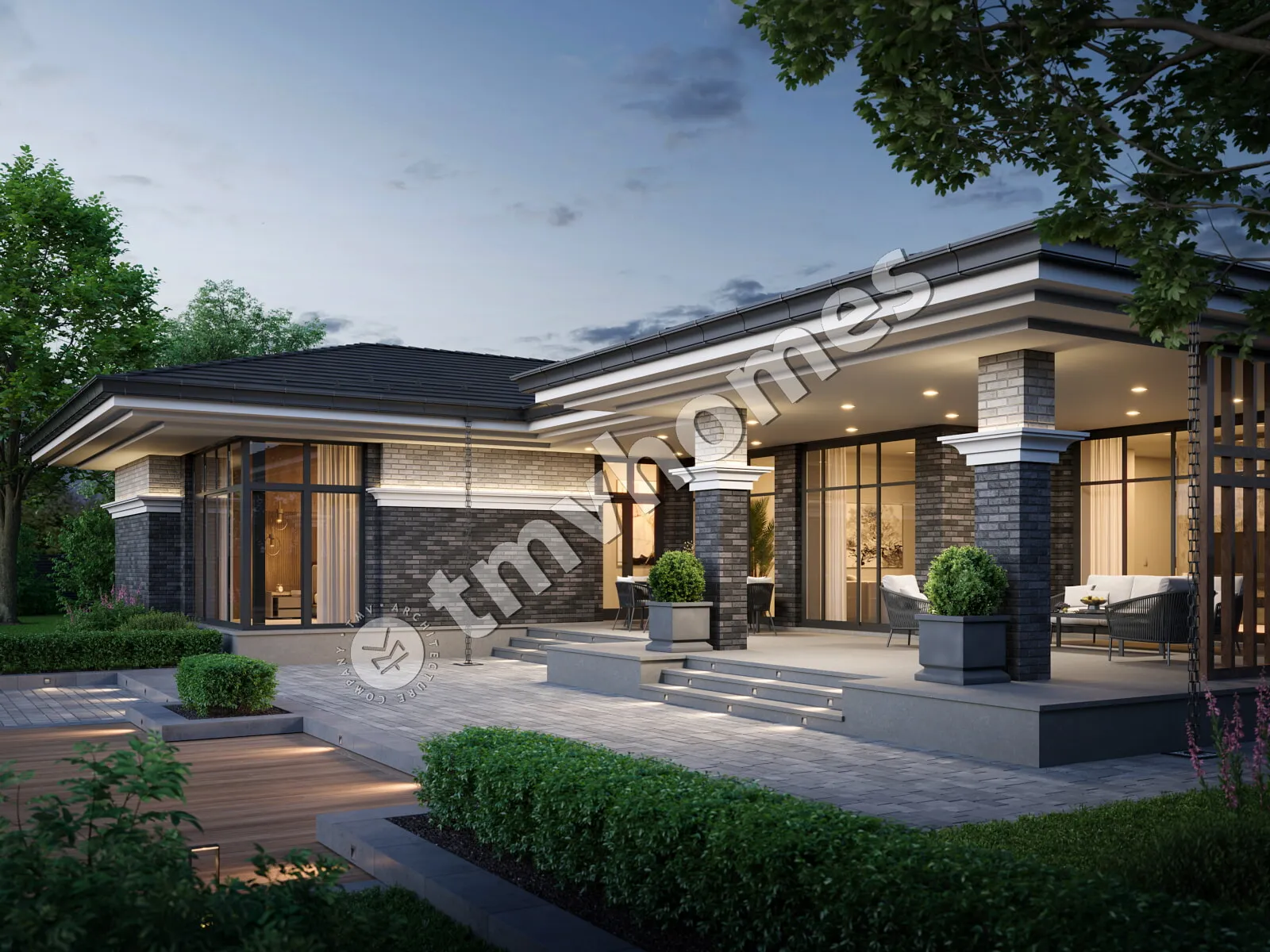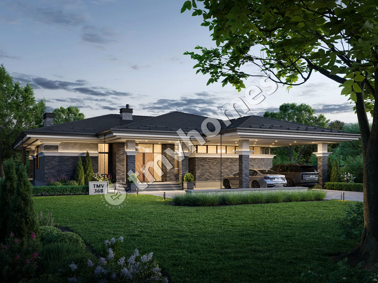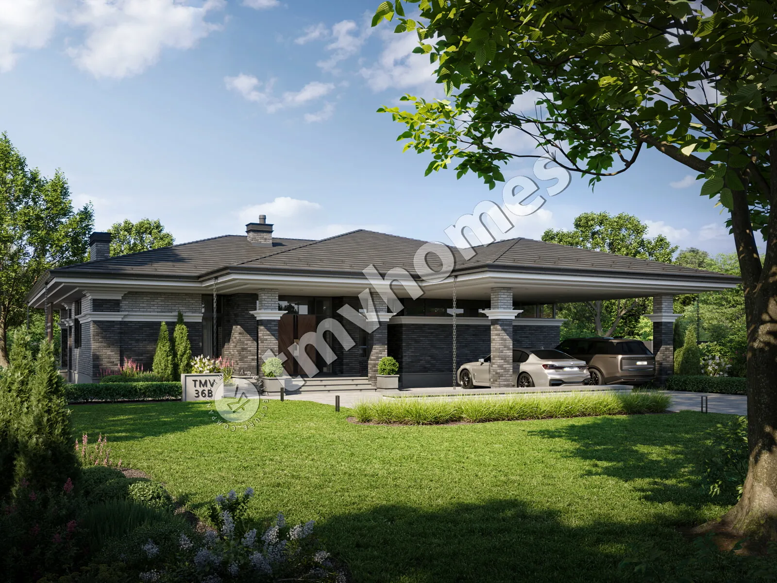 Project TMV 36B - a modern one-storey house in Wright style with panoramic windows, spacious terrace and carport for 2 cars. Composition of the premises: entrance hall, living room, kitchen-dining room, 3 bedrooms, 3 bathrooms, dressing room, storage room, boiler room.