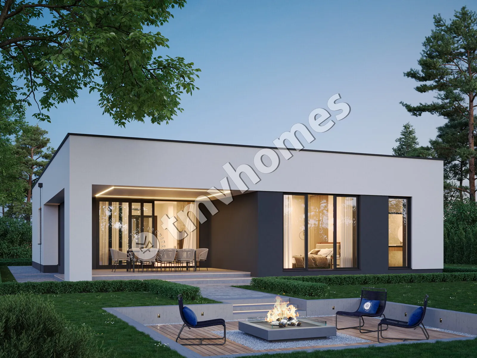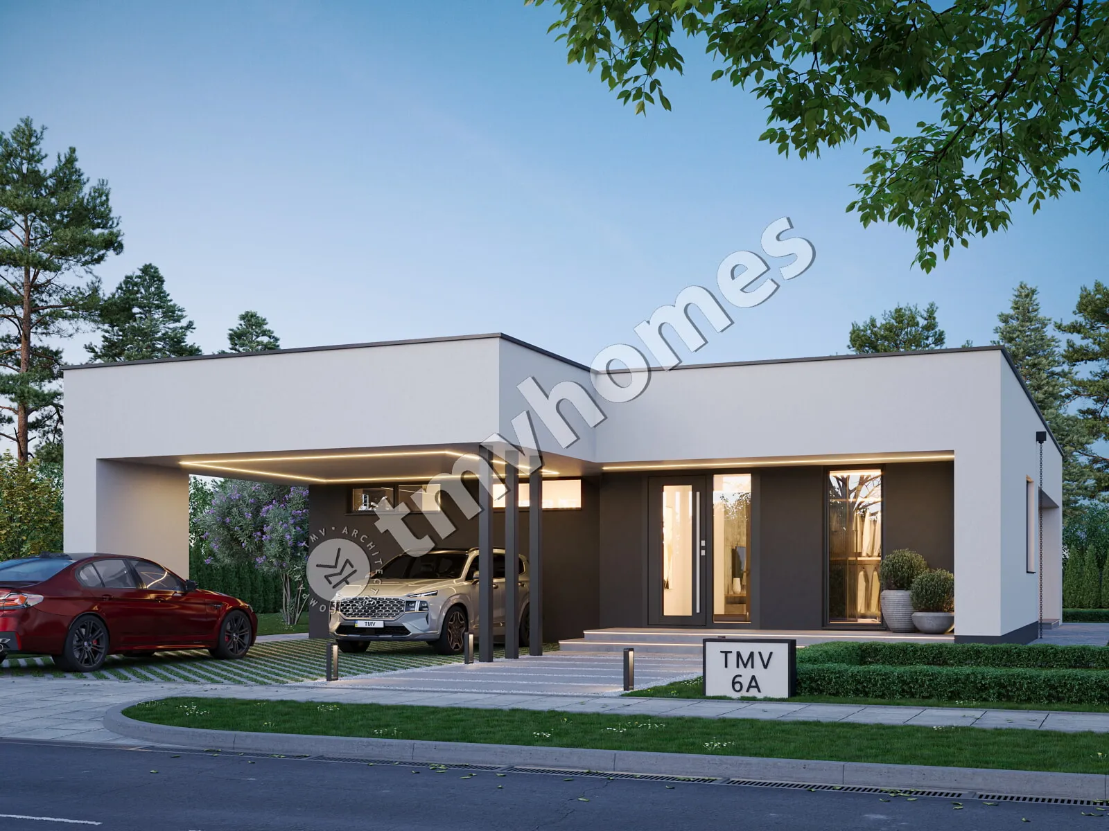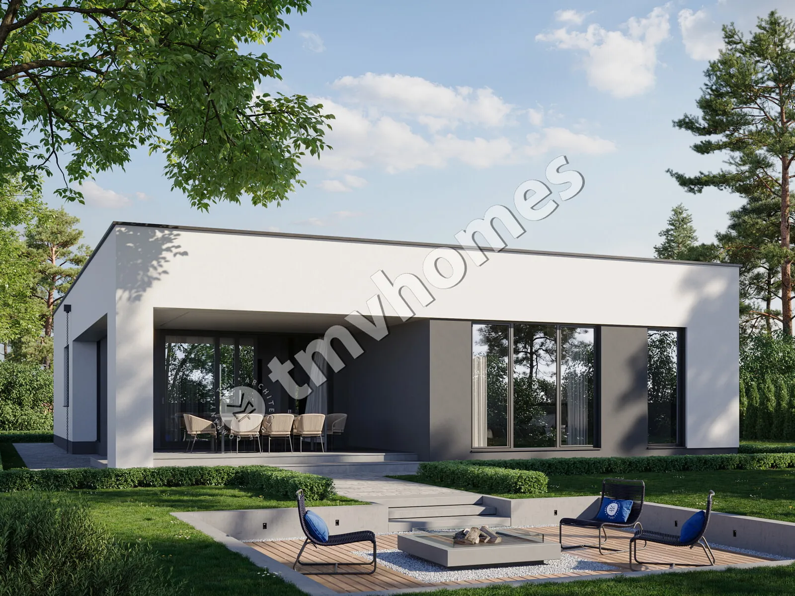 Project TMV 6A - a modern one-storey house with a flat roof, a terrace and a carport for 2 cars. Composition of the premises: entrance hall, living room, kitchen-dining room, 3 bedrooms, 2 bathrooms, dressing room, boiler room.