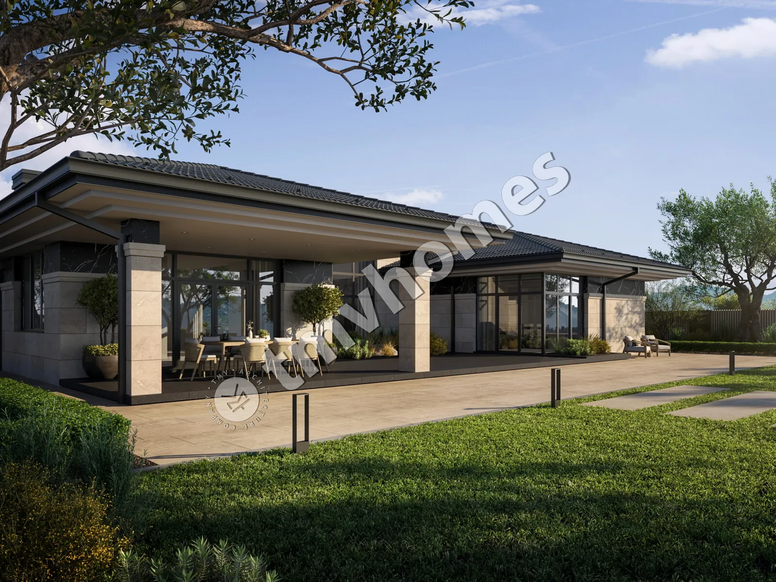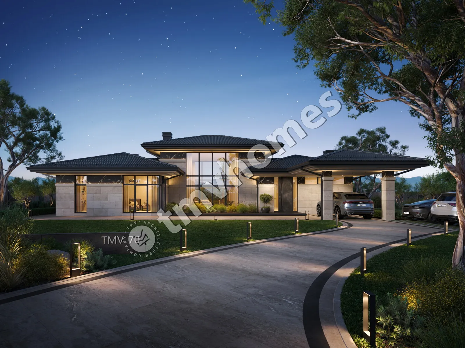 Project TMV 70 - one-storey house in the mediterranean style with a second light, a terrace and a carport for 1 car. Composition of the premises: entrance hall, hall, living room, kitchen, 3 bedrooms, 3 bathrooms, dressing room, storage room, boiler room.