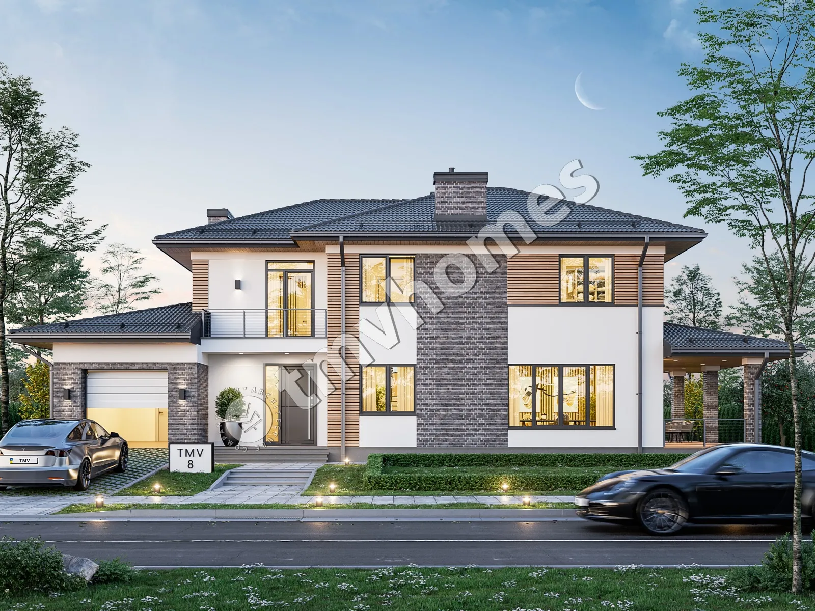 Project TMV 8 - a two-storey house for a narrow plot with a side terrace, balcony and a garage for 1 car. Composition of the premises: entrance hall, hall, kitchen-dining room, living room, cabinet, 3 bedrooms, 2 bathrooms, laundry room, dressing room, boiler room.