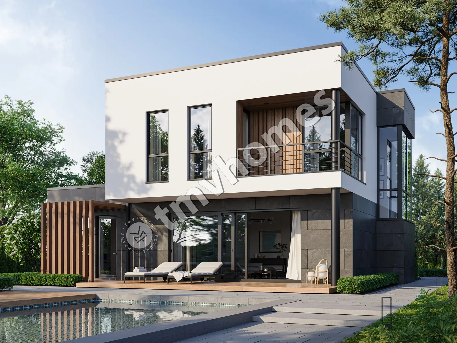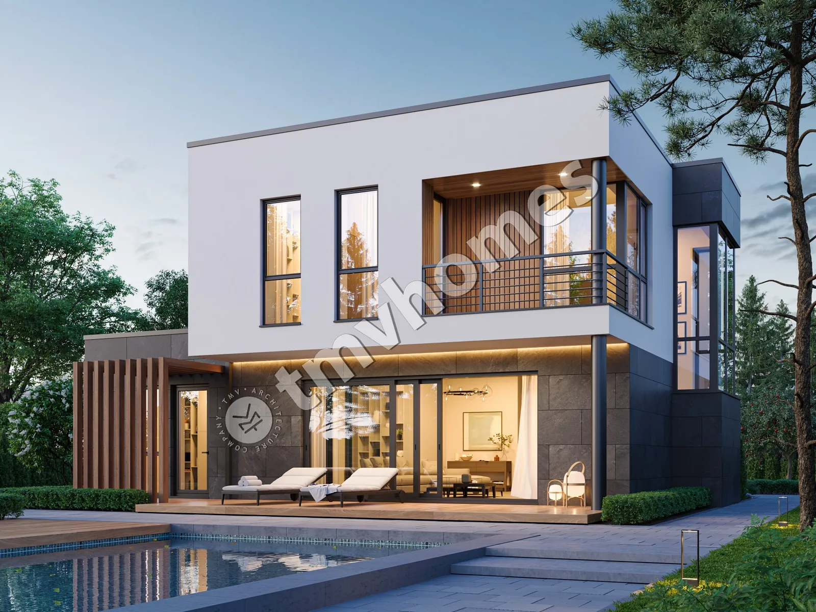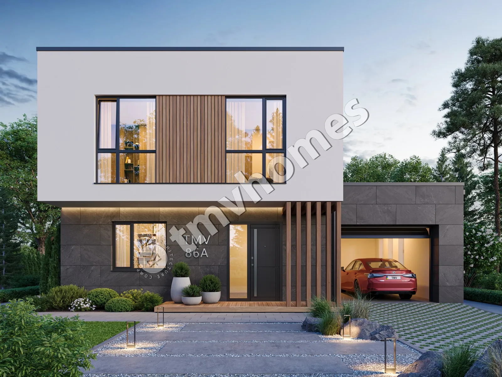 Project TMV 86A - a modern two-storey high-tech house with flat roof, terrace, balcony and garage for 1 car. Composition of the premises: entrance hall, hall, living room, kitchen-dining room, 3 bedrooms, 3 bathrooms, dressing room, boiler room.