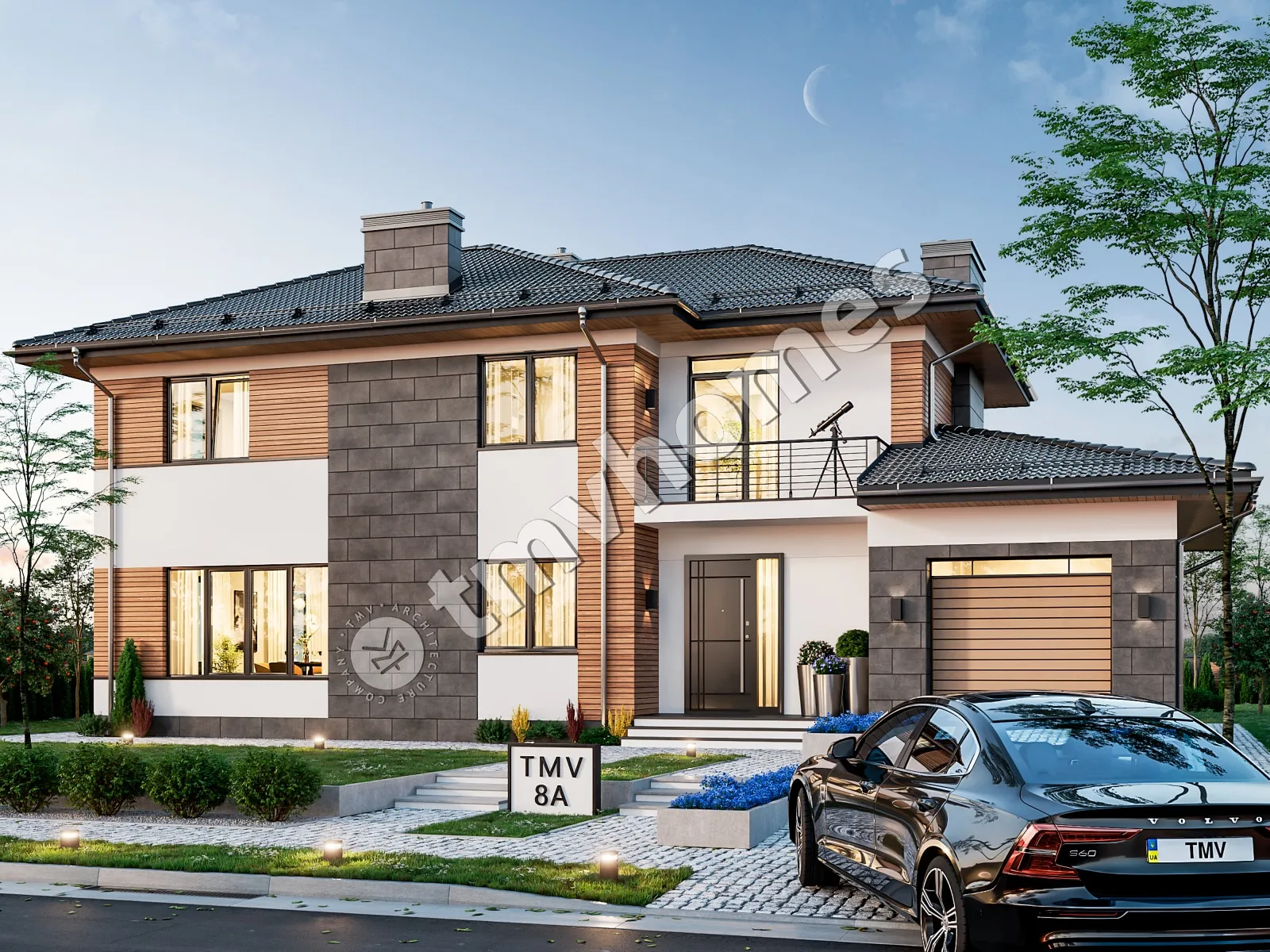Project TMV 8A - a two-storey house for a narrow plot with a terrace, balcony and garage for 1 car. Composition of the premises: entrance hall, hall, kitchen-dining room, living room, cabinet, 3 bedrooms, 2 bathrooms, dressing room, boiler room.