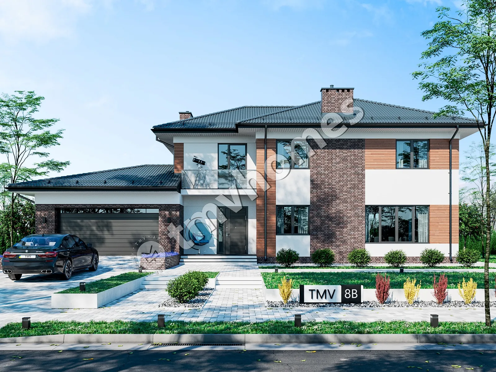 Project TMV 8B - a two-storey house for a narrow plot with a terrace, balcony and a garage for 2 cars. Composition of the premises: entrance hall, hall, kitchen-dining room, living room, cabinet, 3 bedrooms, 2 bathrooms, dressing room, boiler room.