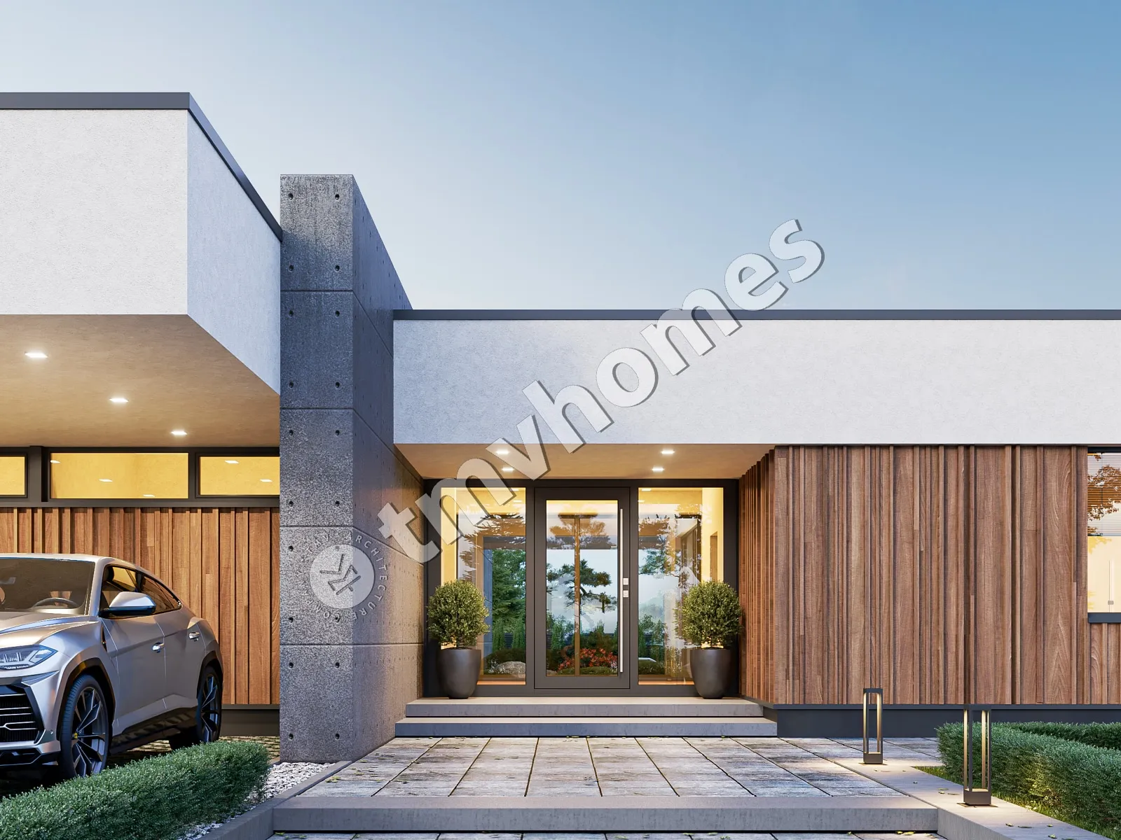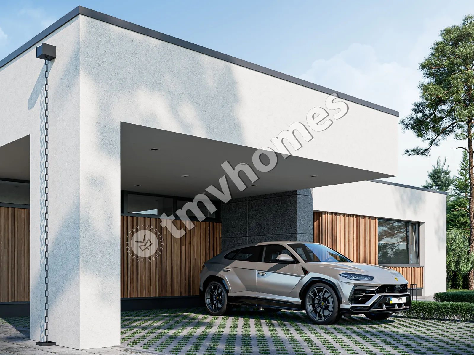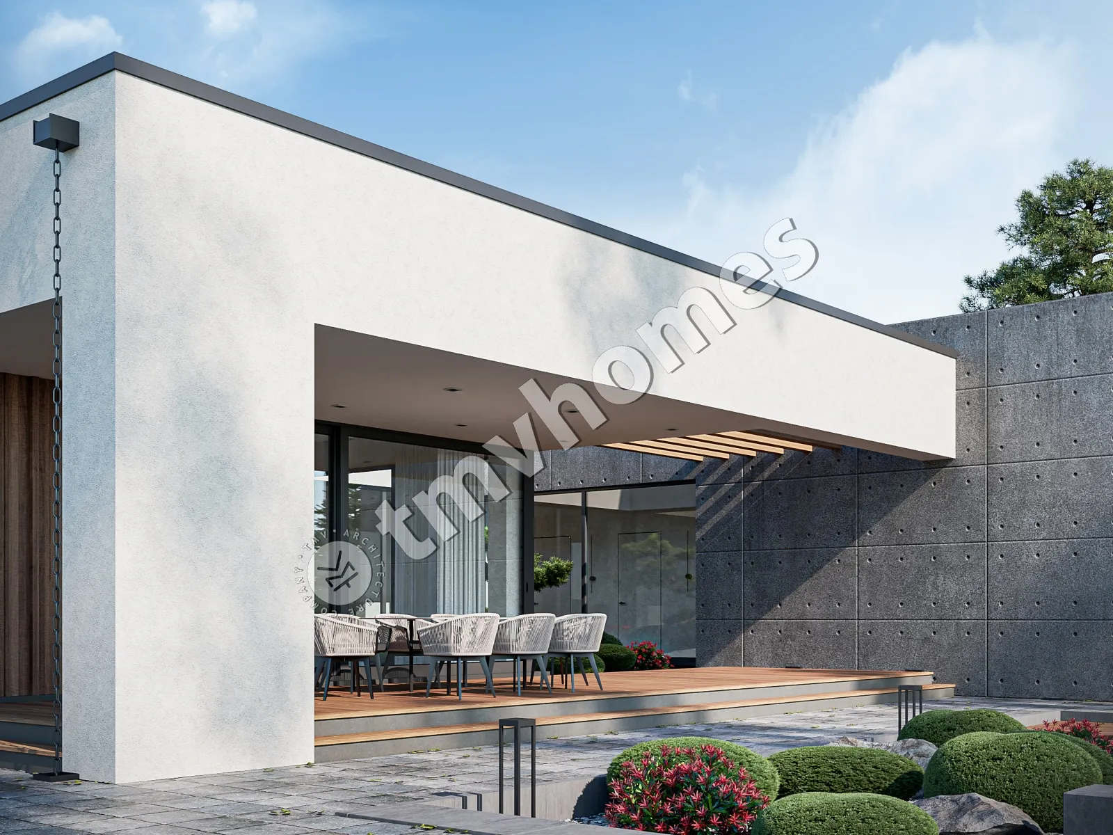 Project TMV 9 - a modern one-storey high-tech house with a flat roof, a terrace and a carport for 2 cars. Composition of the premises: hall, kitchen-dining room, living room, 3 bedrooms, 3 bathrooms, dressing room, storage room, boiler room.