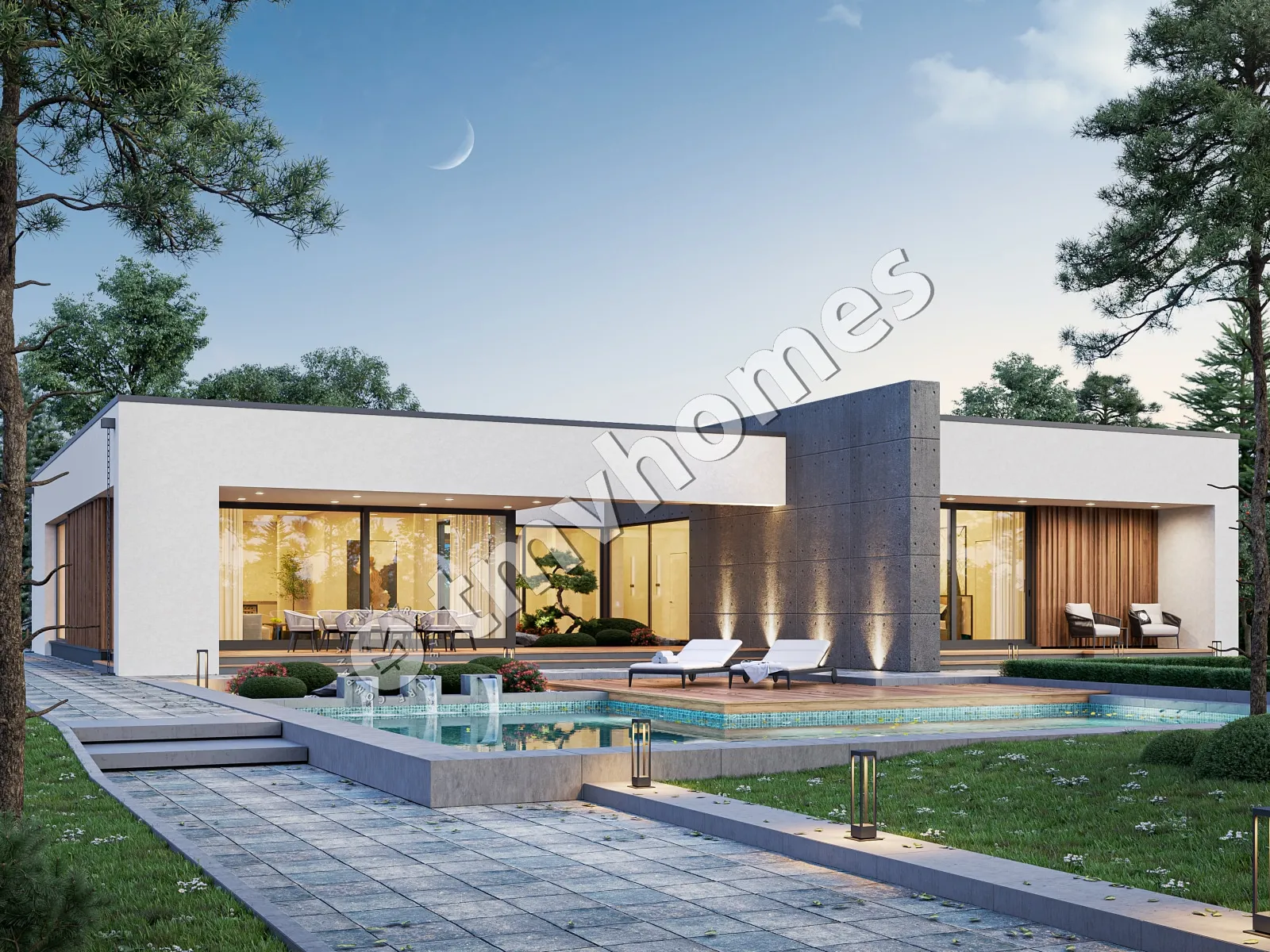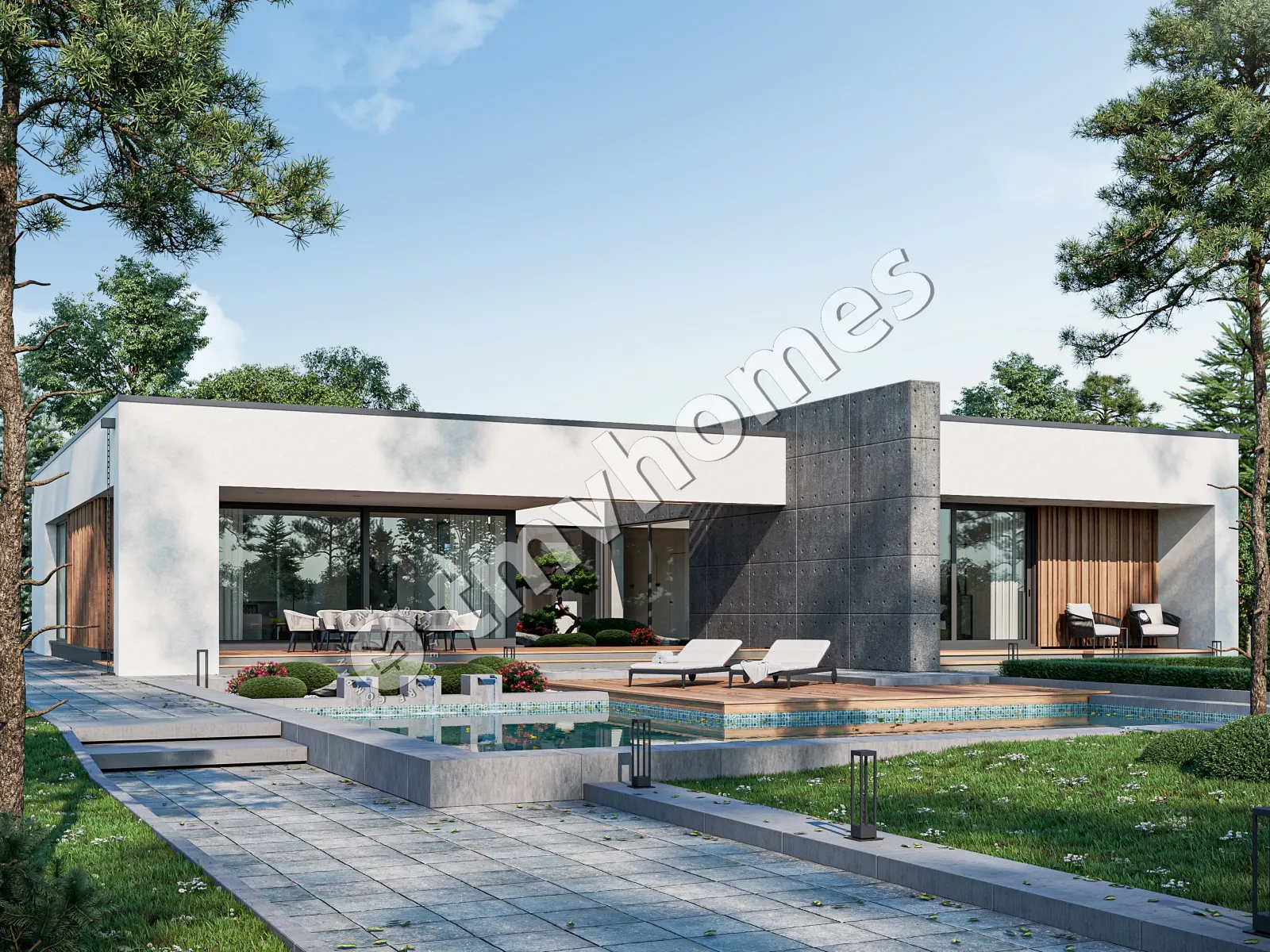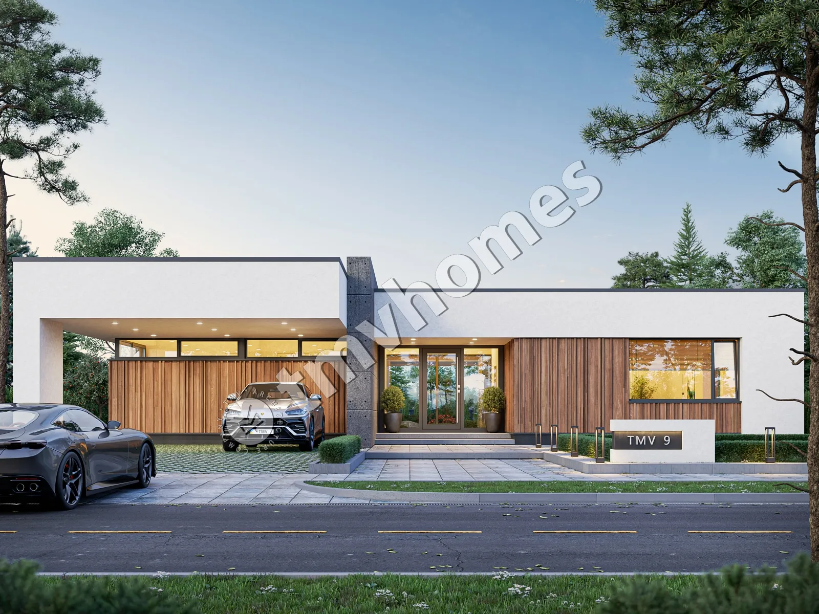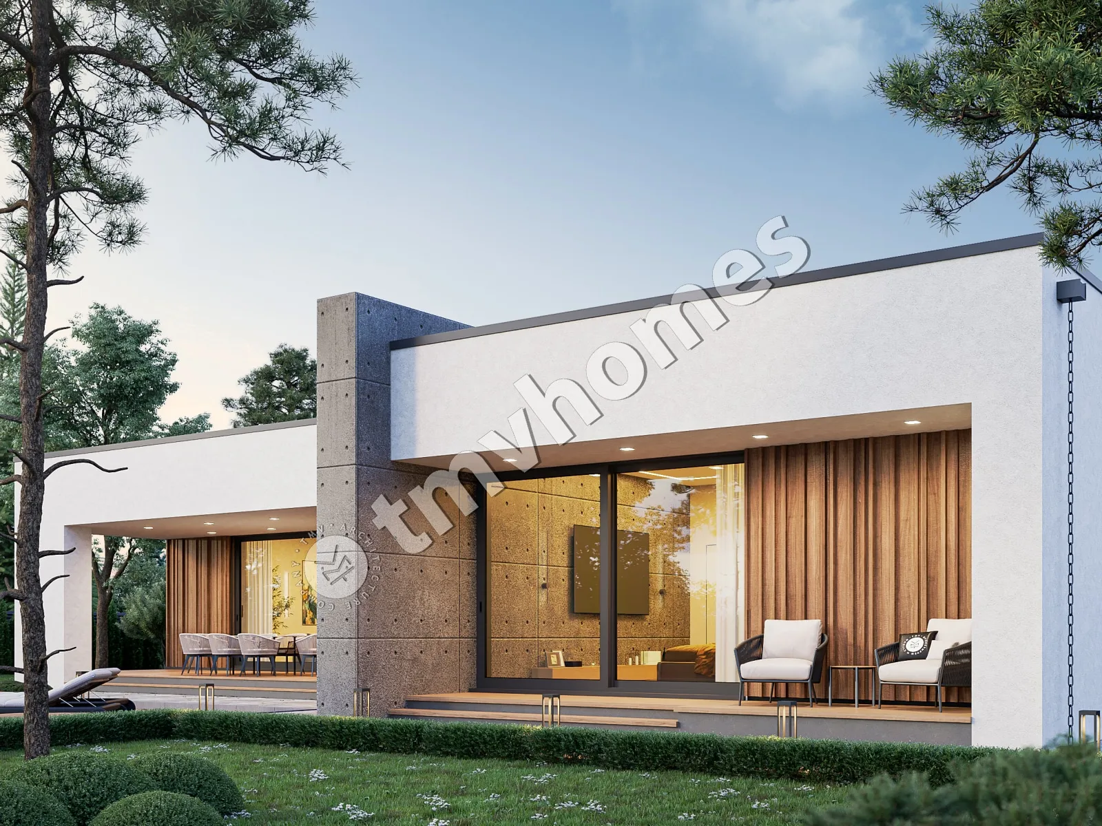 Project TMV 9 - a modern one-storey high-tech house with a flat roof, a terrace and a carport for 2 cars. Composition of the premises: hall, kitchen-dining room, living room, 3 bedrooms, 3 bathrooms, dressing room, storage room, boiler room.