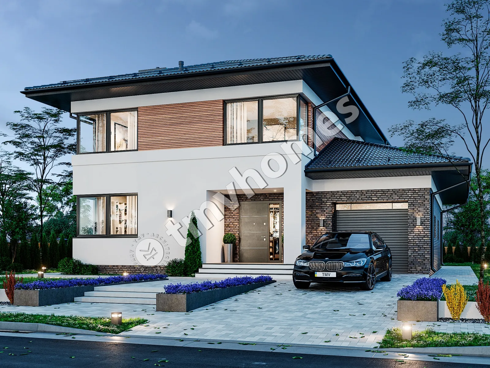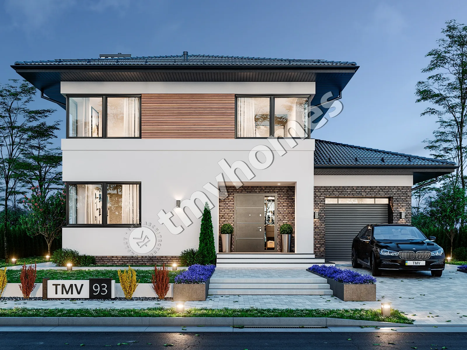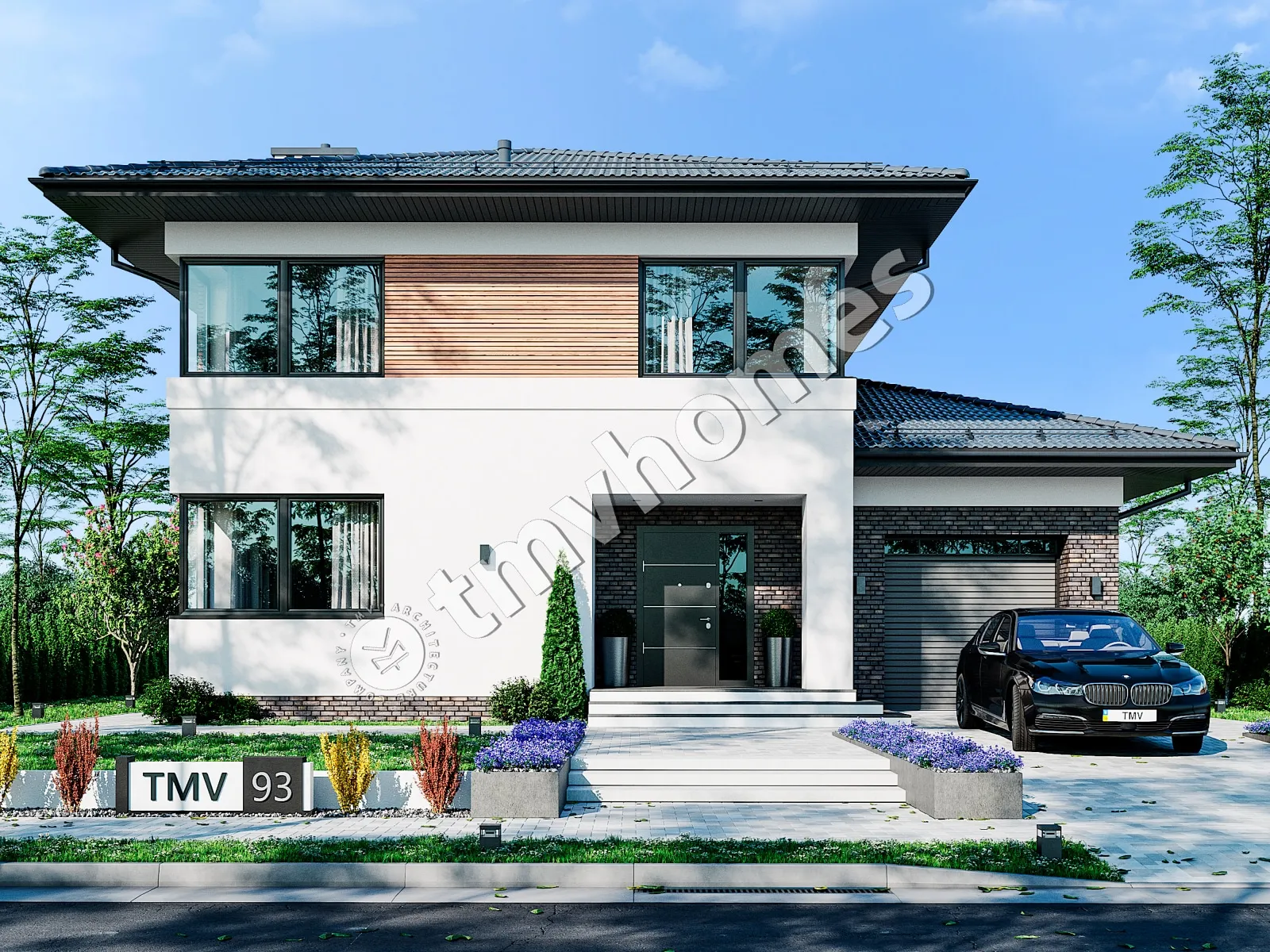 Project TMV 93 - a two-storey house with a terrace and a garage for 1 car. Composition of the premises: entrance hall, hall, kitchen-dining room, living room, 4 bedrooms, 3 bathrooms, laundry room, dressing room, storage room, boiler room.
