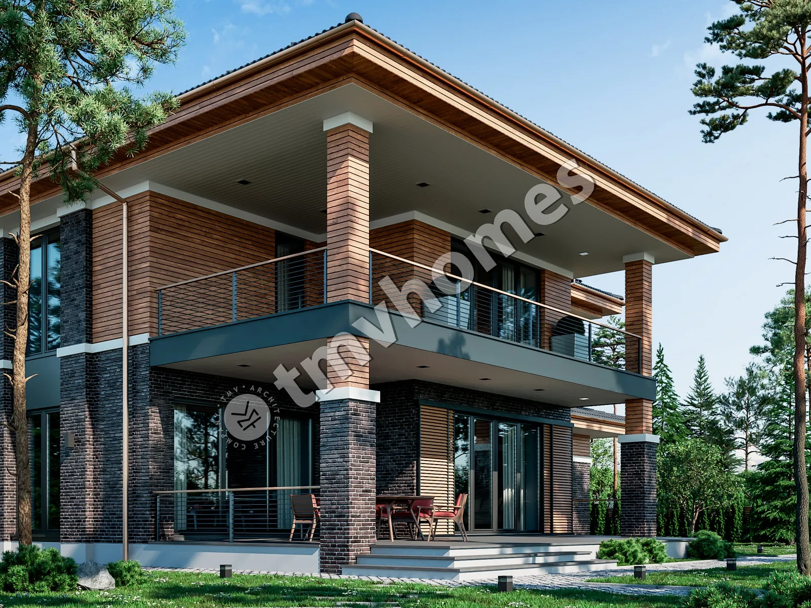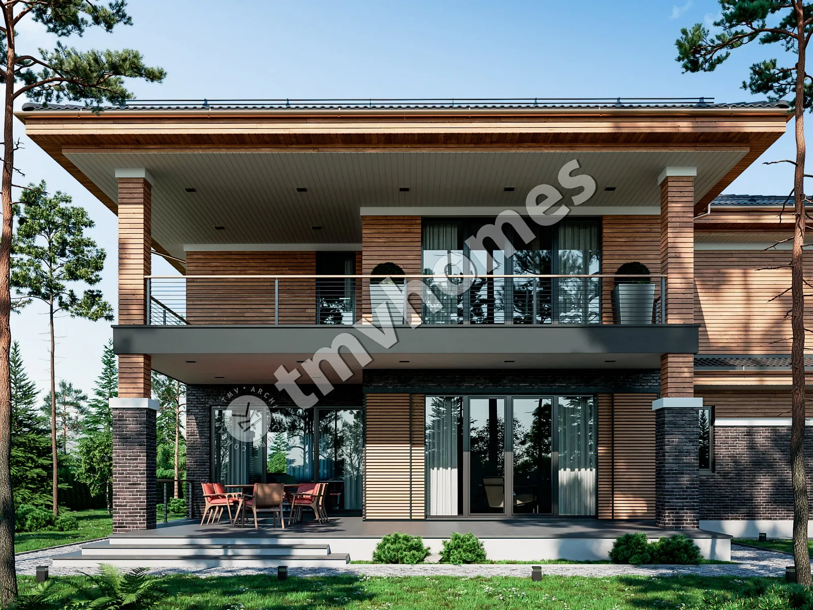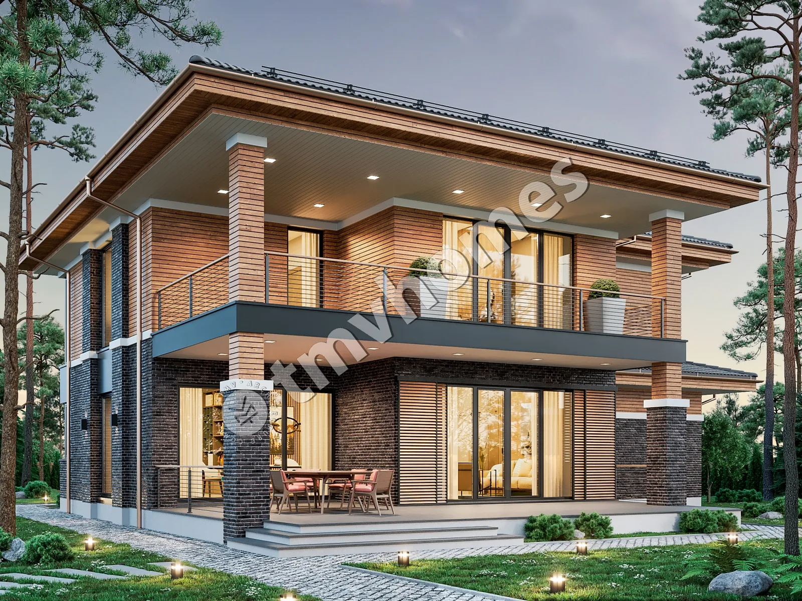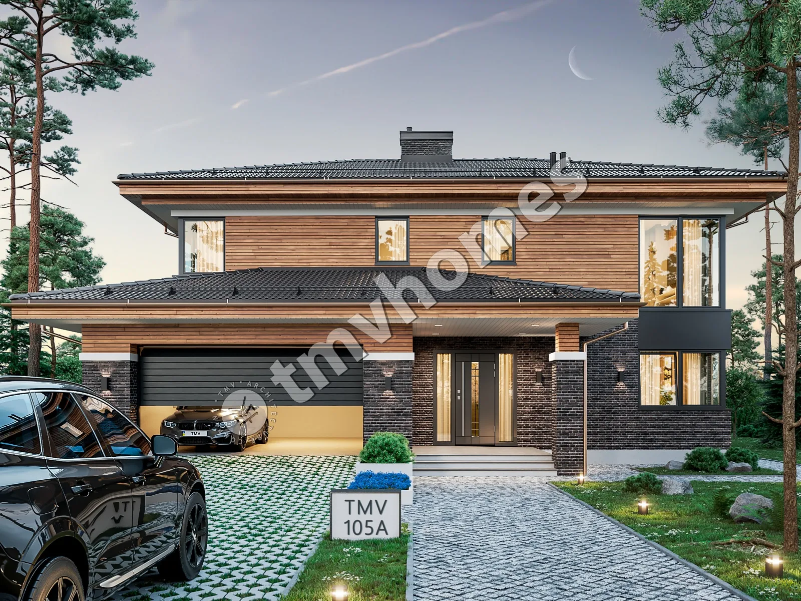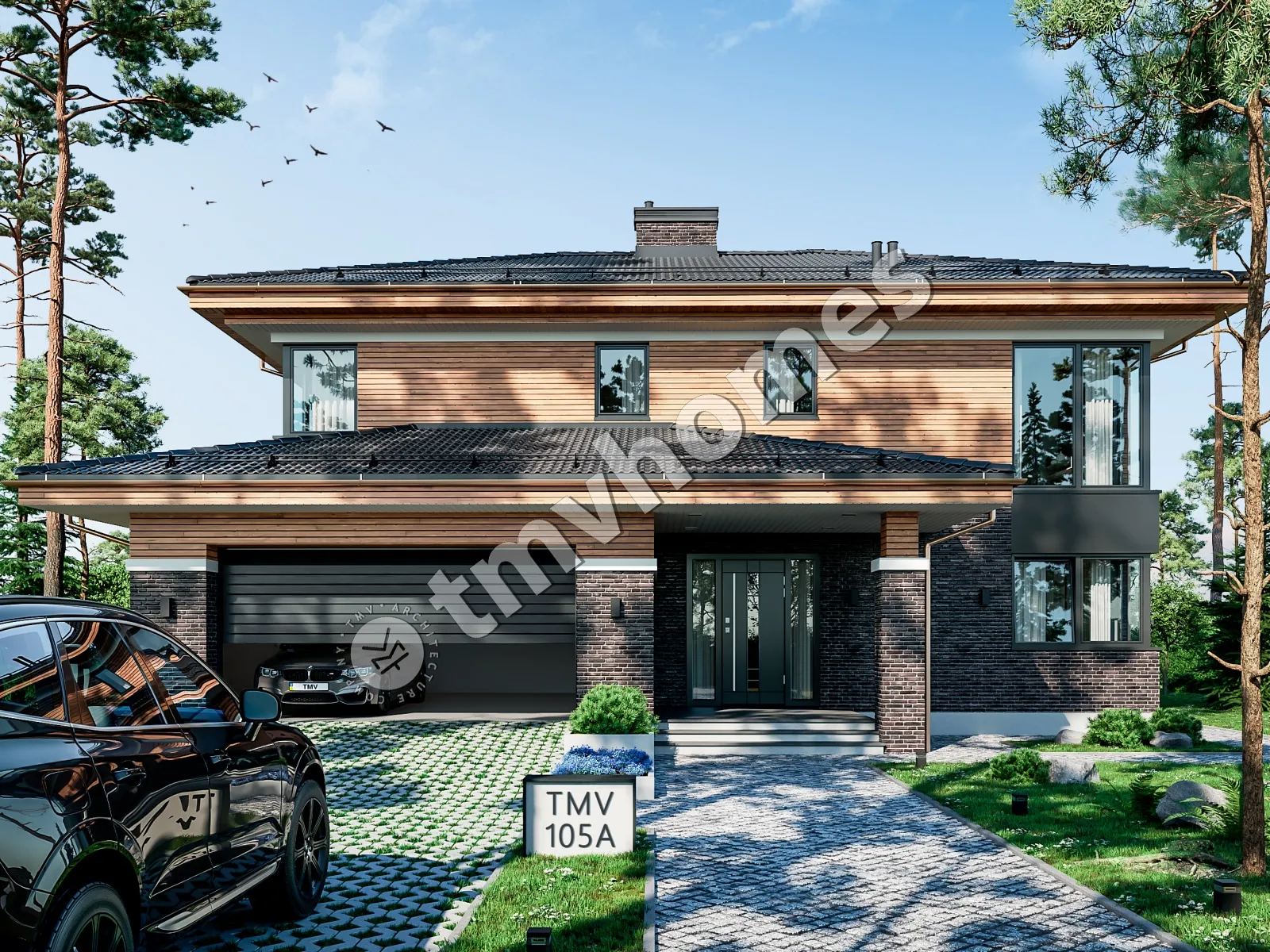 Проект TMV 105A - комфортный двухэтажный дом в стиле Райта с террасами и гаражом для 2 автомобилей. Состав помещений: прихожая, гостиная, кухня-столовая, 4 спальни, 3 санузла, гардеробная, кладовая, котельная.