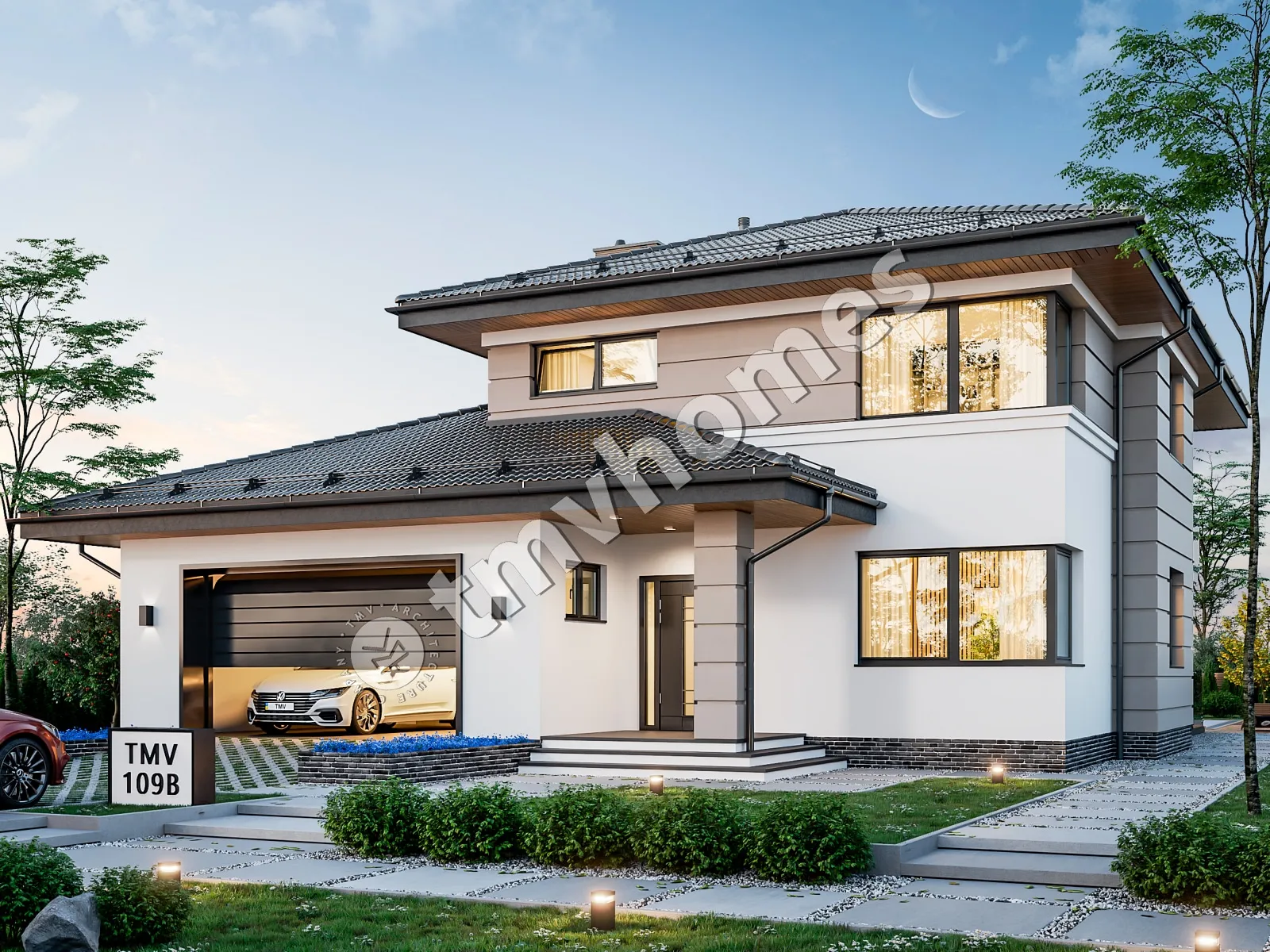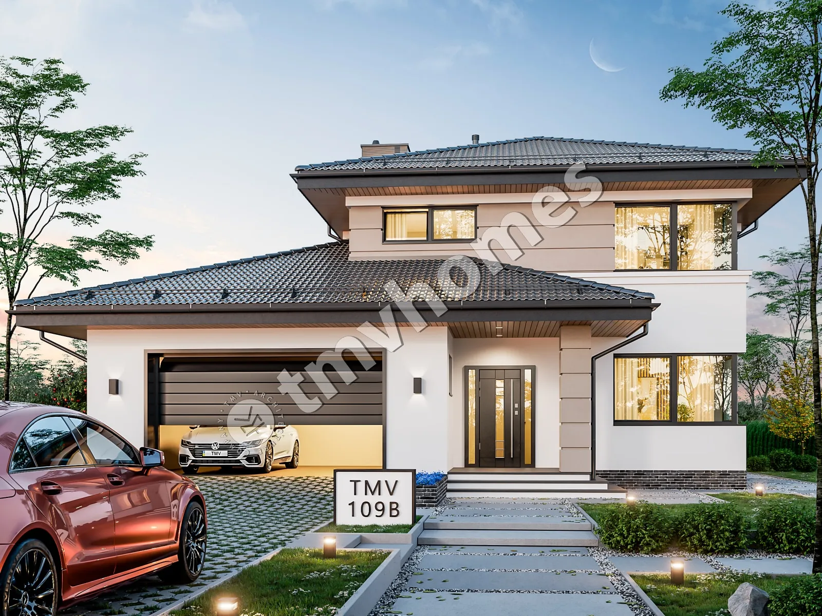 Проект TMV 109B - современный двухэтажный дом с террасой, балконом и гаражом для 2 автомобилей. Состав помещений: прихожая, гостиная, кухня-столовая, 4 спальни, 3 санузла, гардеробная, котельная.