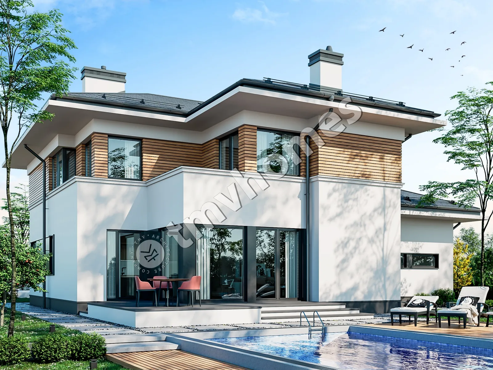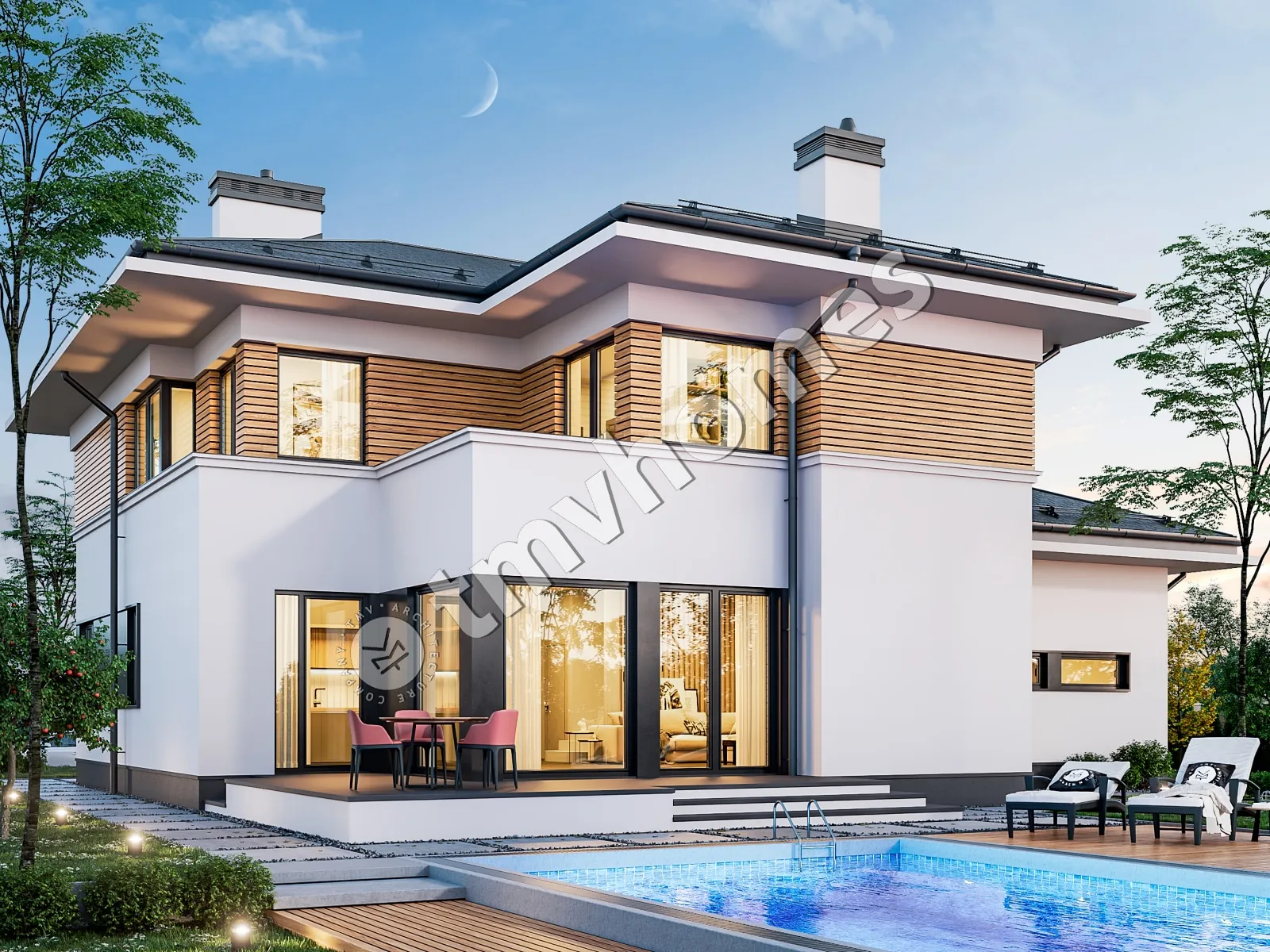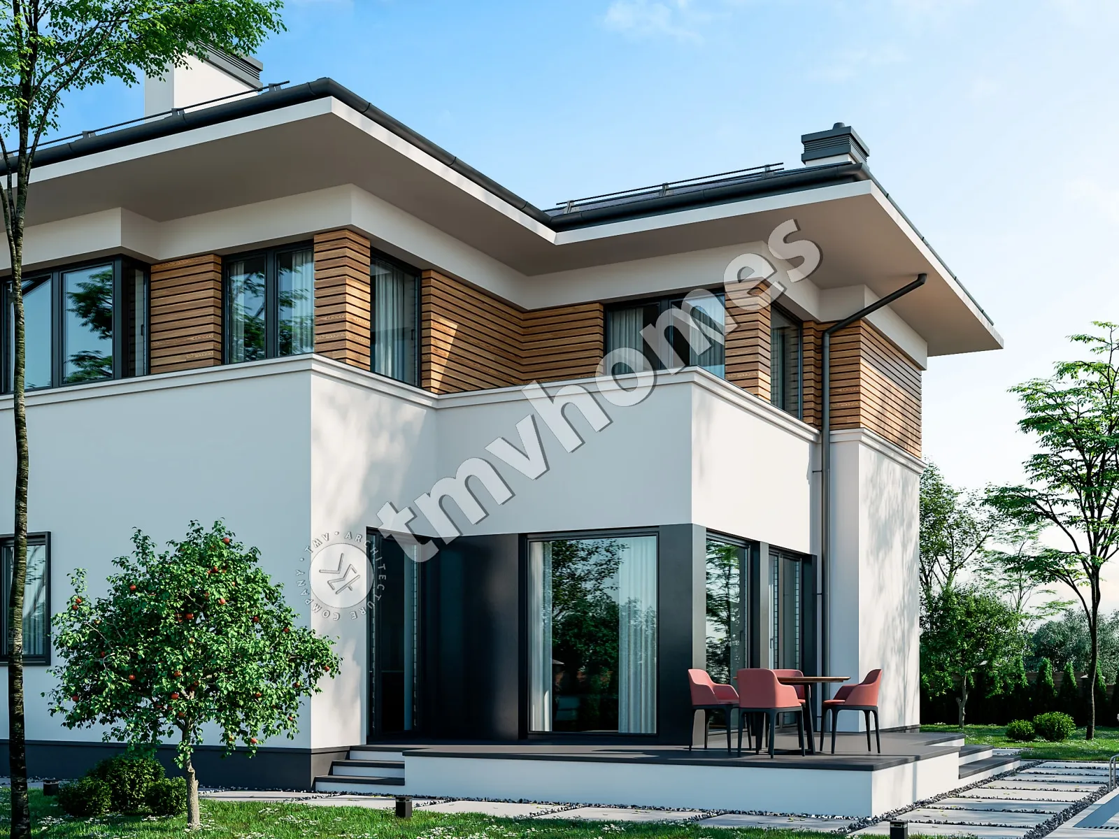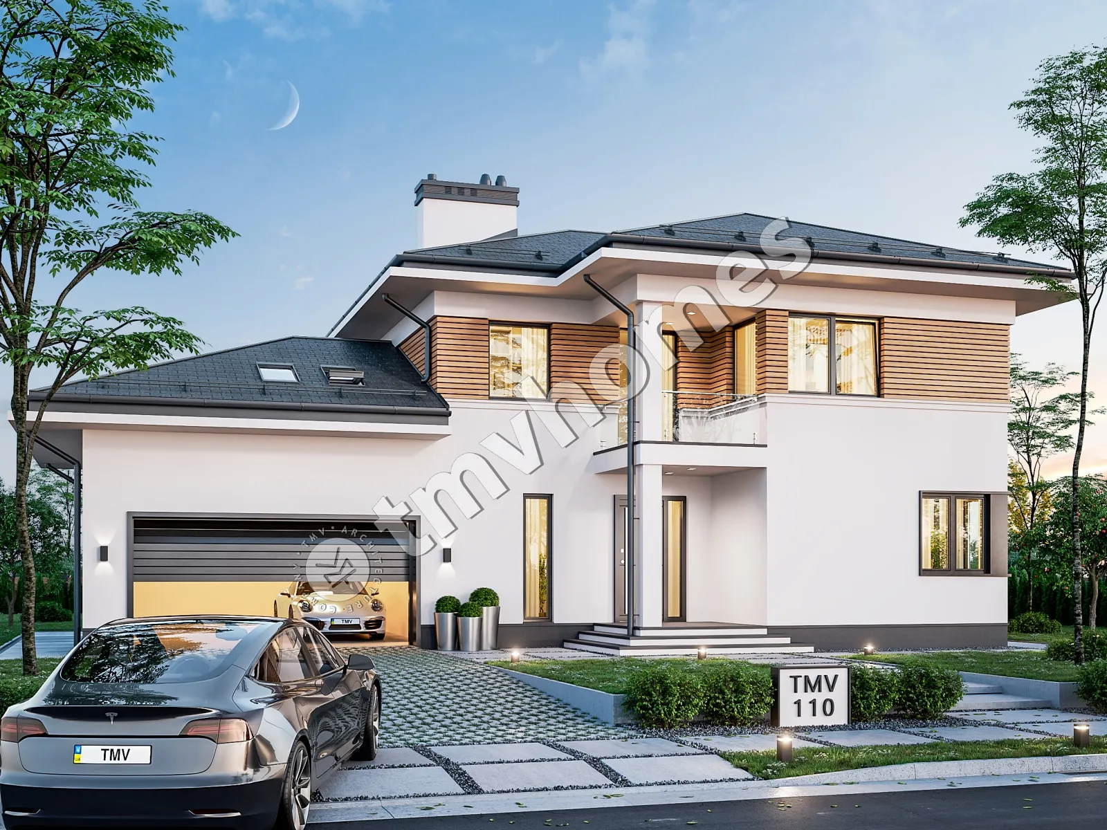 Проект TMV 110 - современный двухэтажный дом с террасой, балконом и гаражом для 2 автомобилей. Состав помещений: прихожая, холл, кухня-столовая, гостиная, кабинет, 3 спальни, 3 санузла, комната отдыха, гардеробная, кладовая, котельная.