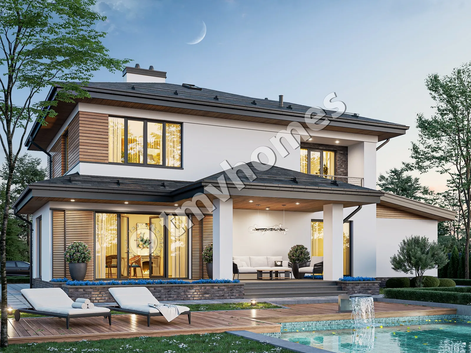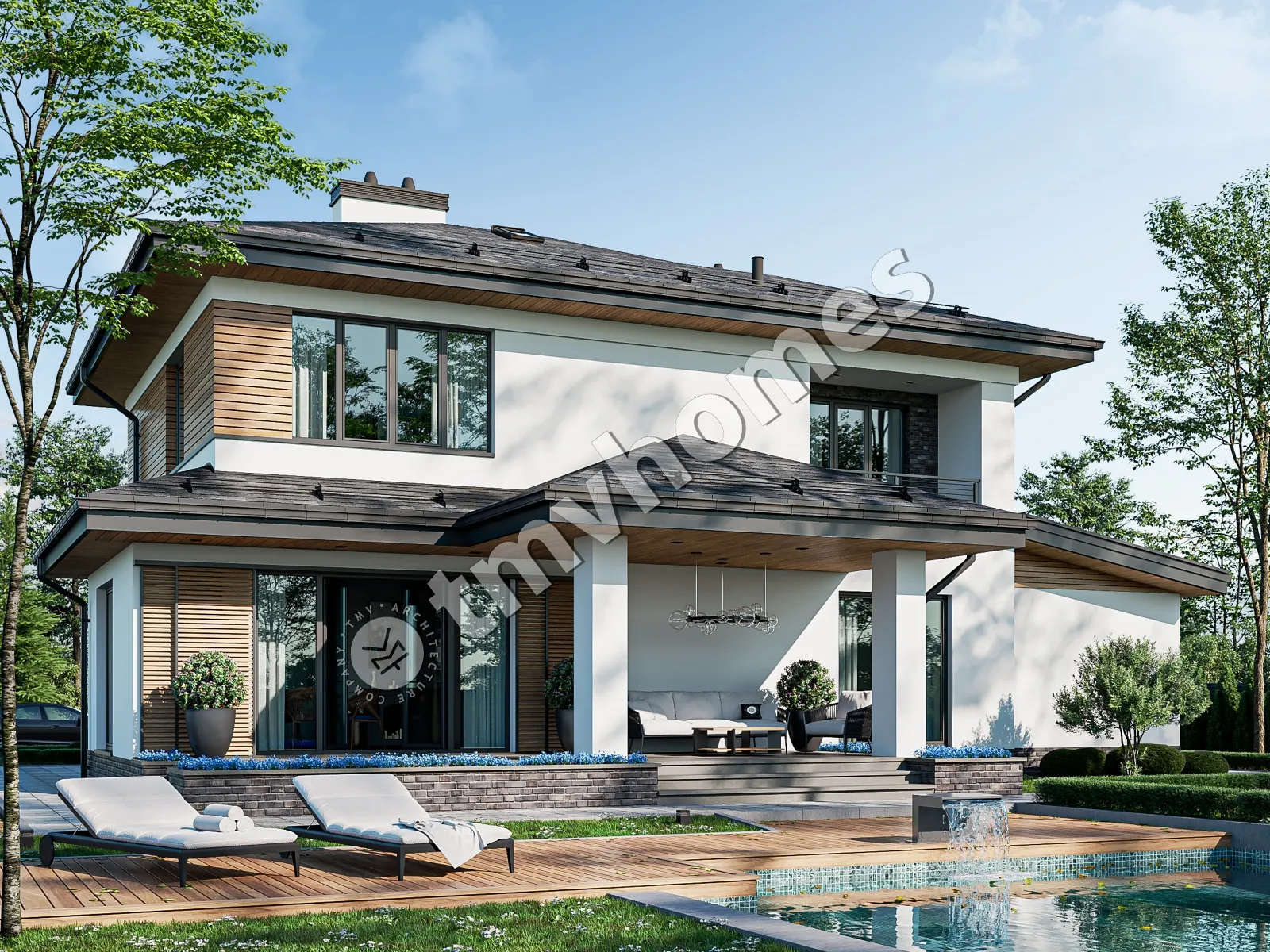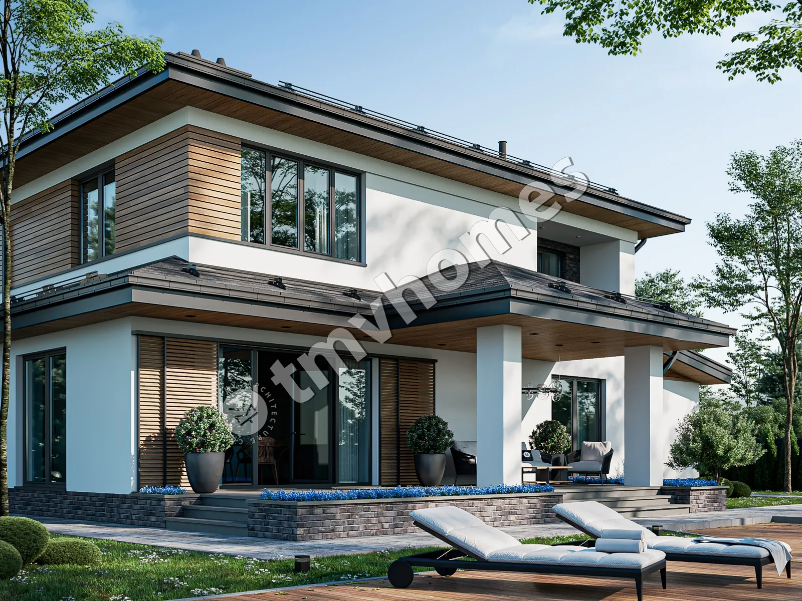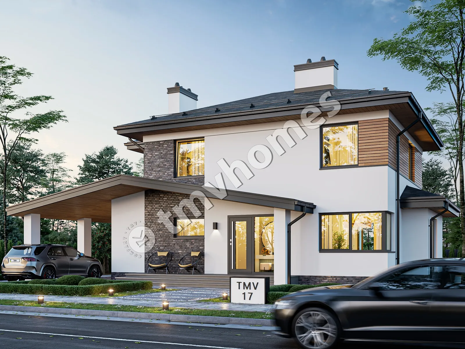 Проект TMV 17 - двухэтажный дом с крытой террасой, балконом и навесом для 1 автомобиля. Состав помещений: прихожая, холл, кухня-столовая, гостиная, 3 спальни, 3 санузла, гардеробная, кладовая, инвентарная, котельная.