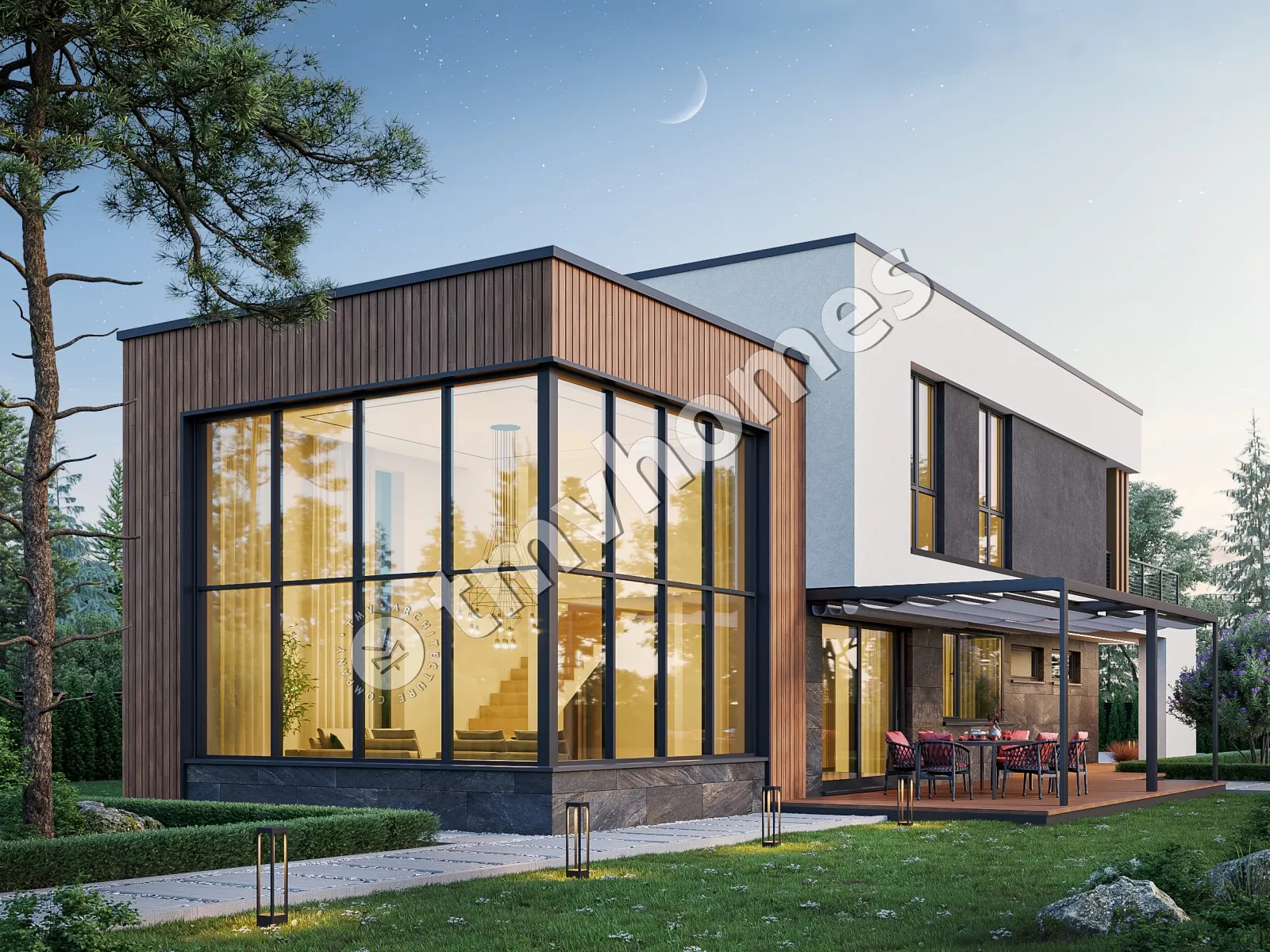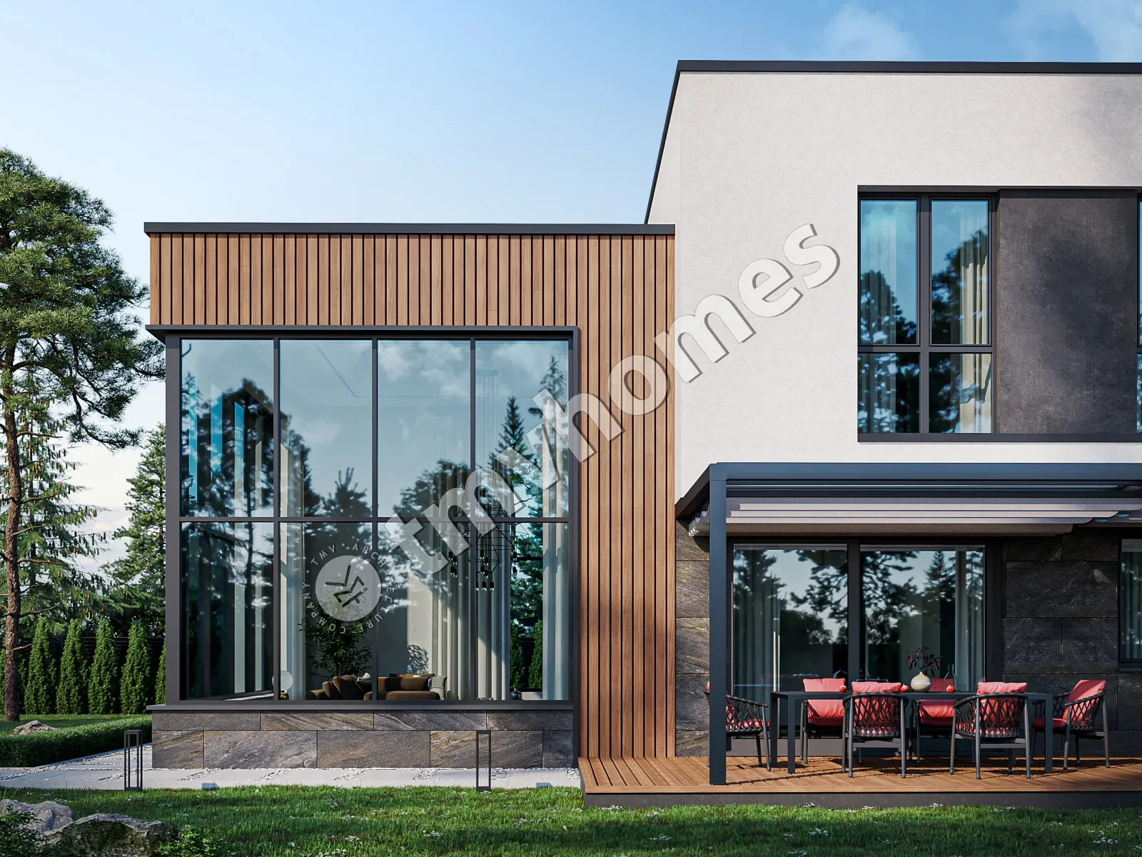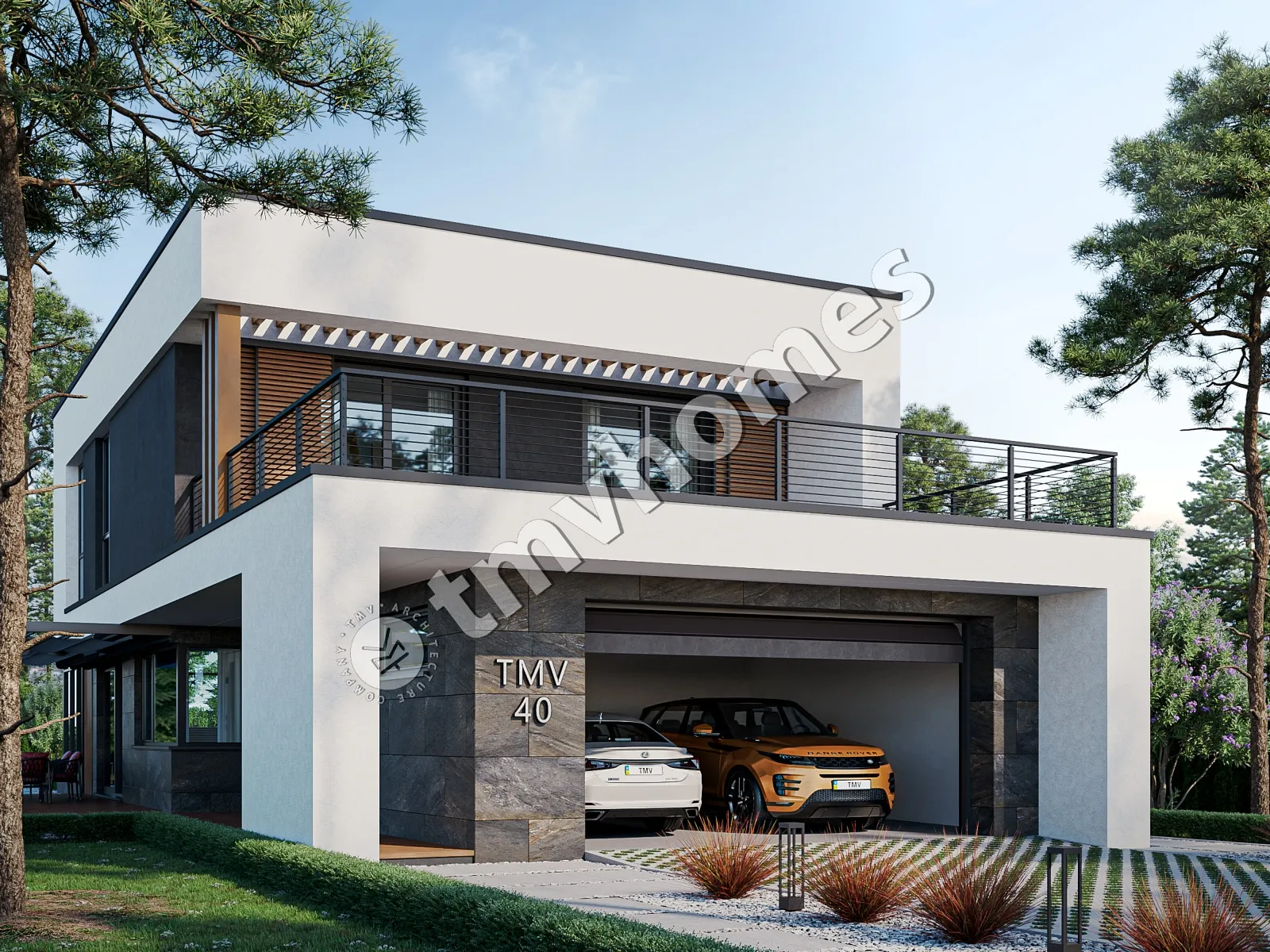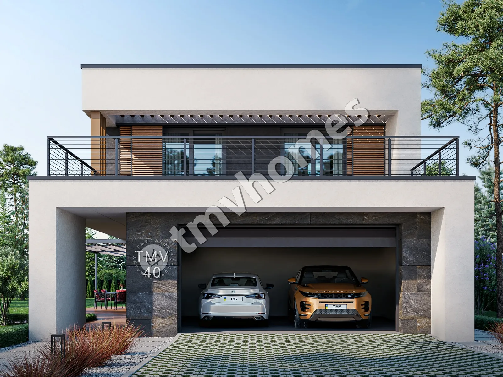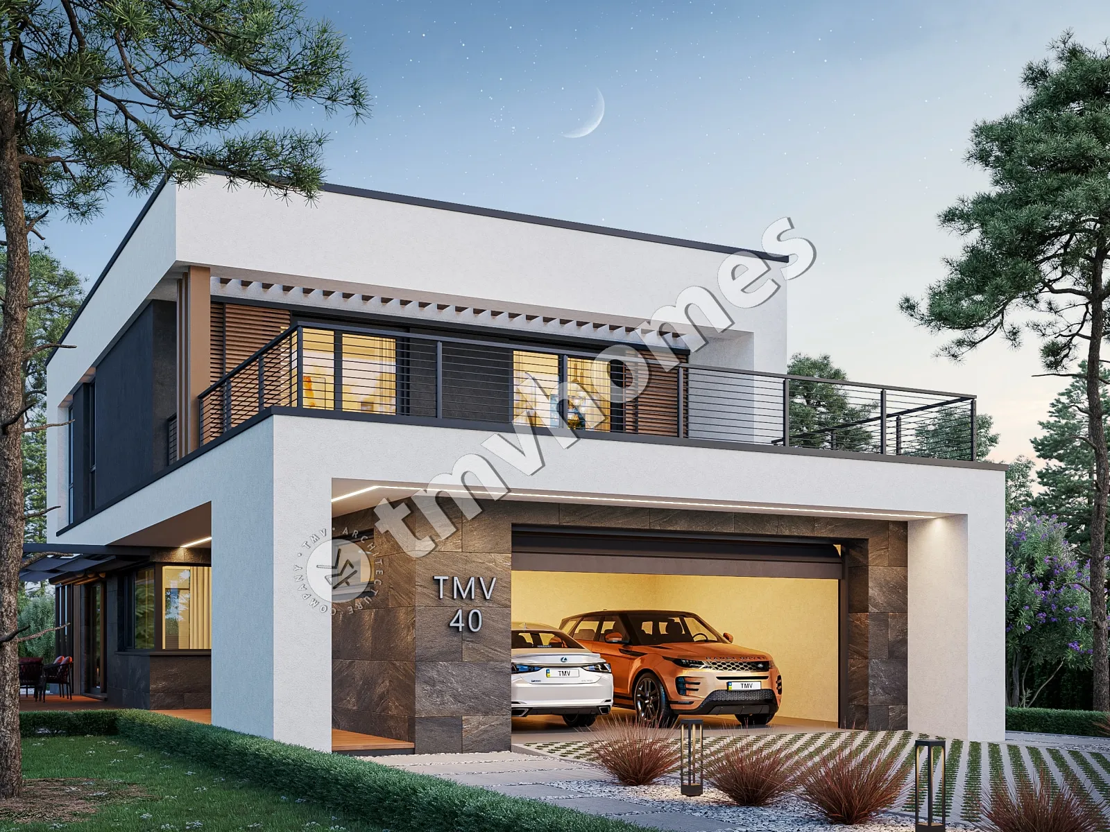 Проект TMV 40 - современный двухэтажный дом в стиле хай-тек со вторым светом, террасами и гаражом для 2 автомобилей. Состав помещений: прихожая, кухня-столовая, гостиная, кабинет, 3 спальни, 3 санузла, гардеробная, котельная.
