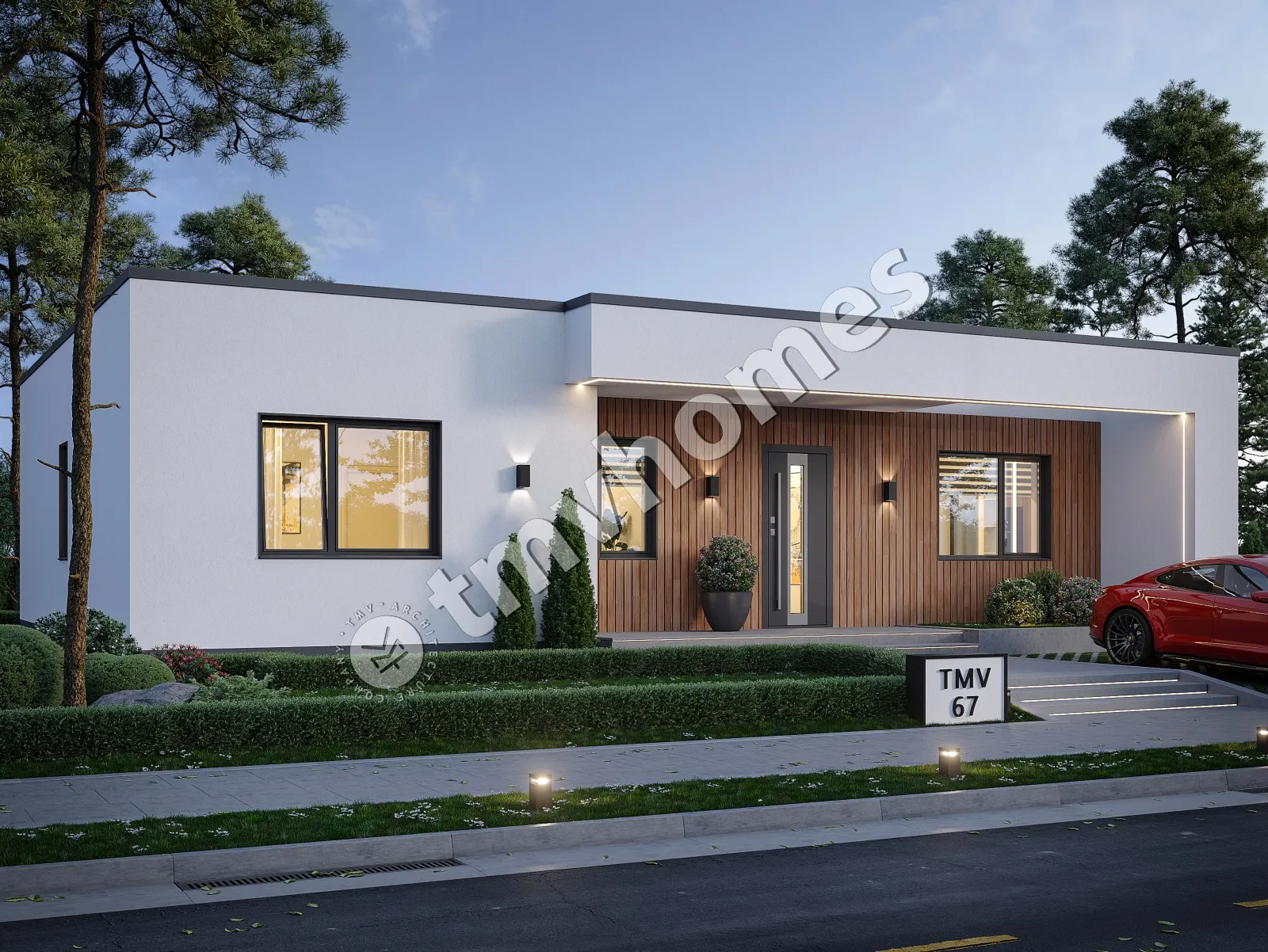 Проект TMV 67 - современный одноэтажный дом с плоской крышей, удобной планировкой и террасой. Состав помещений: прихожая, холл, гостиная, кухня-столовая, 3 спальни, 2 санузла, котельная.