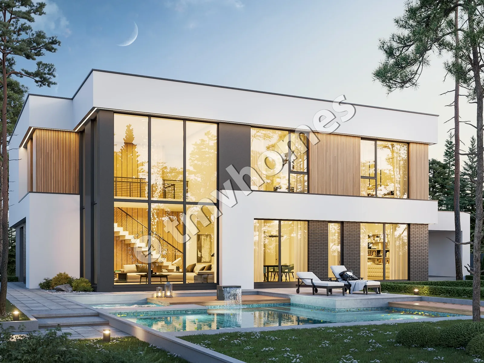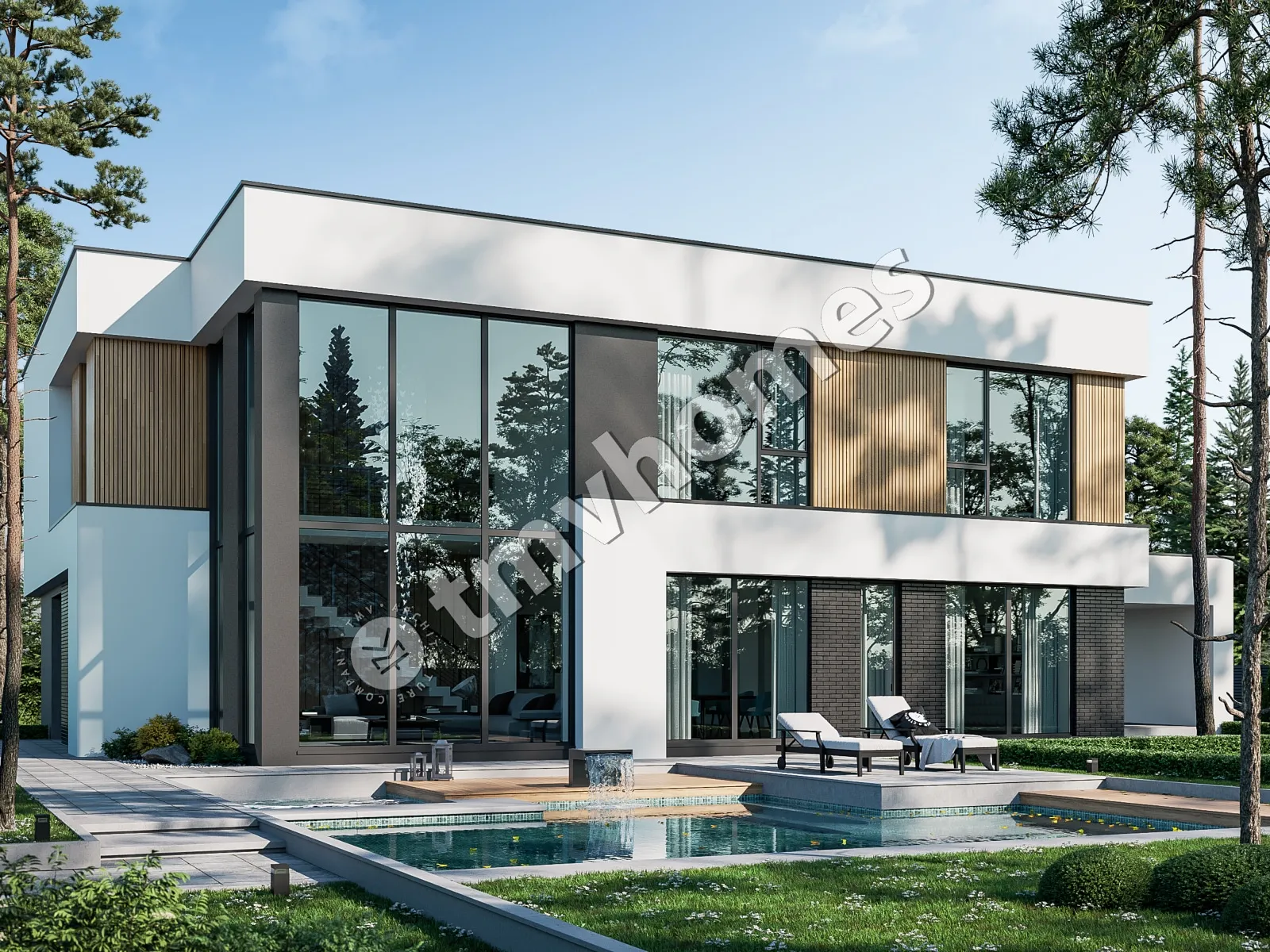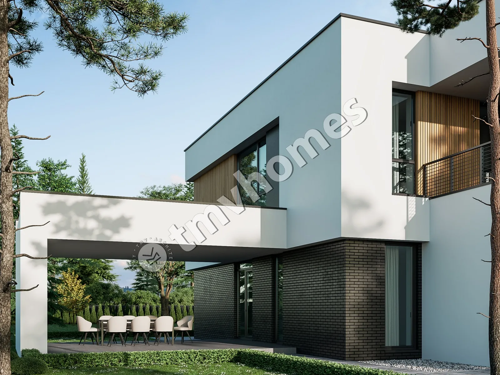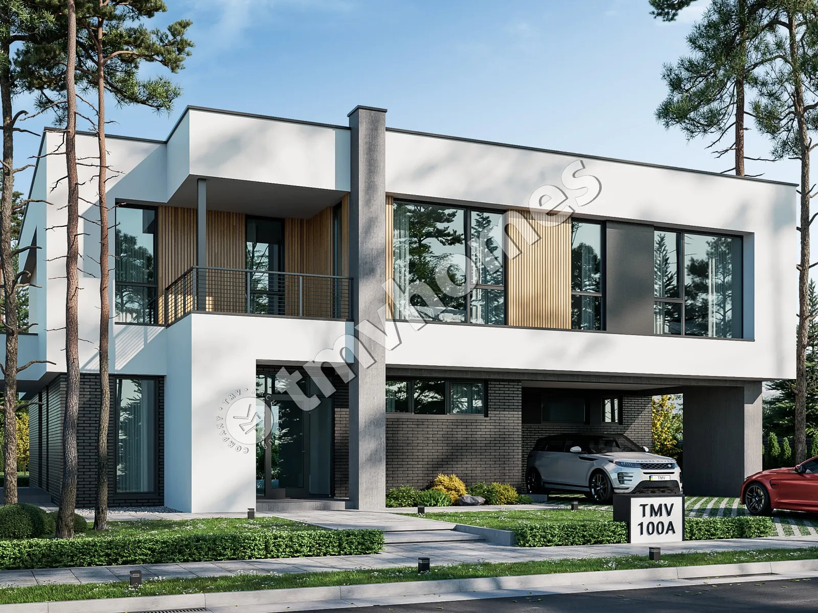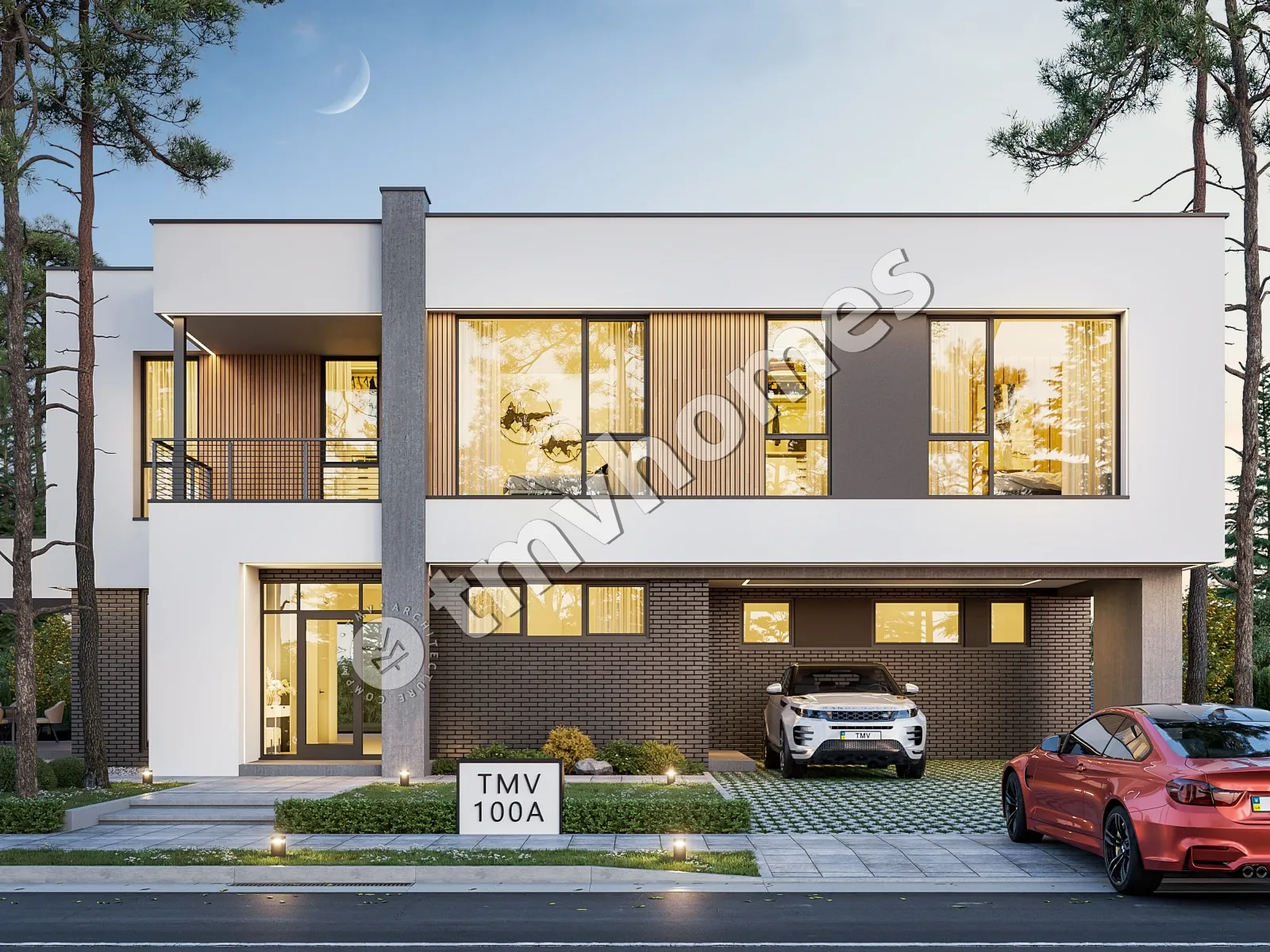 Проект TMV 100A - сучасний двоповерховий будинок в стилі хай-тек з відкритим плануванням, другим світлом, бічною терасою, балконом та навісом для 2 автомобілів. Склад приміщень: хол, вітальня, кухня-їдальня, кабінет, 6 спалень, 4 санвузли, пральня, гардеробна, комора, котельня.