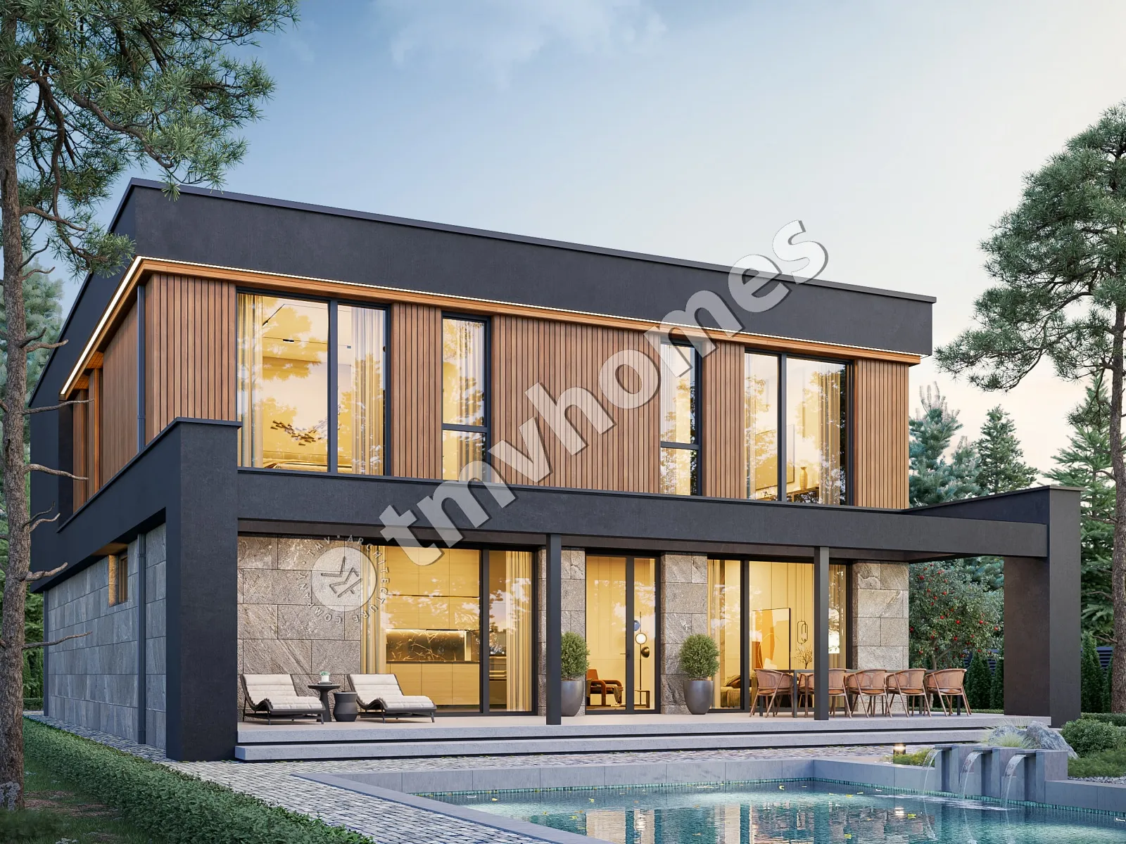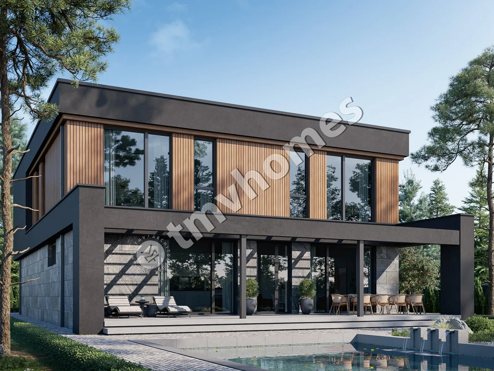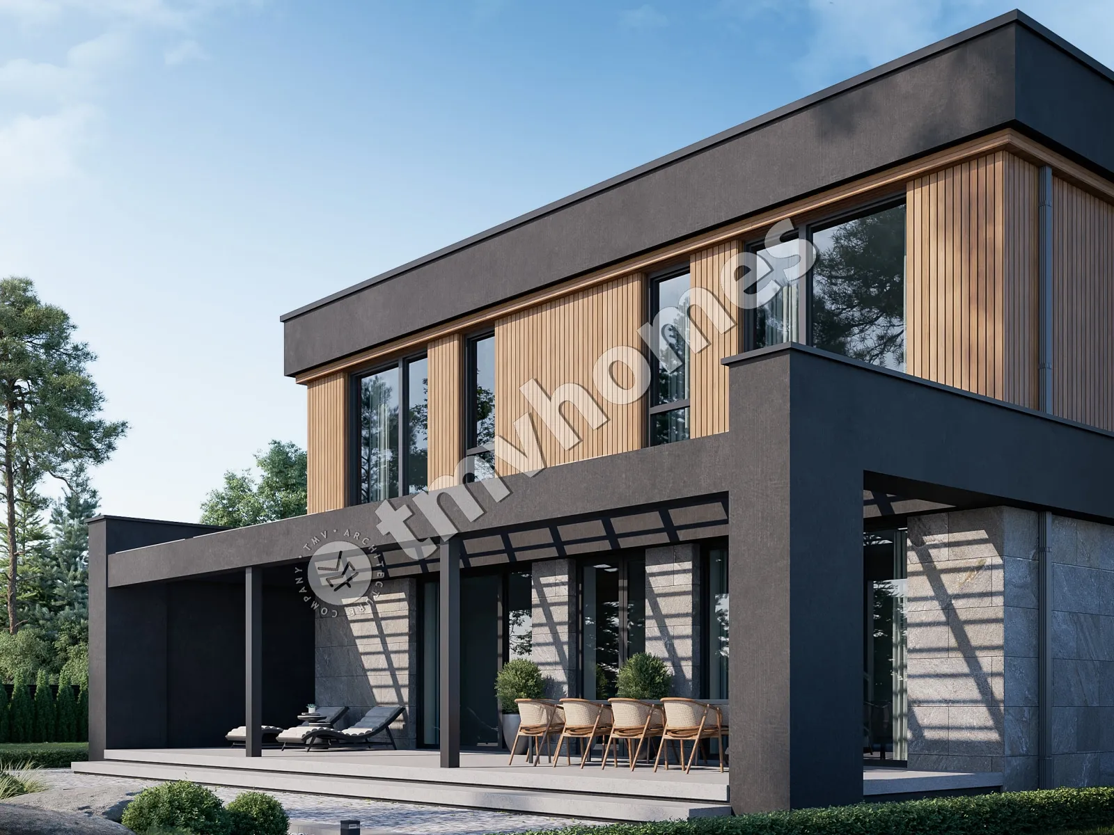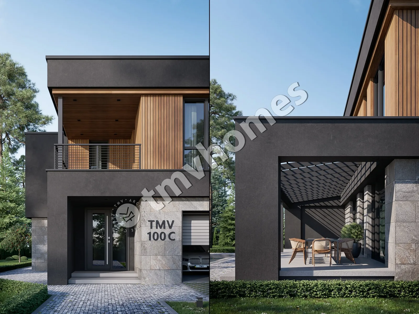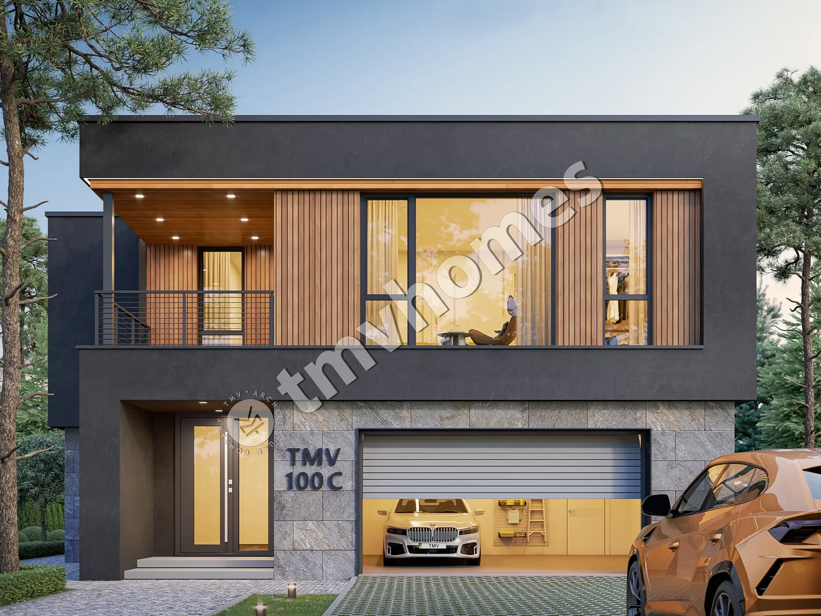 Проект TMV 100C - сучасний двоповерховий будинок в стилі хай-тек з плоским дахом, терасою, балконом та навісом для 2 автомобілів. Склад приміщень: передпокій, вітальня, кухня-їдальня, кабінет, 3 спальні, 3 санвузли, пральня, гардеробна, комора, котельня.