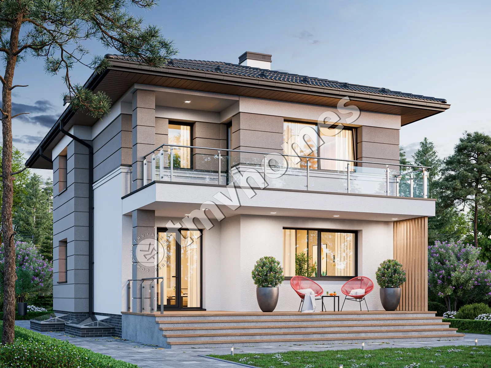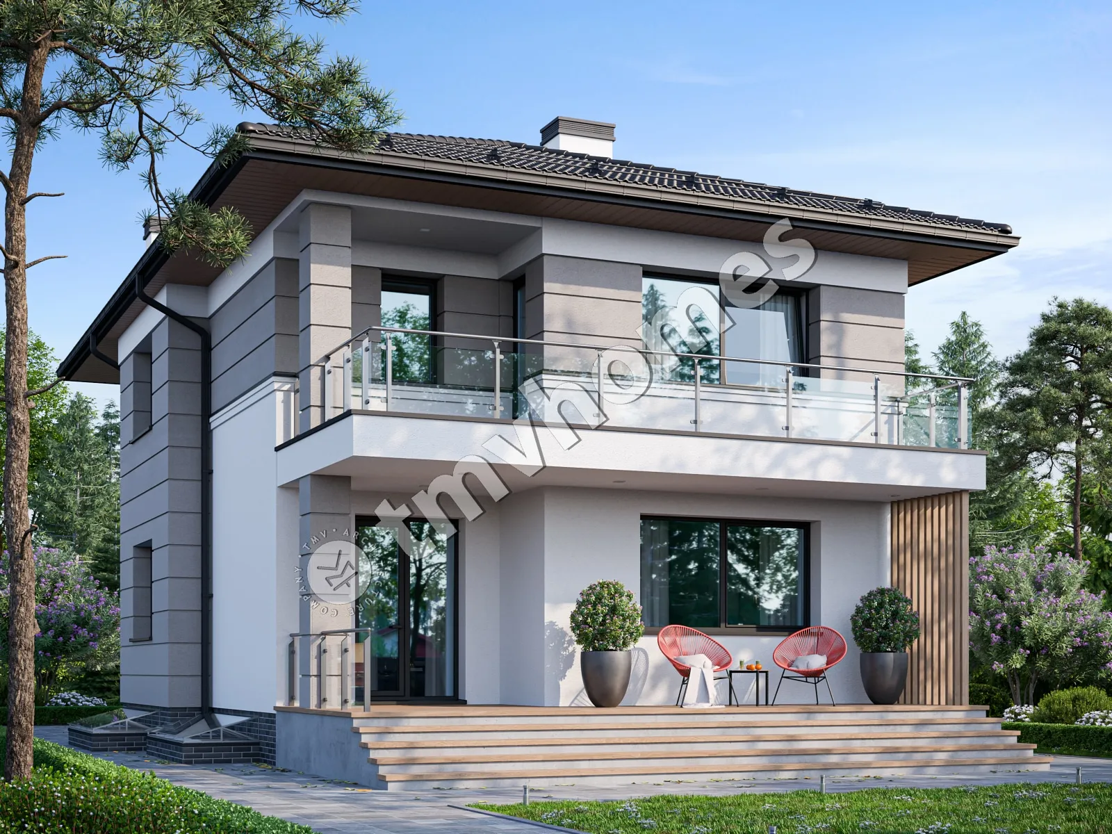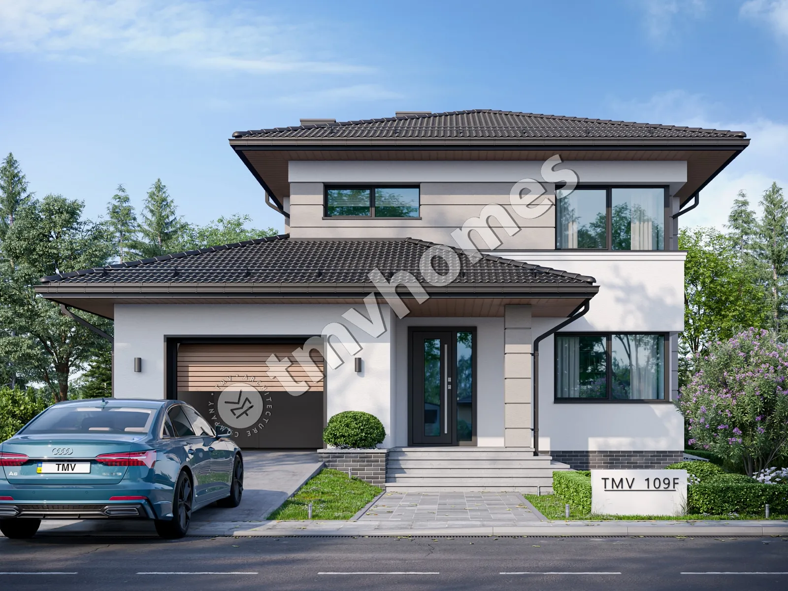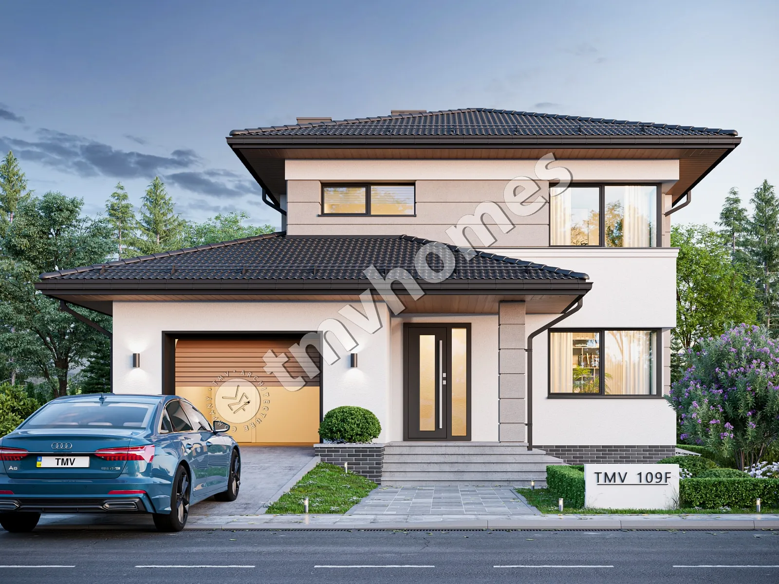 Проект TMV 109F - двоповерховий будинок з цокольним поверхом, терасою, балконом та гаражем для 1 автомобіля. Склад приміщень: господарські приміщення, передпокій, хол, вітальня, кухня-їдальня, 4 спальні, 3 санвузли, гардеробна, комора, котельня.