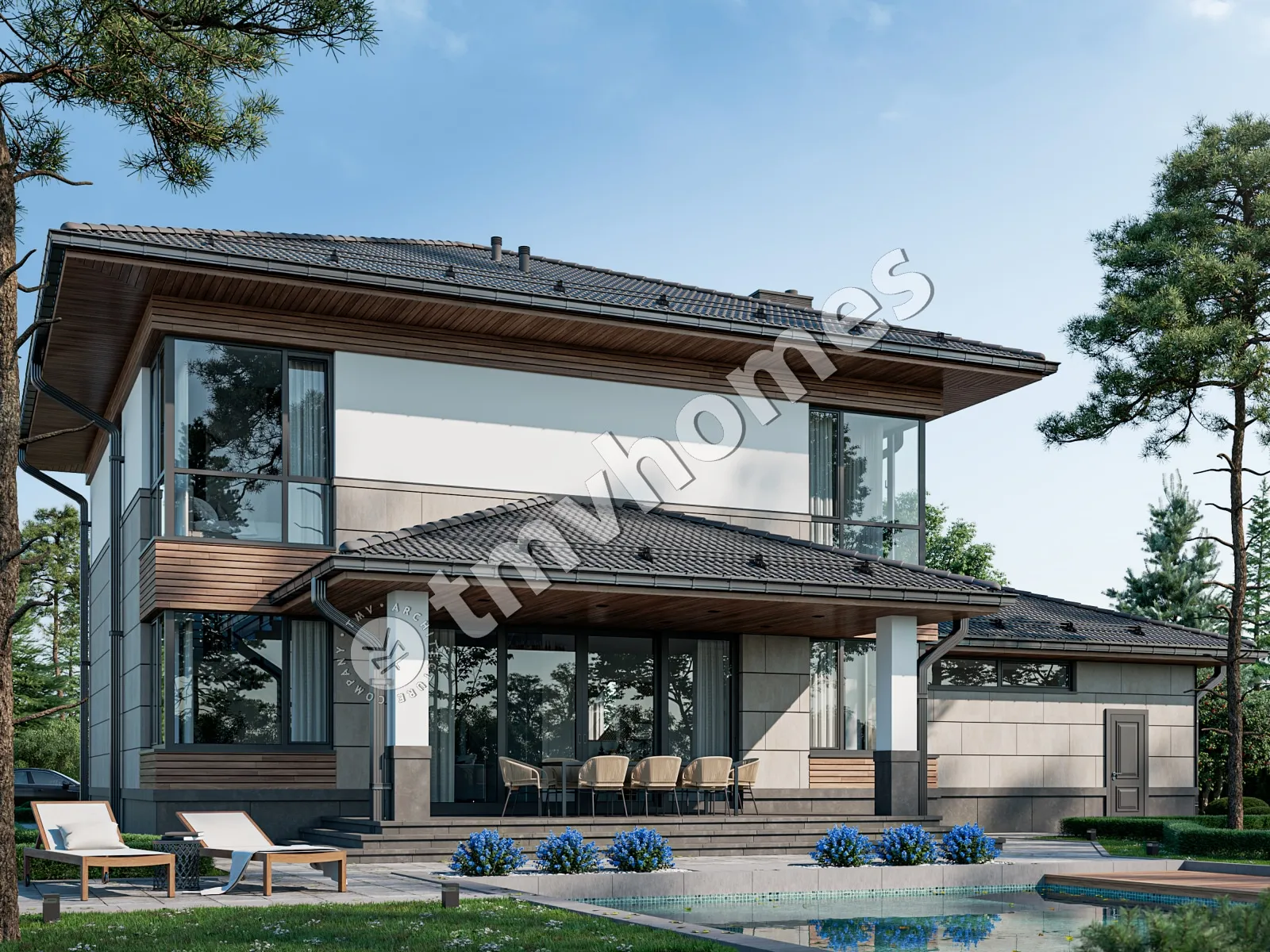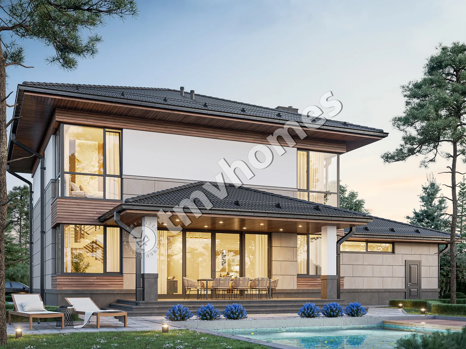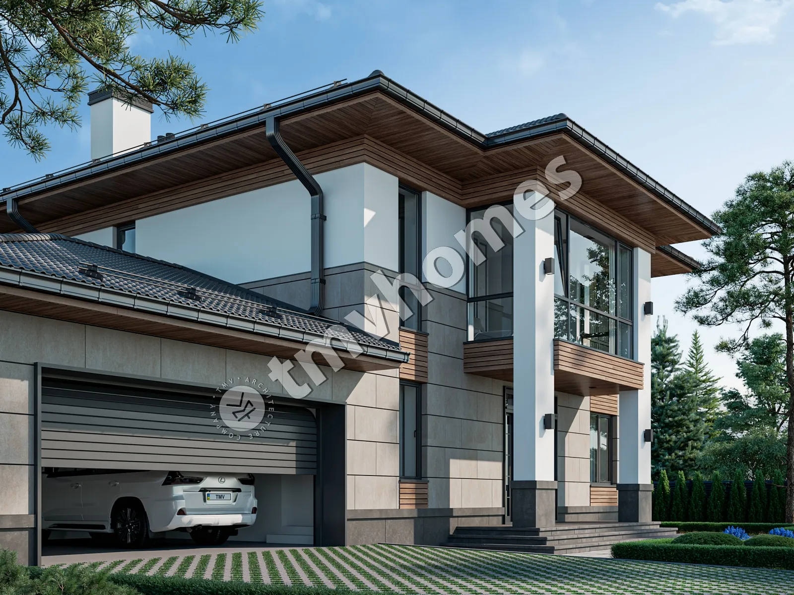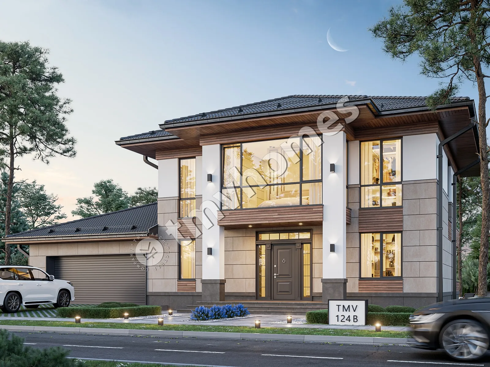 Проект TMV 124B - класичний двоповерховий будинок з критою терасою і гаражем для 2 автомобілів. Склад приміщень: хол, вітальня, кухня-їдальня, кабінет, 3 спальні, 3 санвузли, гардеробна, комора, котельня.