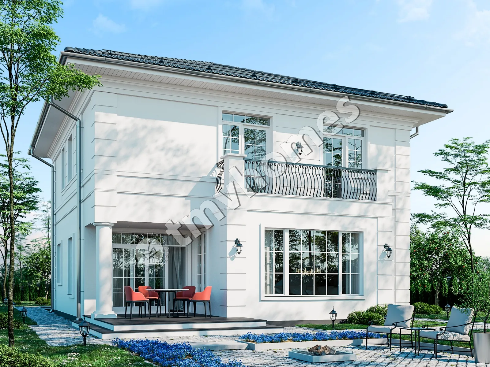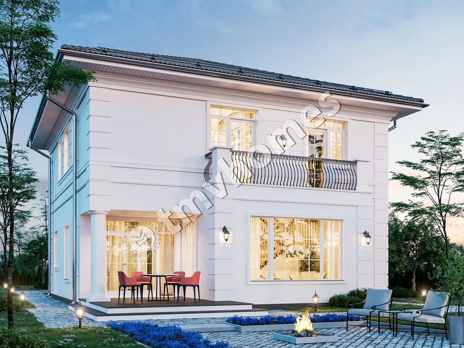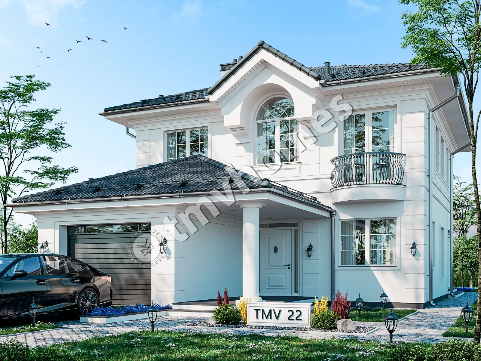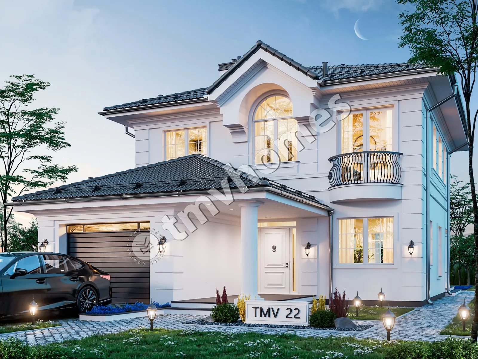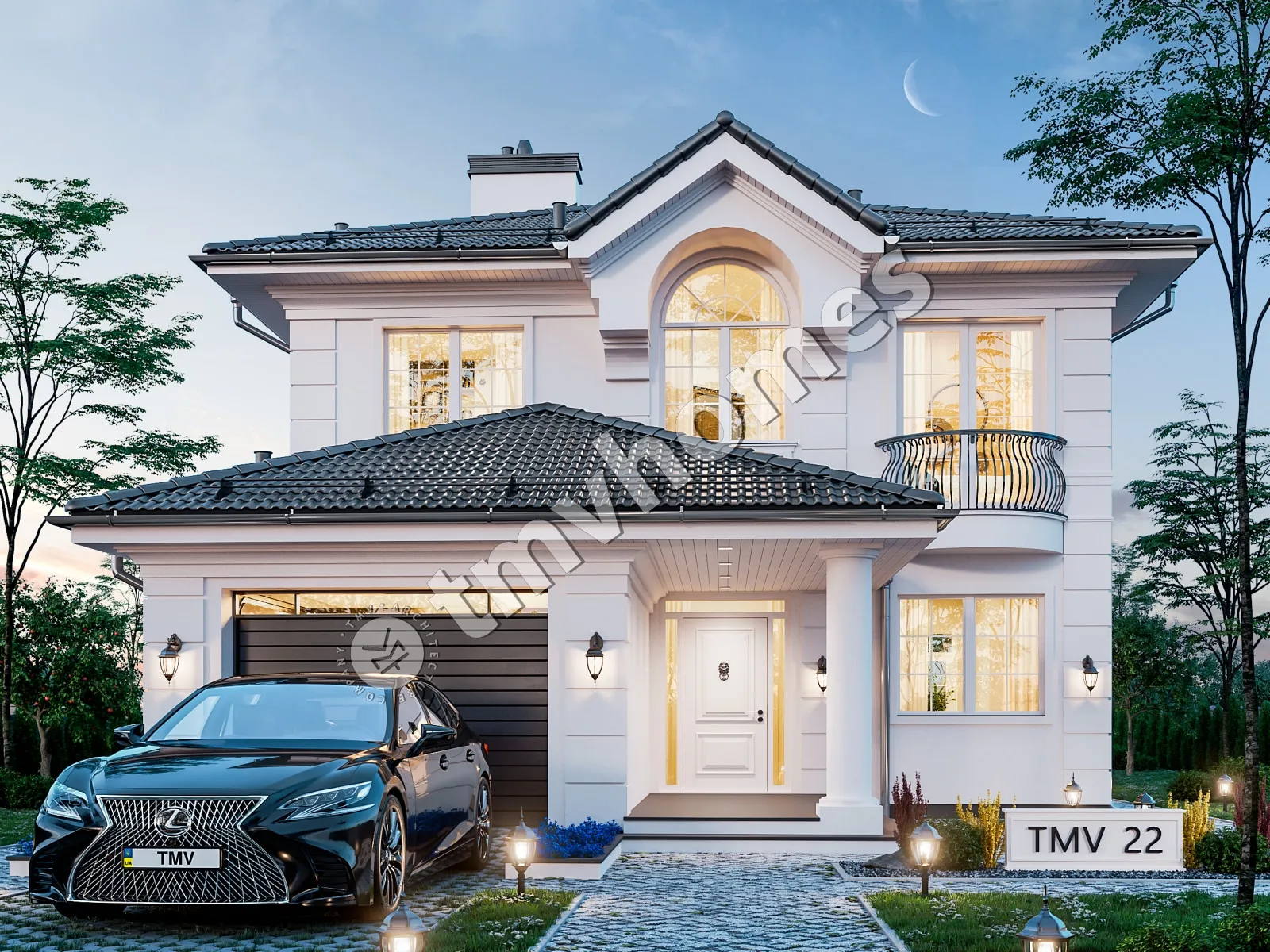 Проект TMV 22 - класичний двоповерховий особняк з терасою і гаражем для 1 автомобіля. Склад приміщень: передпокій, кухня-їдальня, вітальня, 3 спальні, 2 санвузли, гардеробна, комора, котельня.