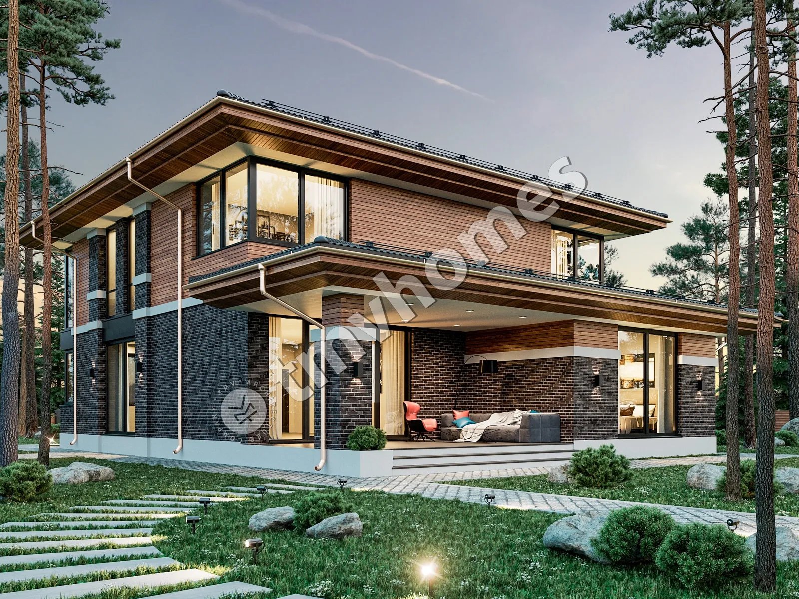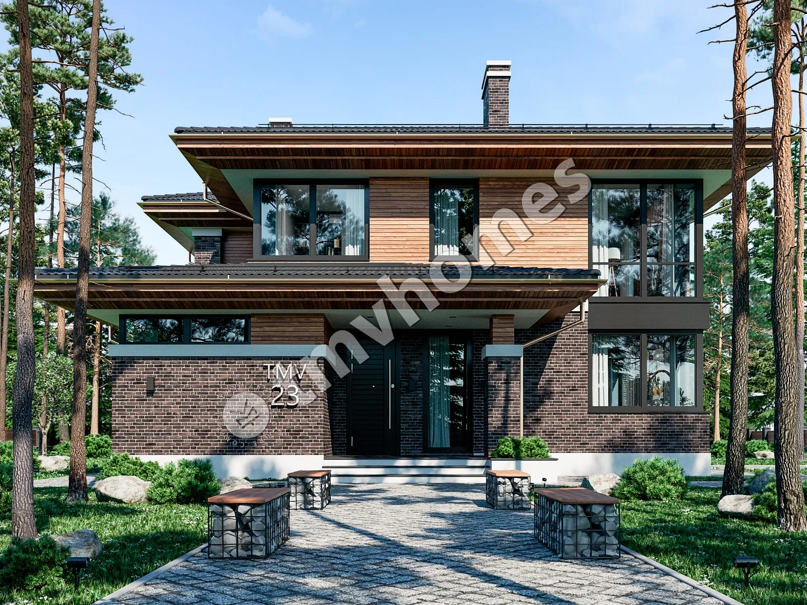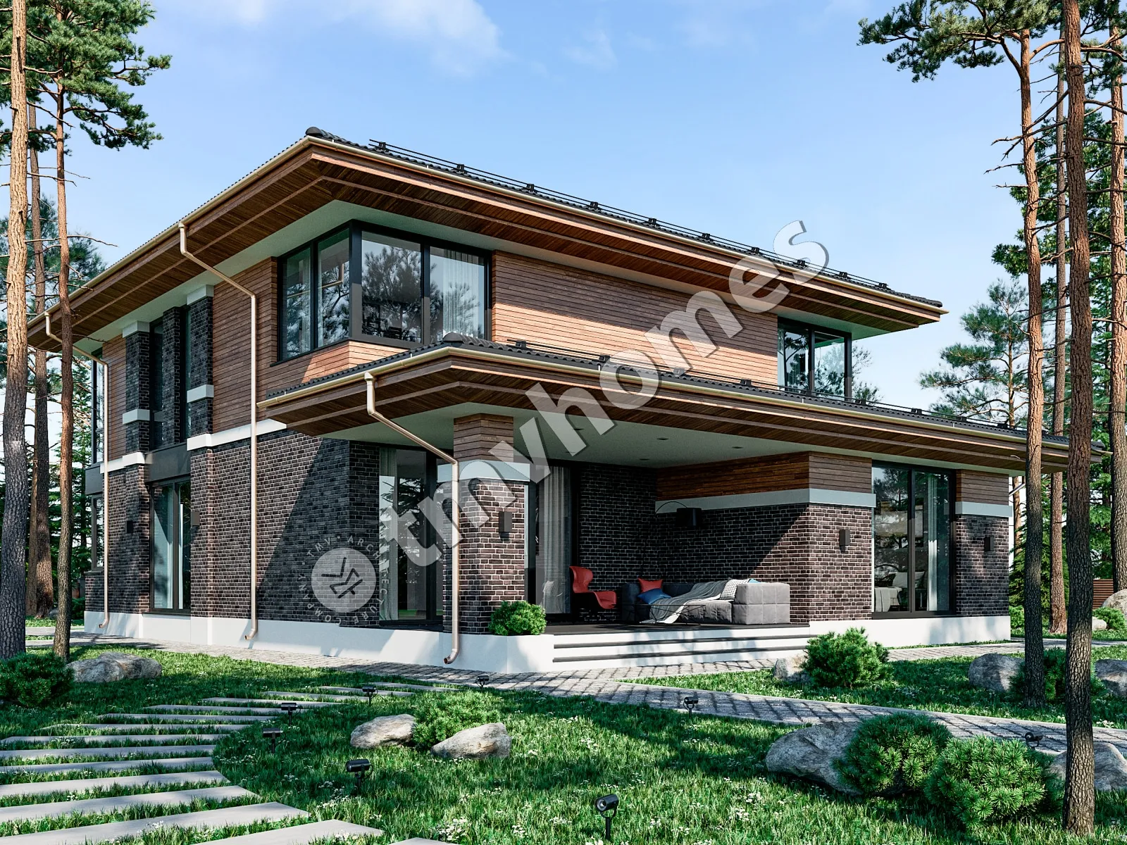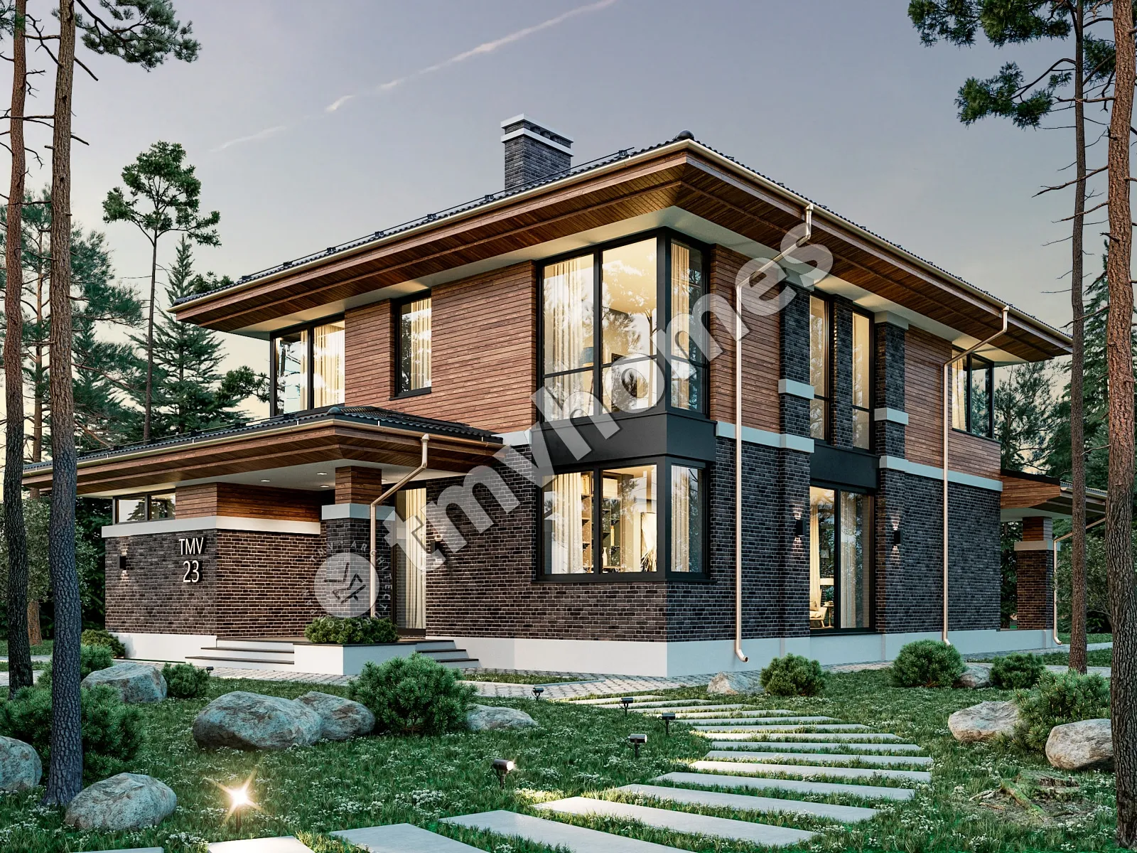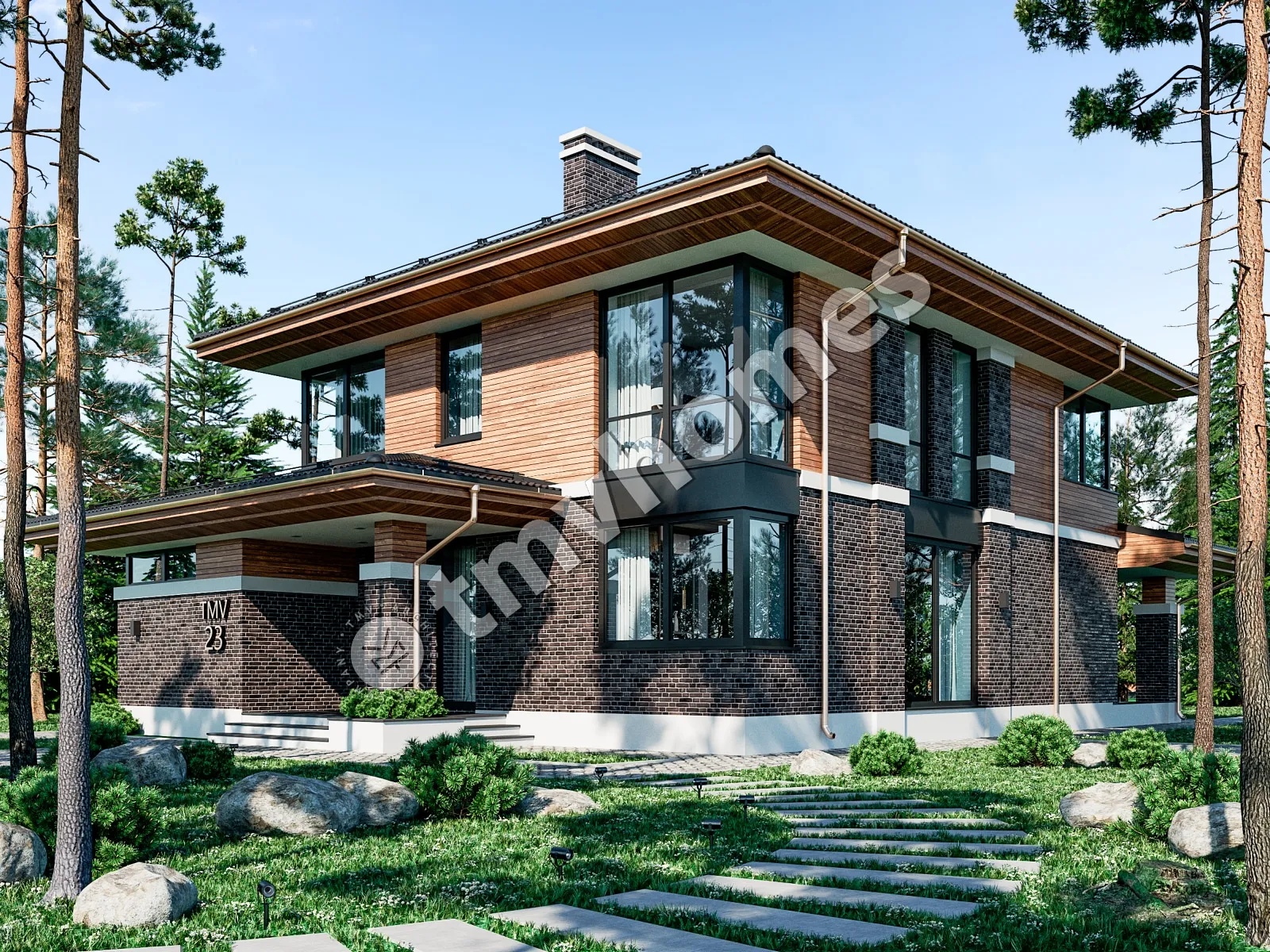 Проект TMV 23 - комфортний двоповерховий будинок в стилі Райта з терасою. Склад приміщень: передпокій, хол, вітальня, кухня-їдальня, кабінет, 3 спальні, 3 санвузли, пральня, гардеробна, котельня.