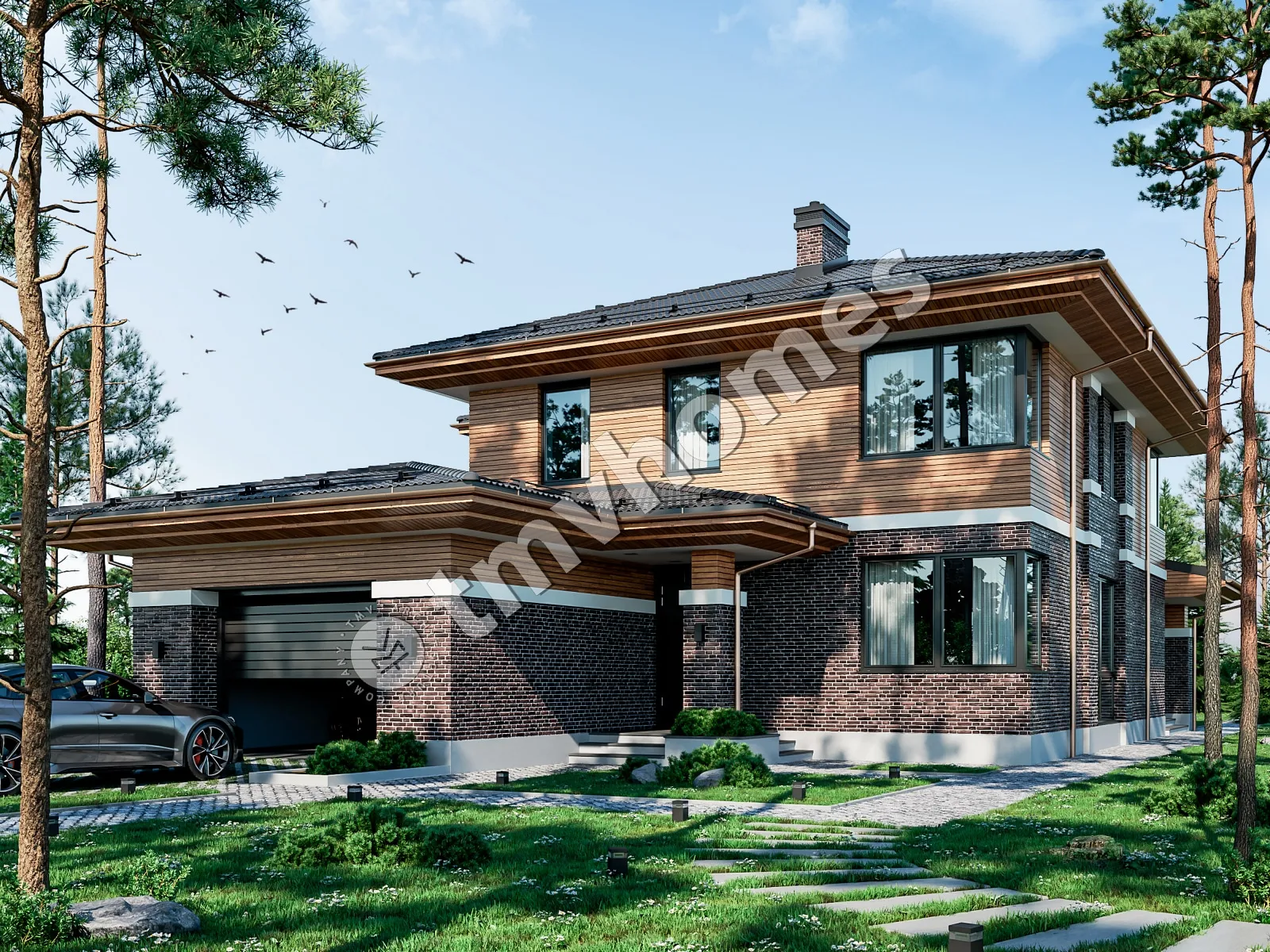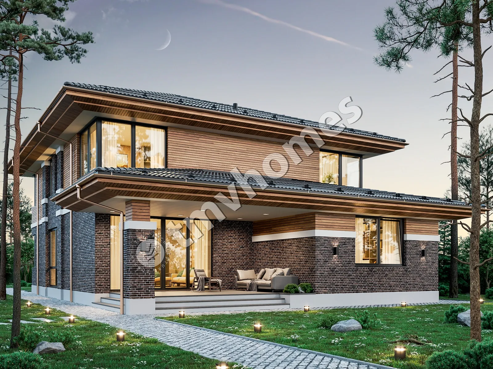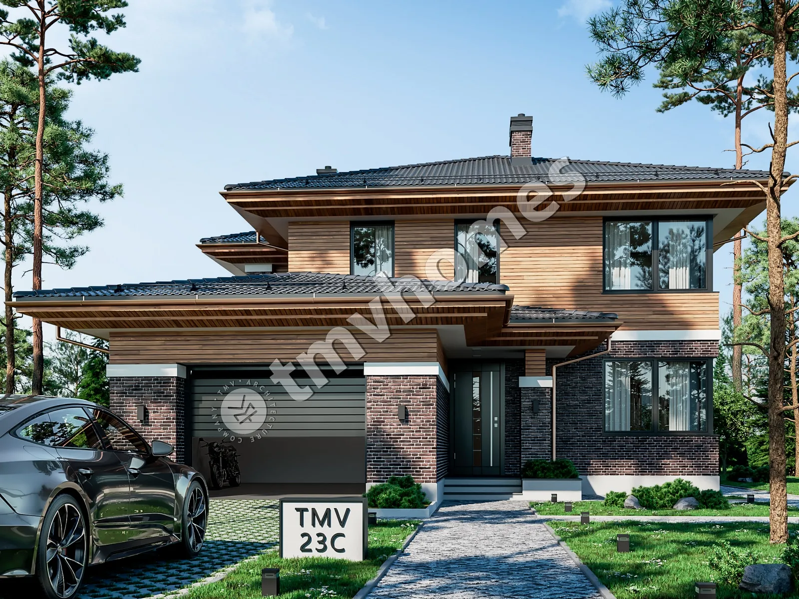 Проект TMV 23C - комфортний двоповерховий будинок в стилі Райта з гаражем і терасою. Склад приміщень: передпокій, хол, вітальня, кухня-їдальня, 4 спальні, 4 санвузли, пральня, гардеробна, котельня.