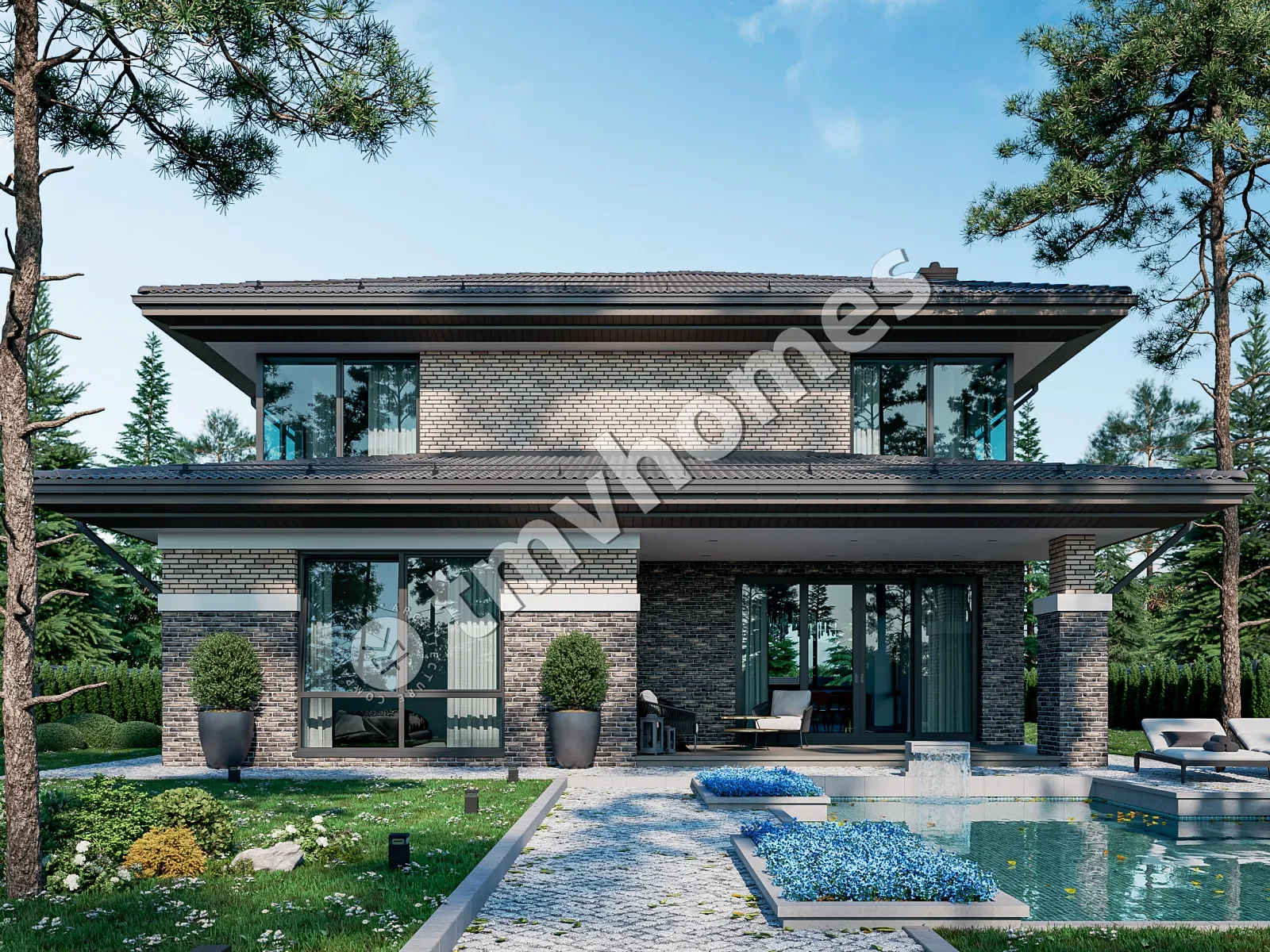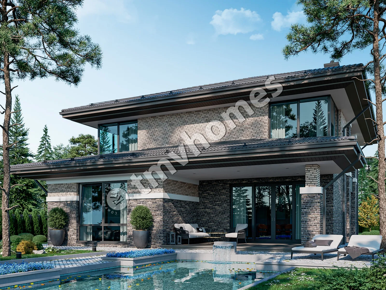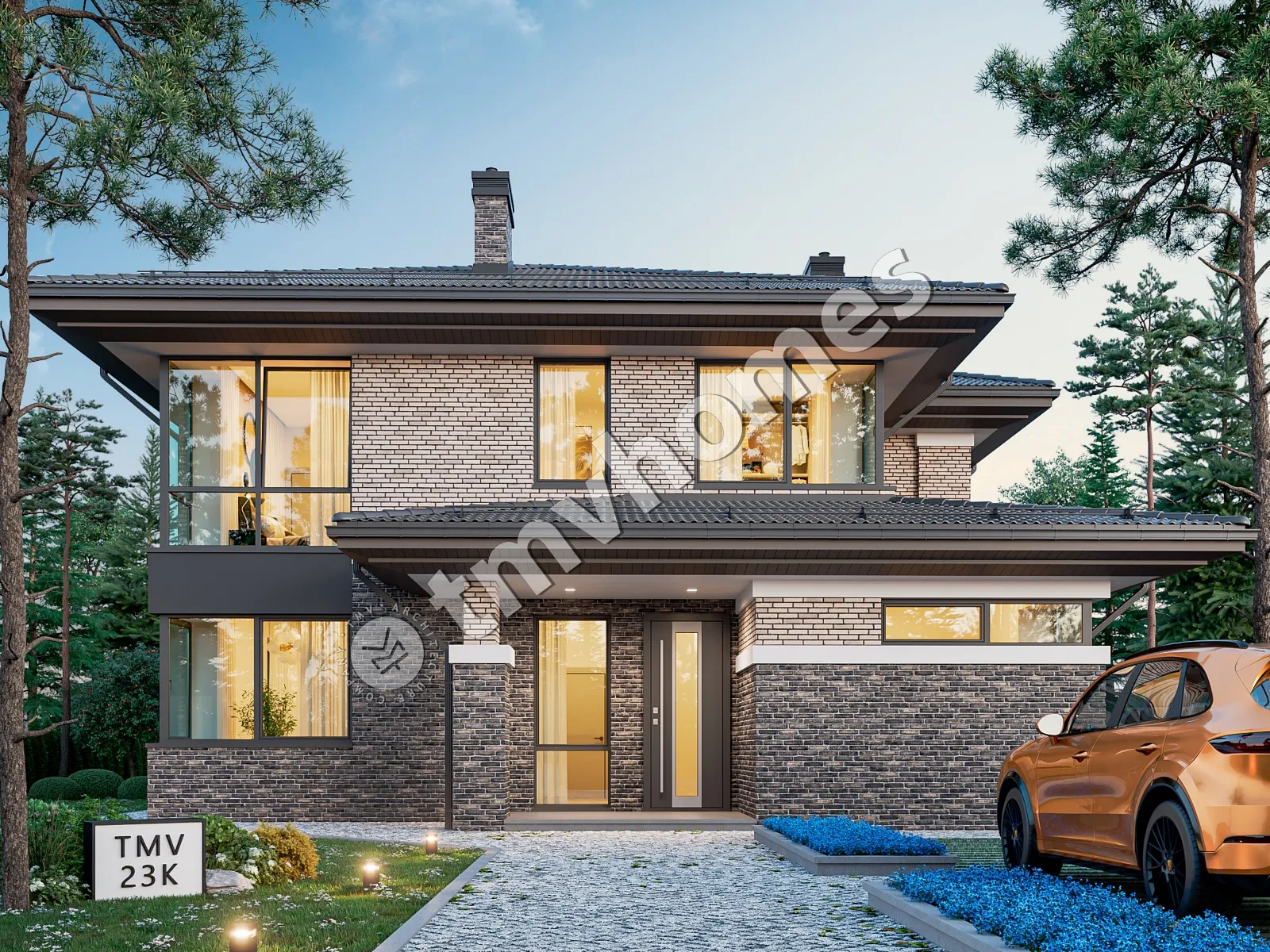 Проект TMV 23K - цегляний двоповерховий будинок в стилі Райта з терасою. Склад приміщень: передпокій, хол, вітальня, кухня-їдальня, кабінет, 4 спальні, 3 санвузли, пральня, гардеробна, котельня.