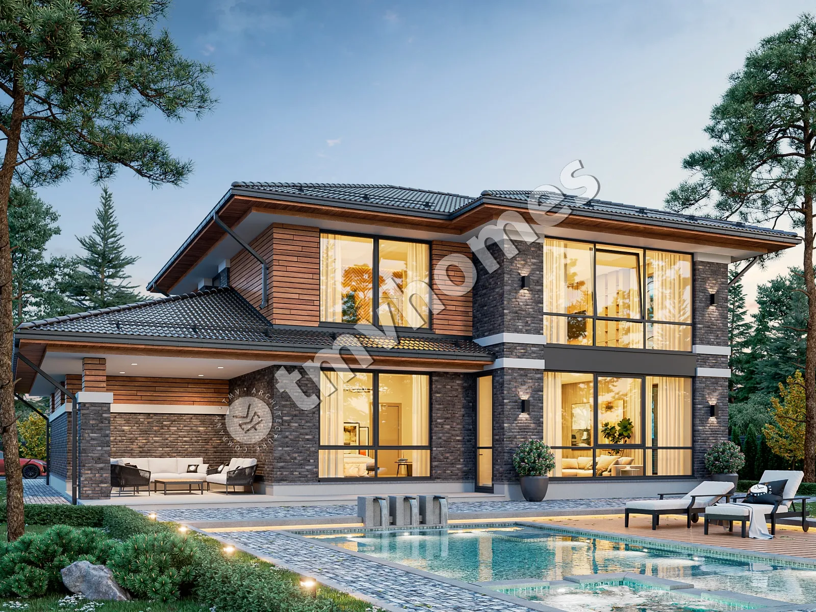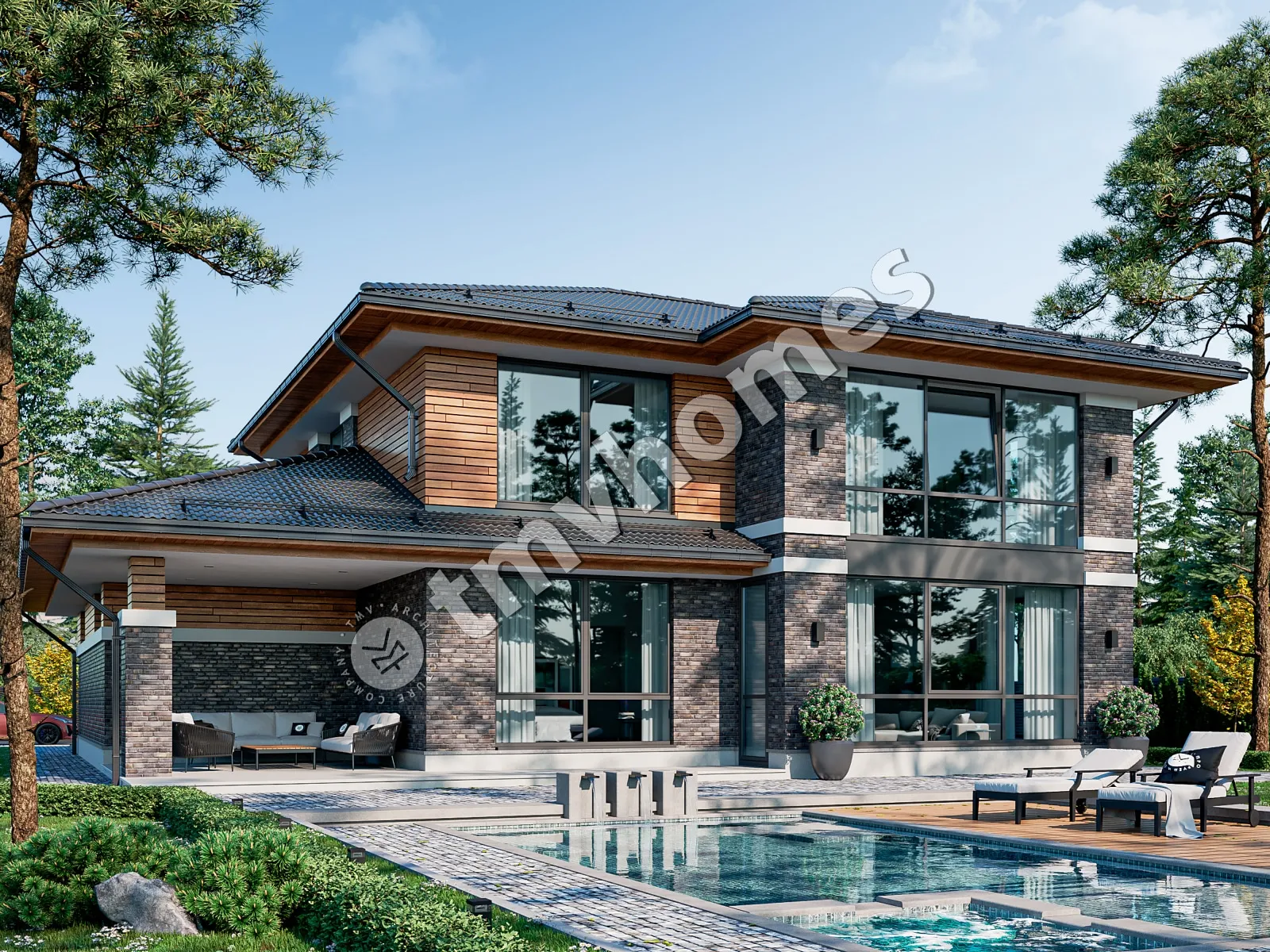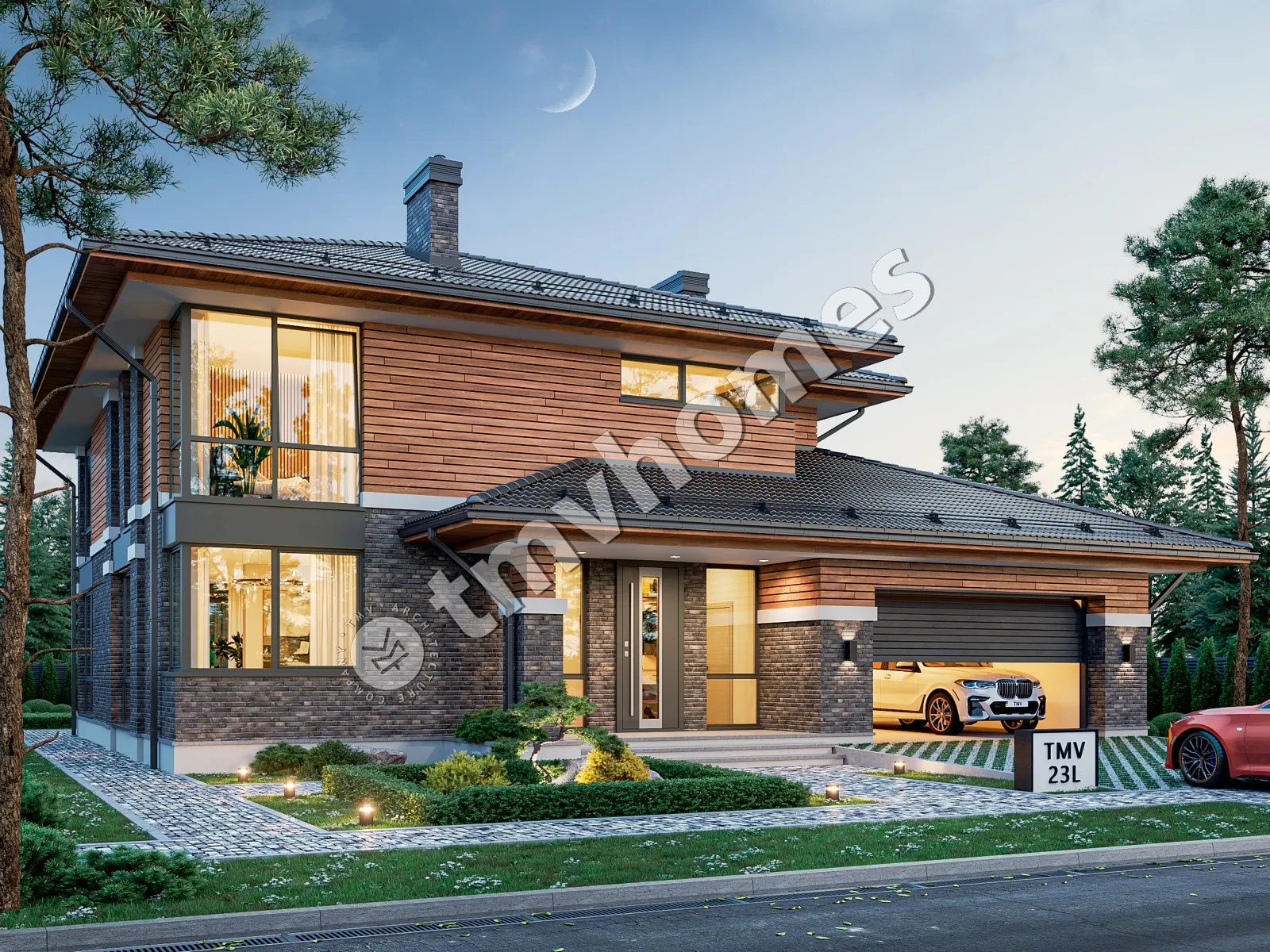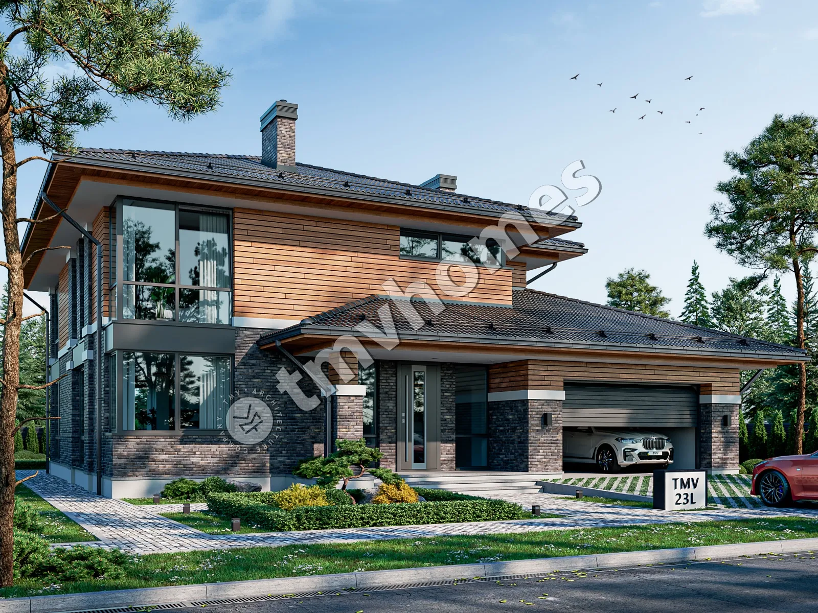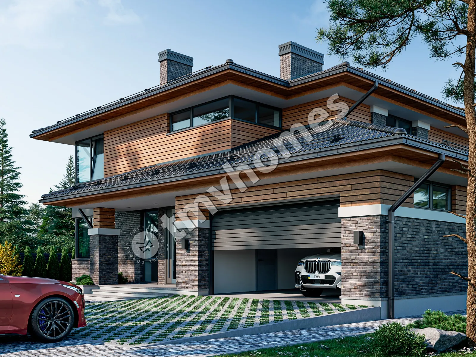 Комфортний двоповерховий будинок в стилі Райта з терасою та гаражем для 2 автомобілів. Склад приміщень: передпокій, хол, кухня-їдальня, вітальня, 4 спальні, 3 санвузли, пральня, гардеробна, котельня.
