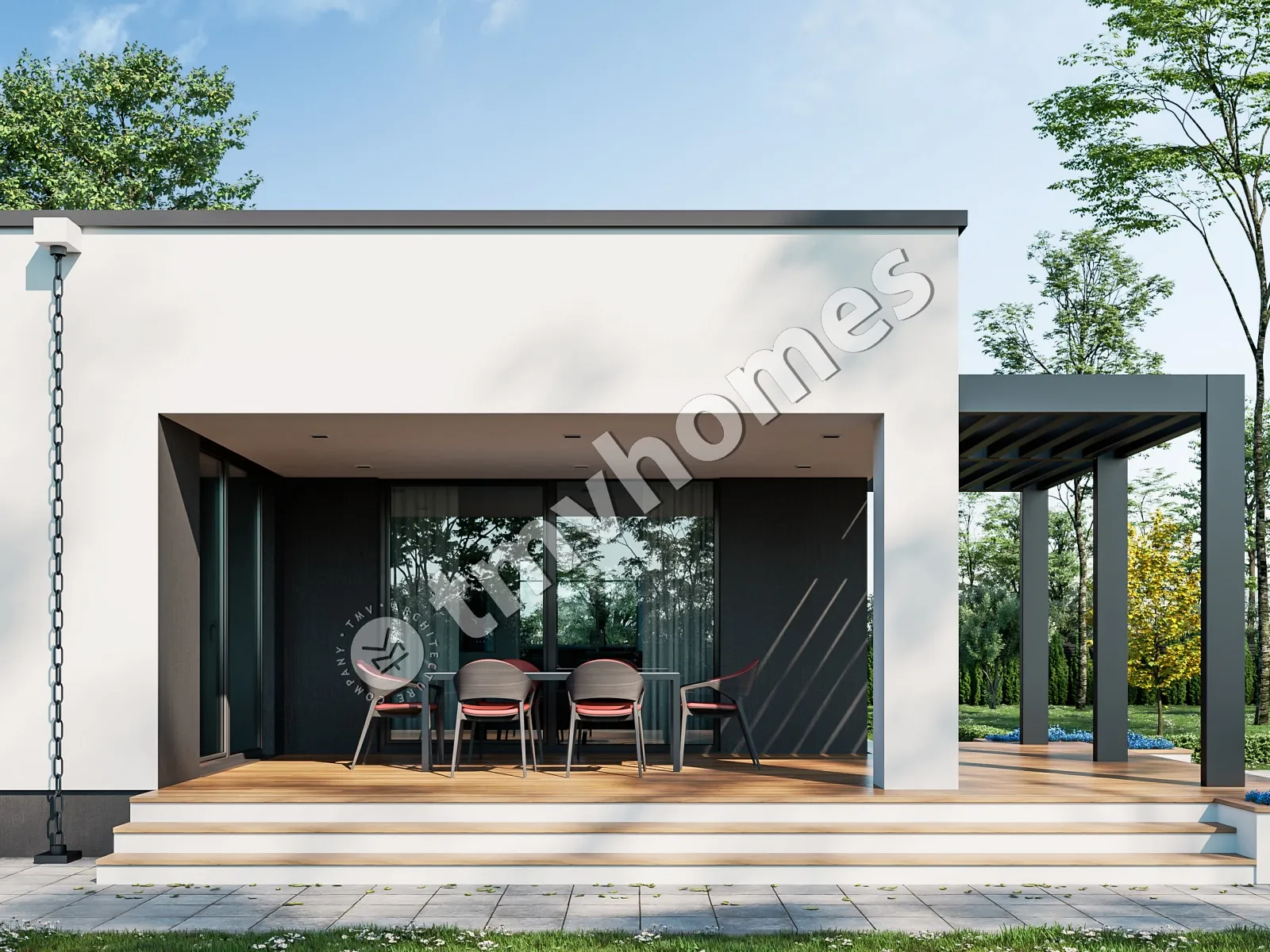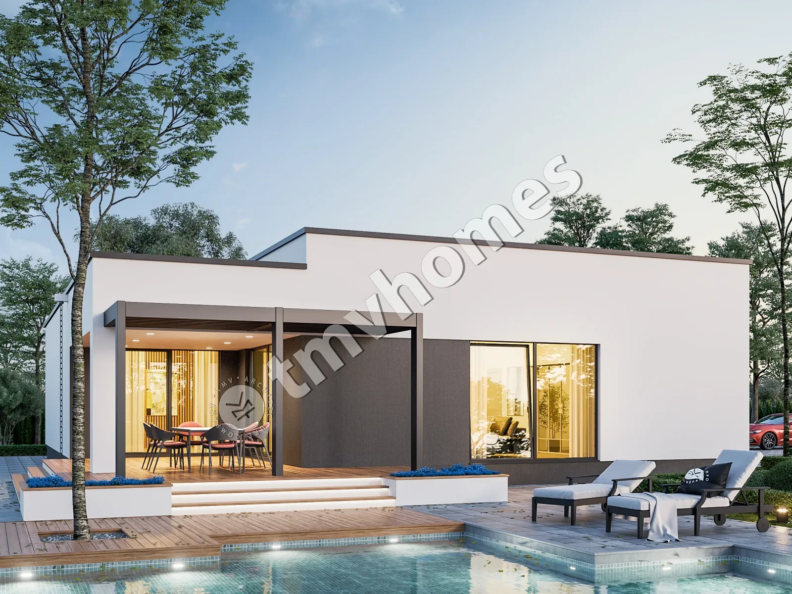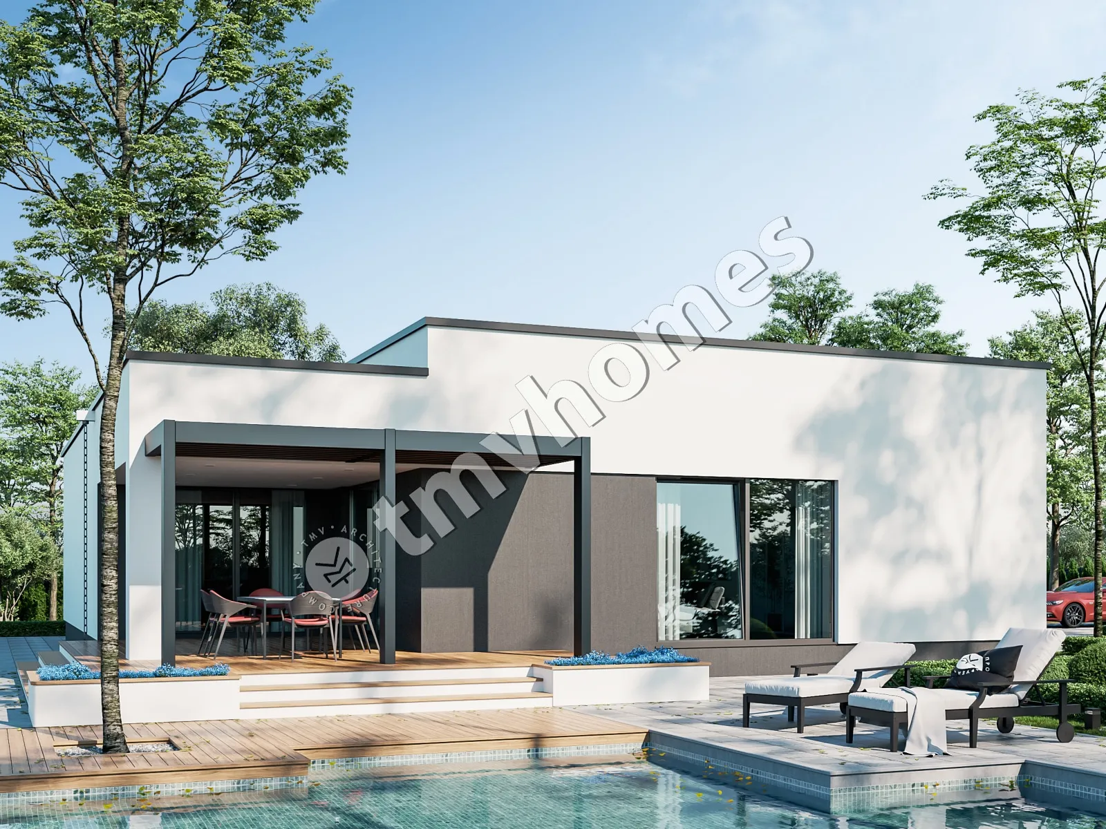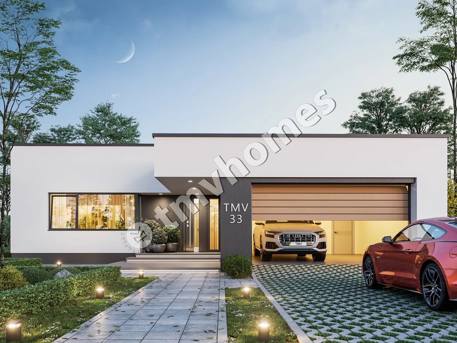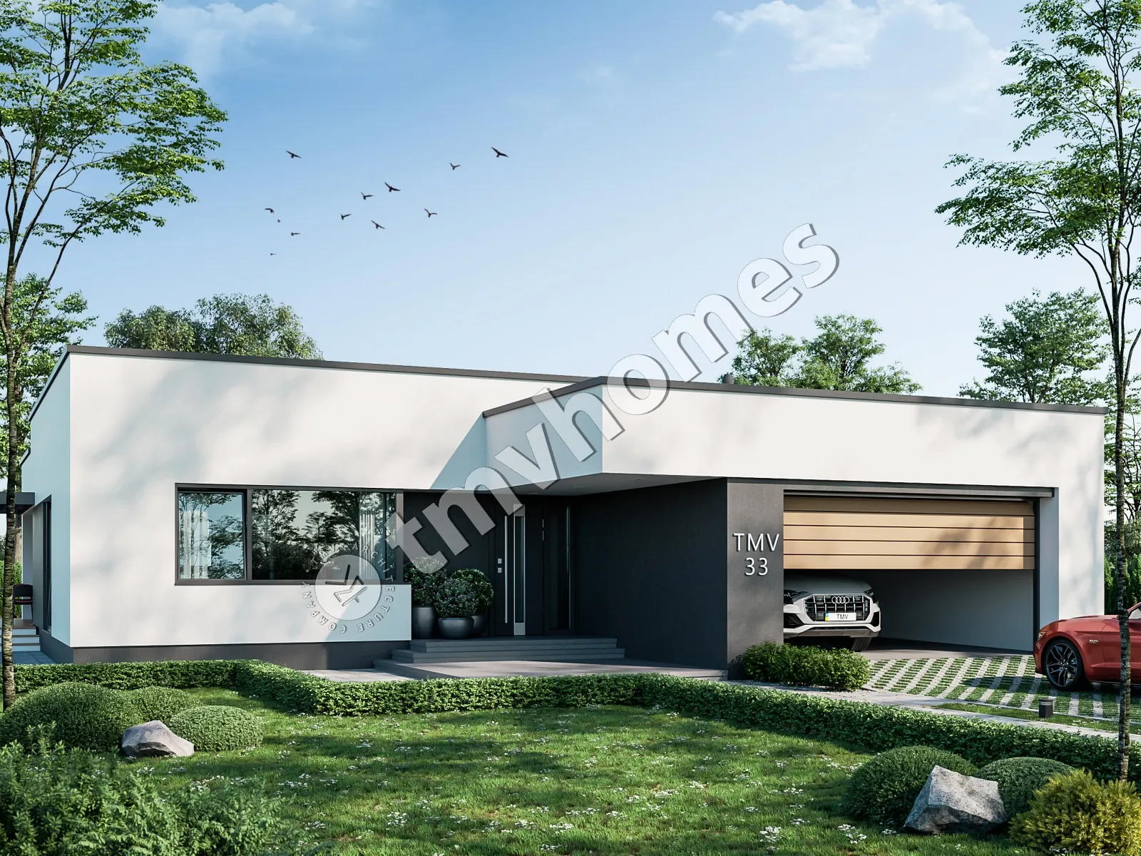 Проект TMV 33 - сучасний одноповерховий будинок у стилі хай-тек з плоским дахом, терасою і гаражем для 2 автомобілів. Склад приміщень: передпокій, хол, кухня, вітальня, 3 спальні, 3 санвузли, пральня, гардеробна, комора, котельня.