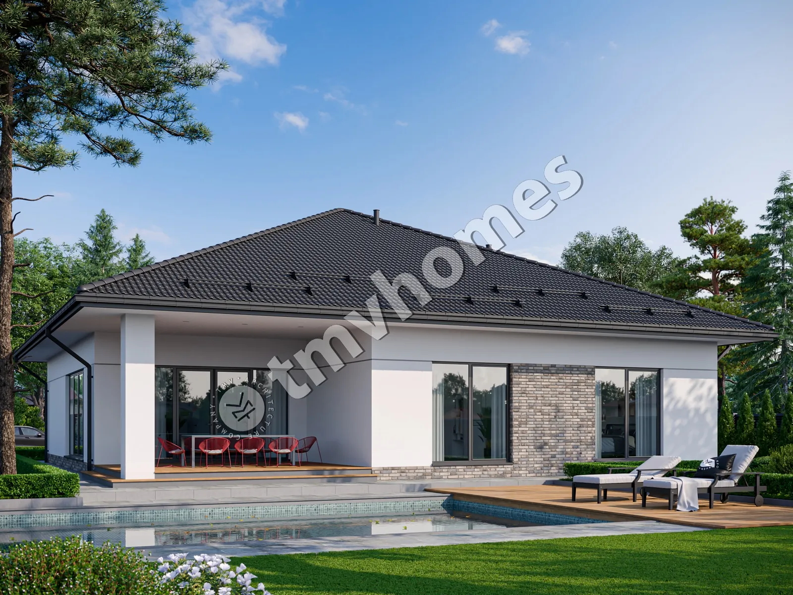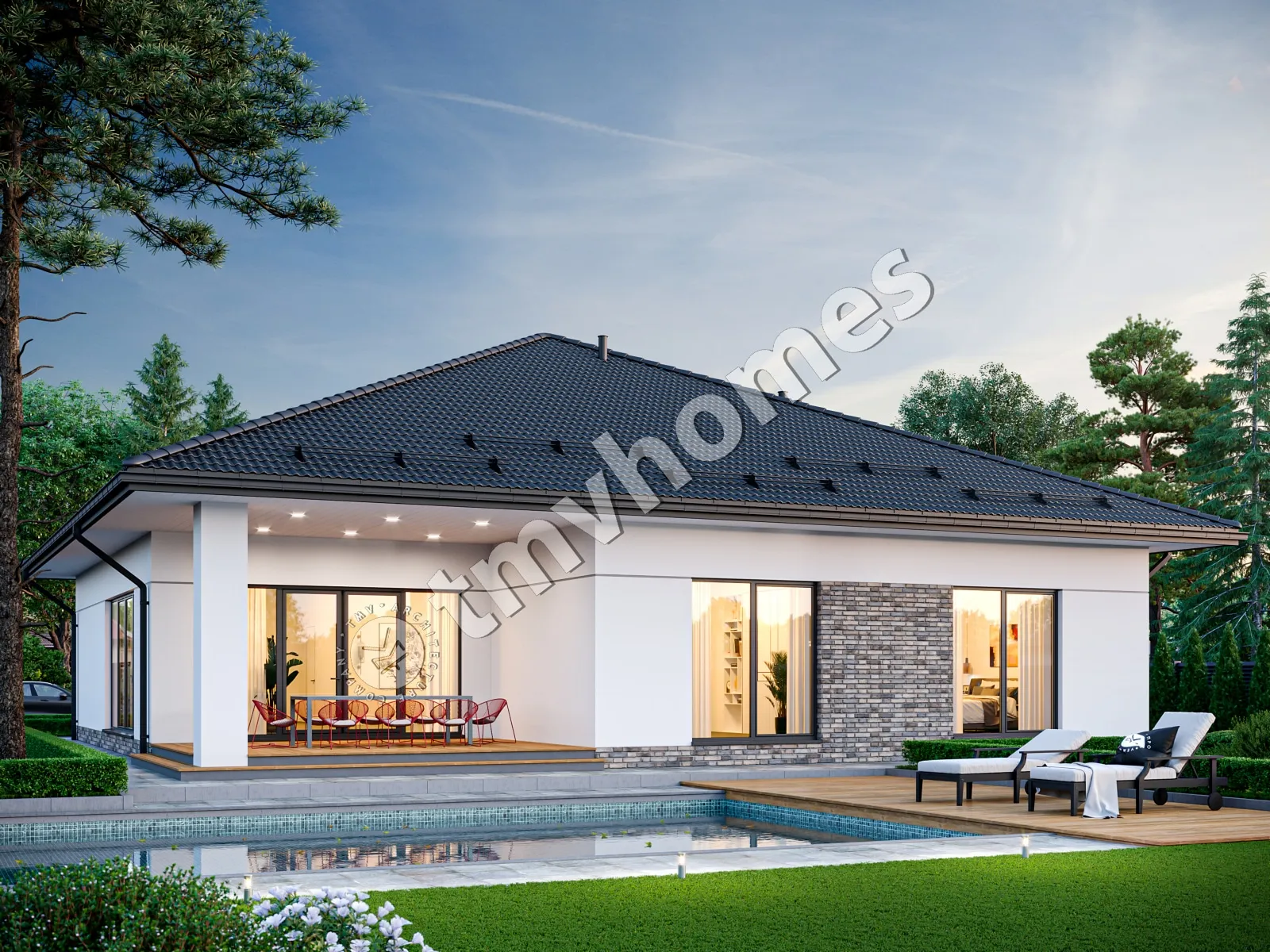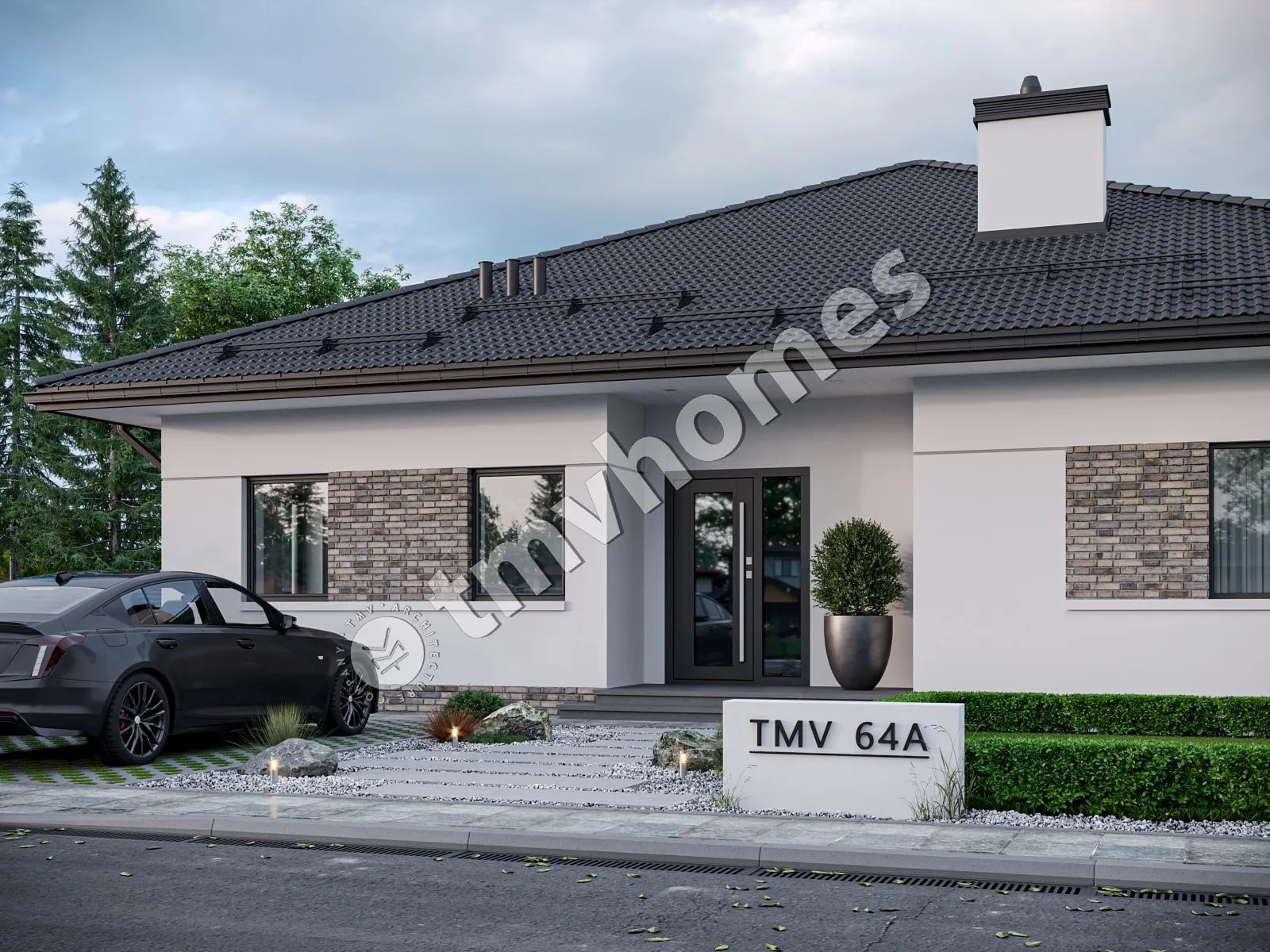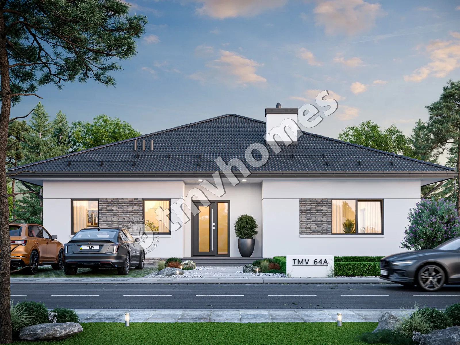 Проект TMV 64А - одноповерховий будинок без гаража, зі зручним плануванням та терасою. Склад приміщень: передпокій, вітальня, кухня-їдальня, 3 спальні, 2 санвузли, гардеробна, комора, котельня.
