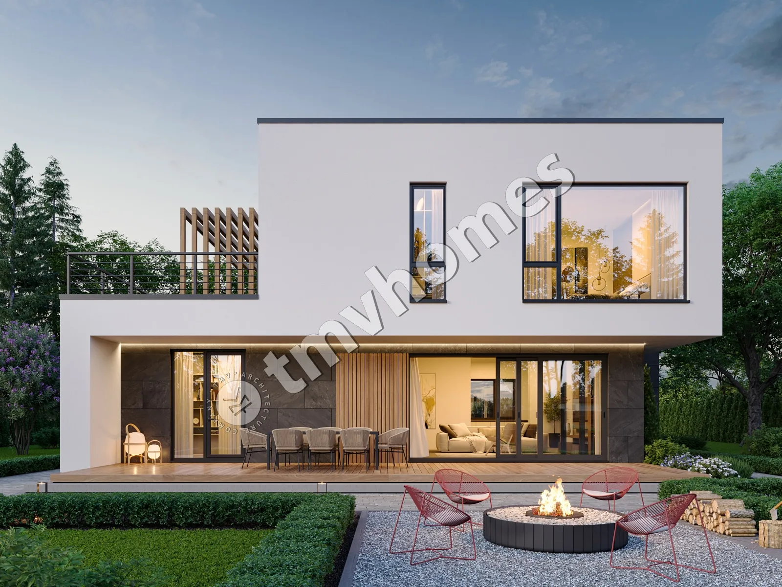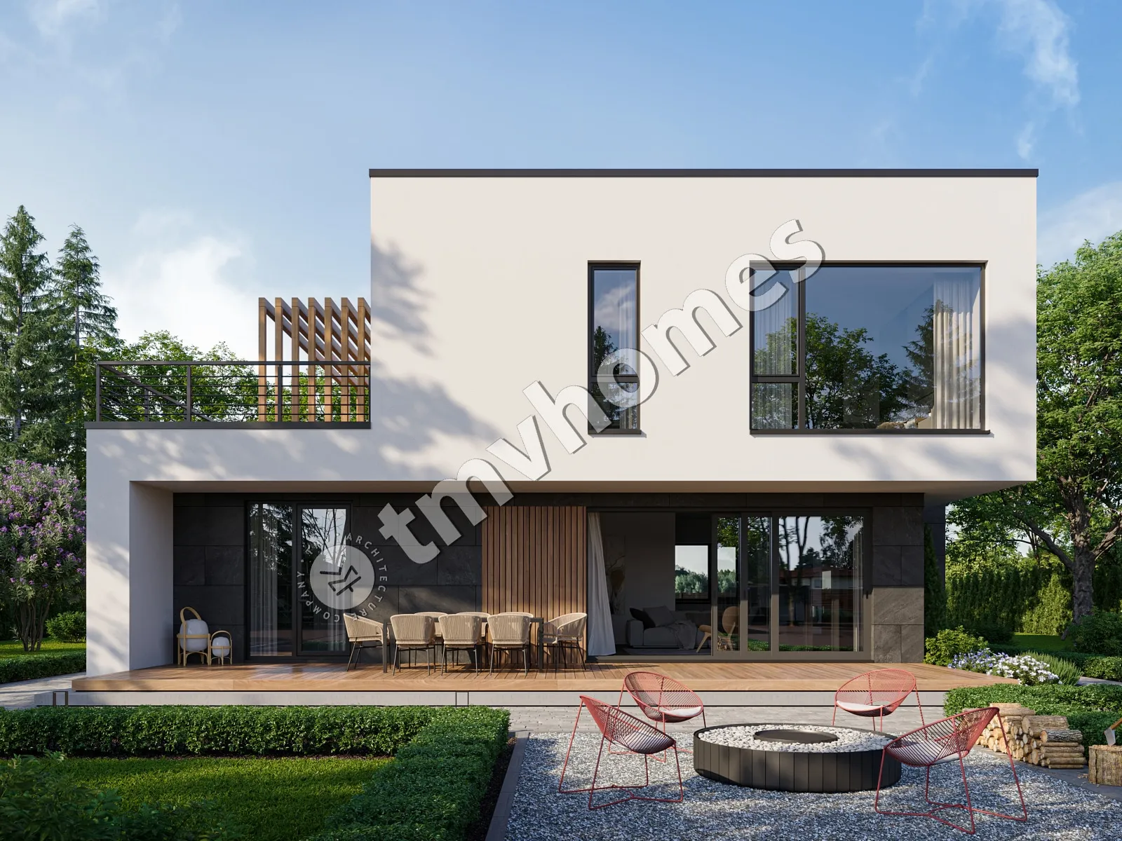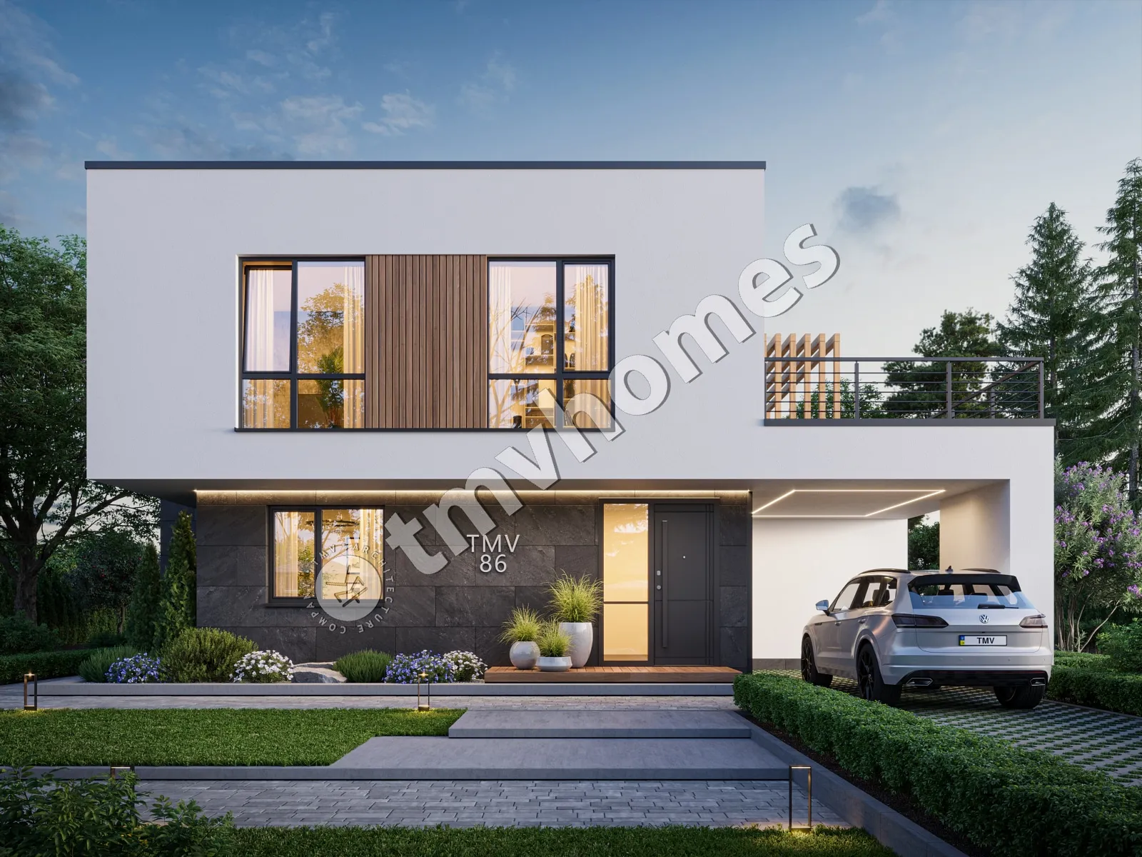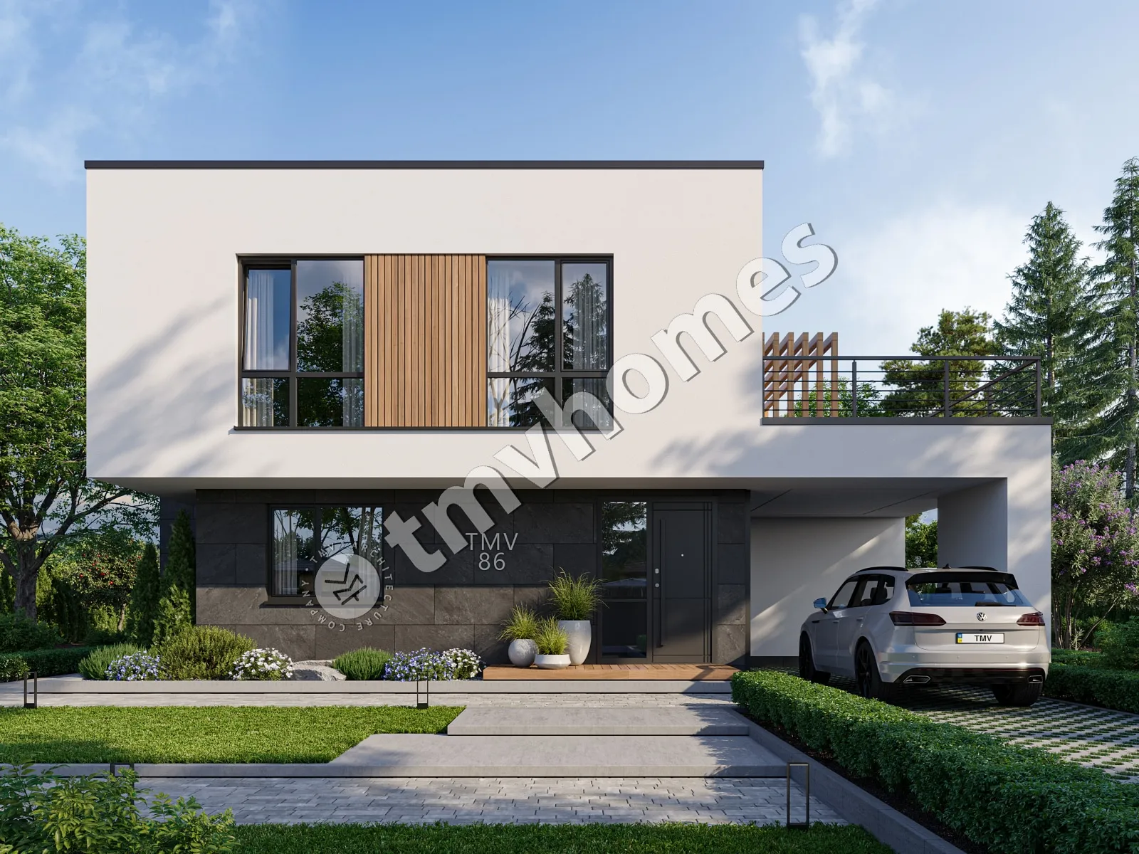Проект TMV 86 - сучасний двоповерховий будинок в стилі хай-тек з плоским дахом, терасами і навісом для 1 автомобіля. Склад приміщень: передпокій, хол, вітальня, кухня-їдальня, 3 спальні, 3 санвузли, гардеробна, комора, котельня.