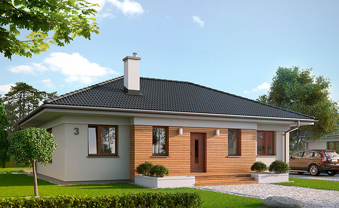 - Площадь в 49 квадратных метров подходит для любых земельных участков, даже для небольших. Более того, можно будет построить еще и террасу, которая визуально увеличит дом.