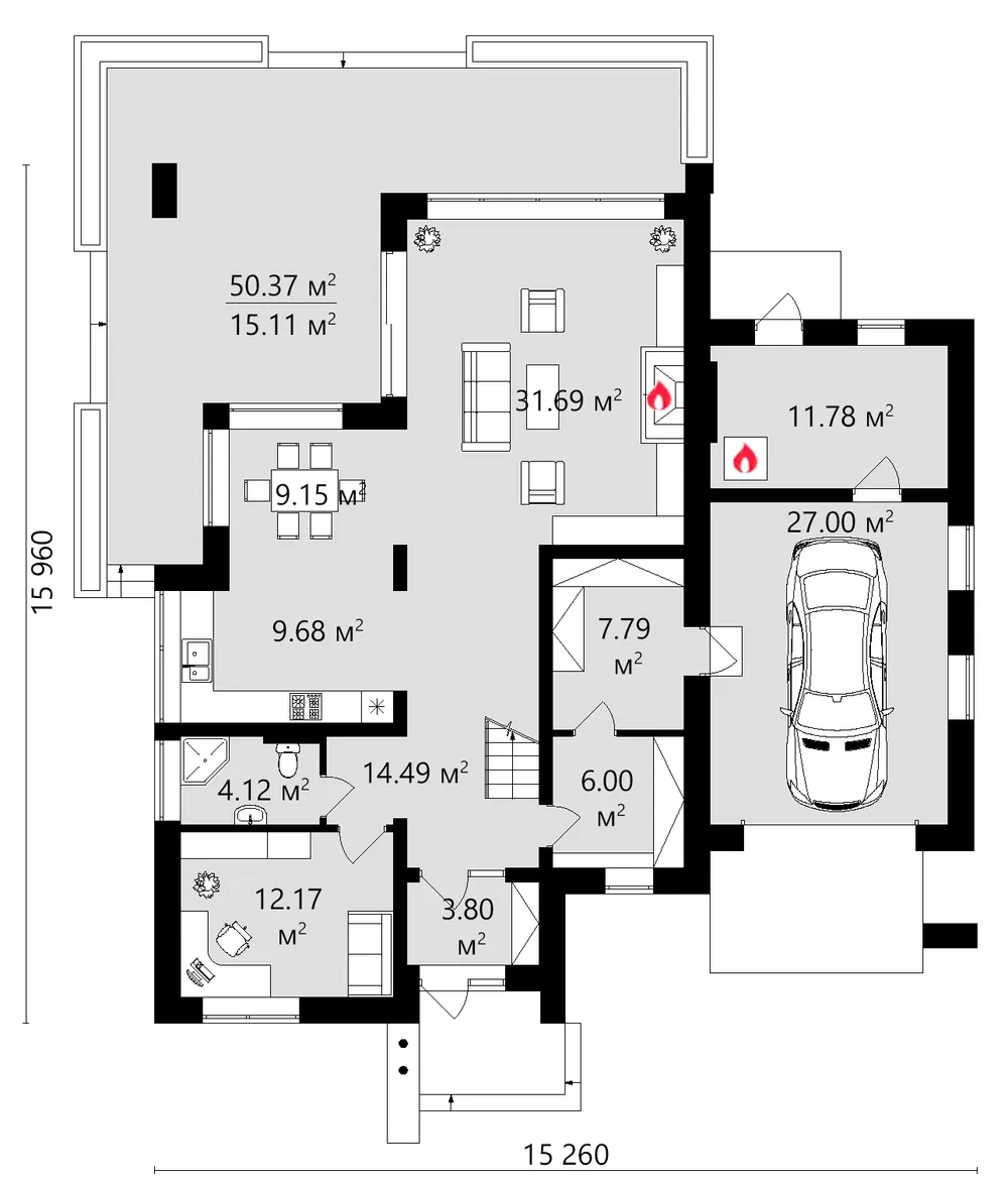Dimensions 15.26 x 15.96 m