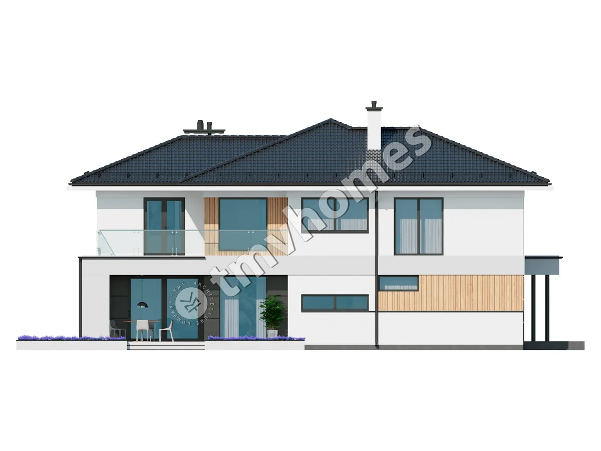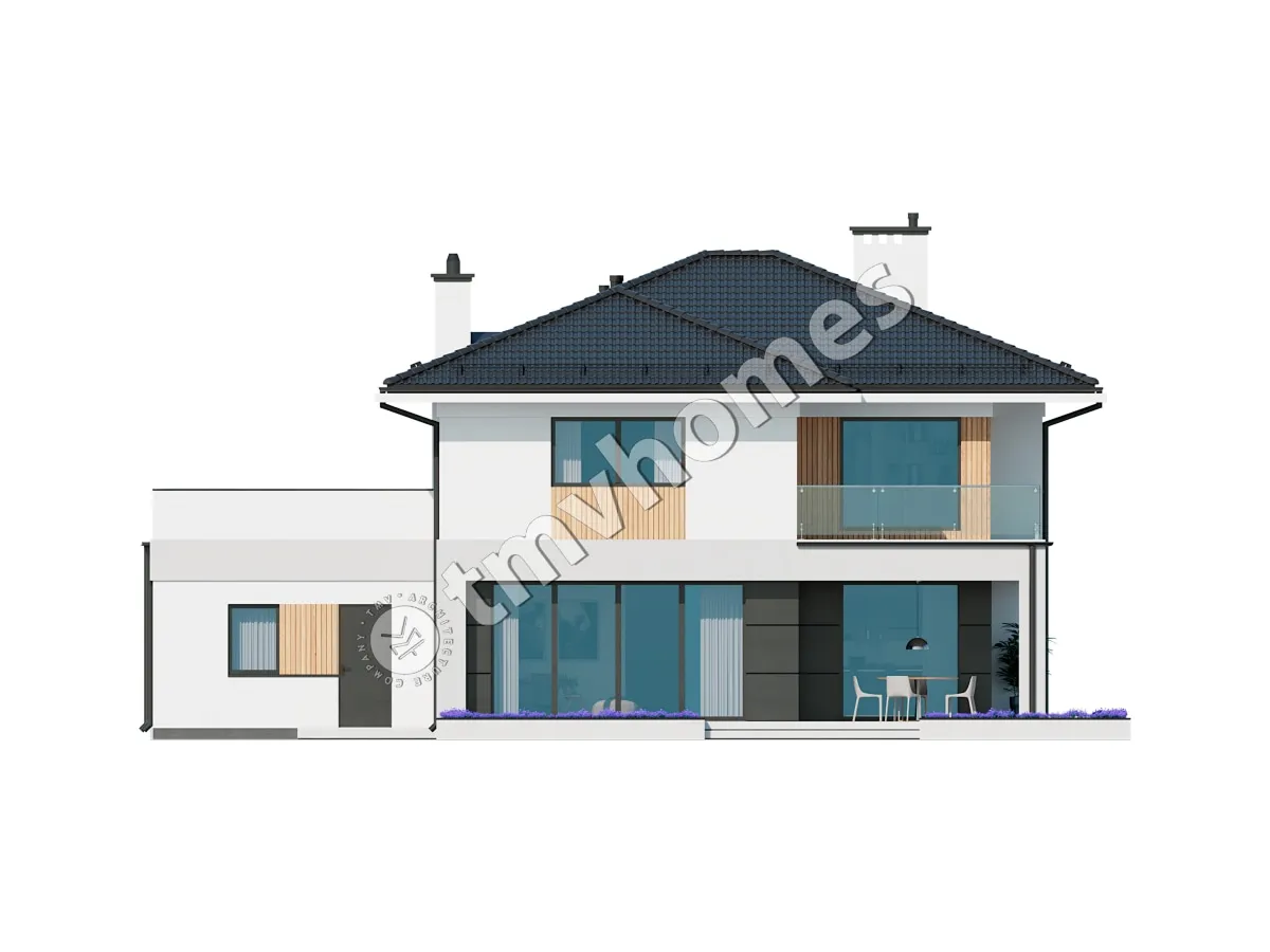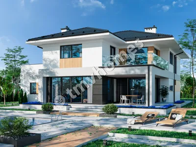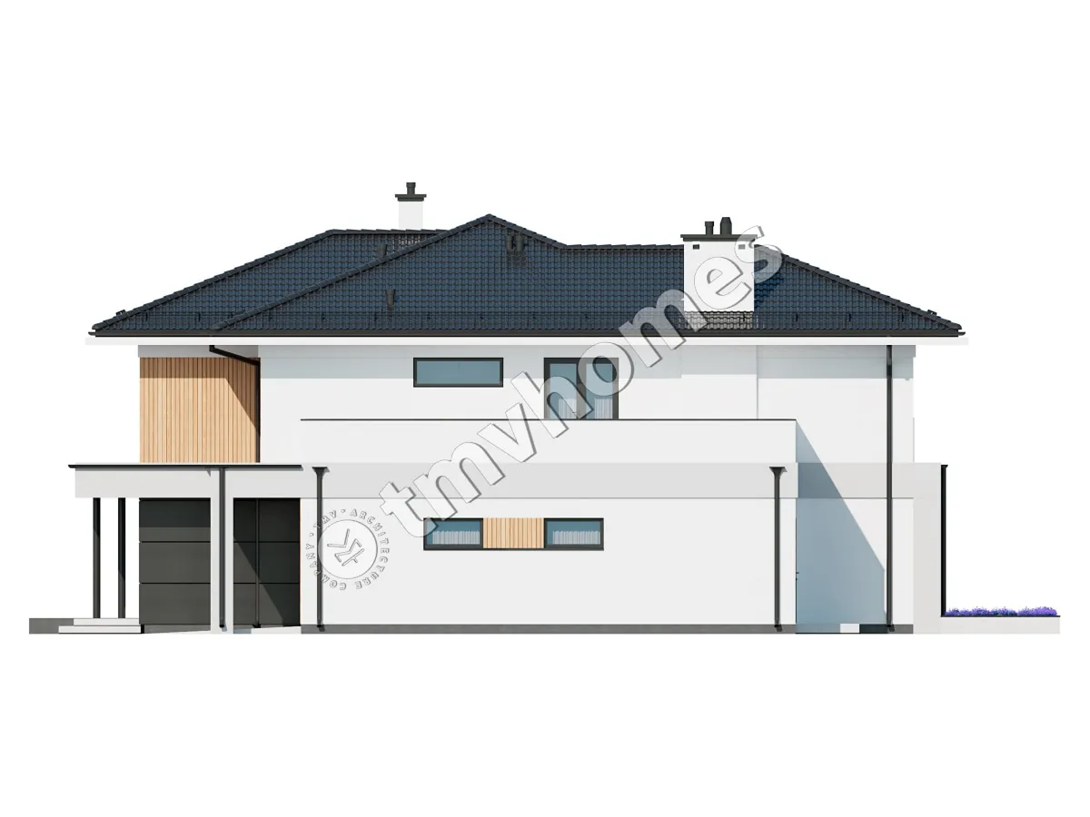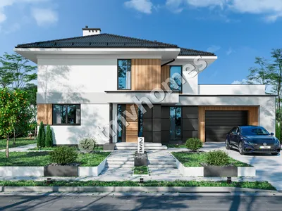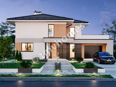 Project TMV 2 - a modern two-storey house with a second light, terraces and a garage for 2 cars. Composition of the premises: entrance hall, hall, kitchen-dining room, living room, 3 bedrooms, 2 bathrooms, dressing room, inventory room, storage room, boiler room.