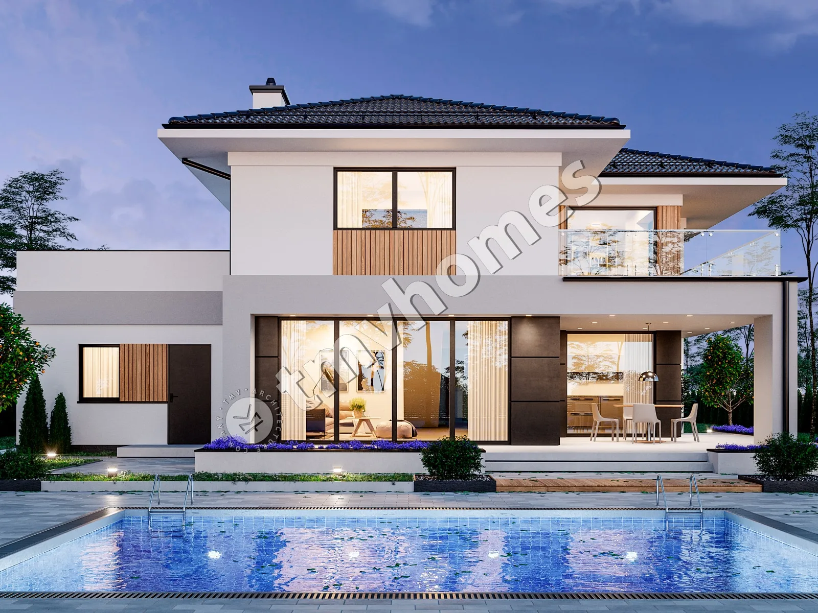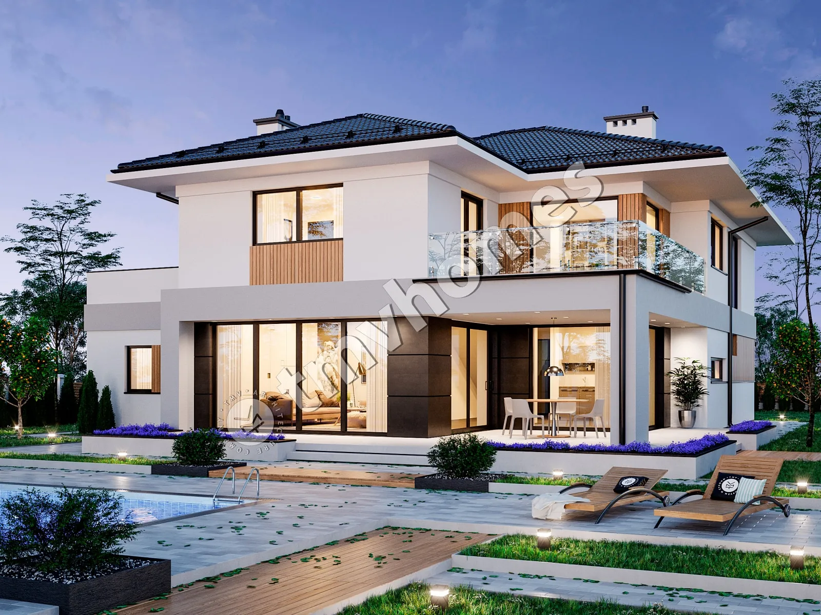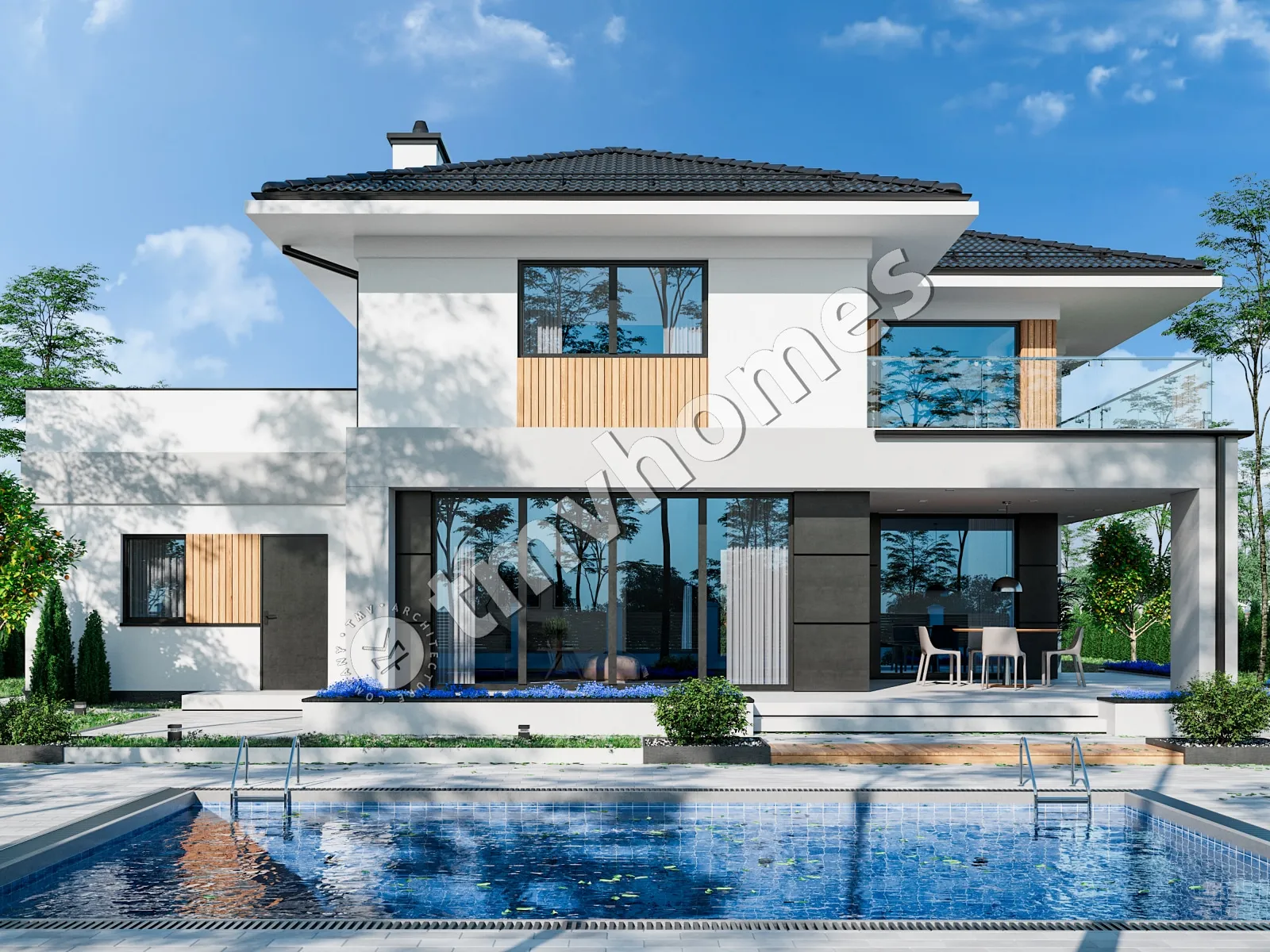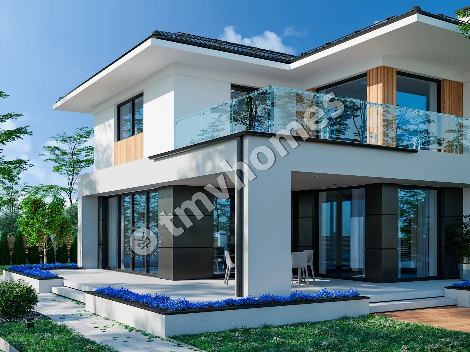 Project TMV 2 - a modern two-storey house with a second light, terraces and a garage for 2 cars. Composition of the premises: entrance hall, hall, kitchen-dining room, living room, 3 bedrooms, 2 bathrooms, dressing room, inventory room, storage room, boiler room.
