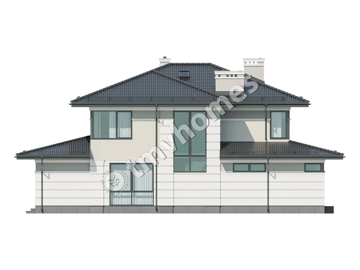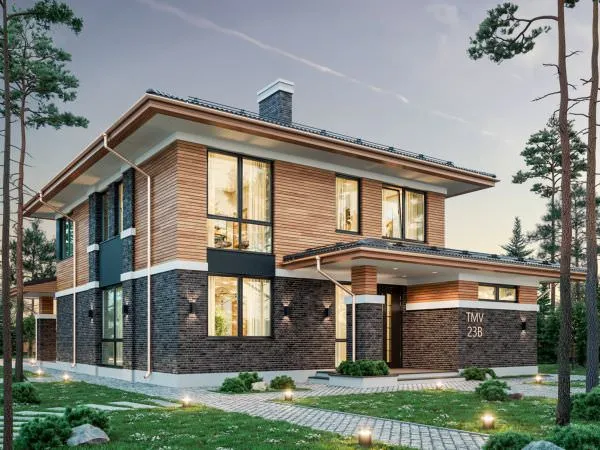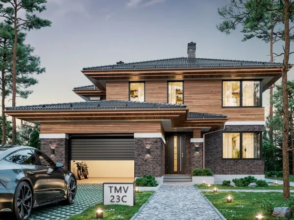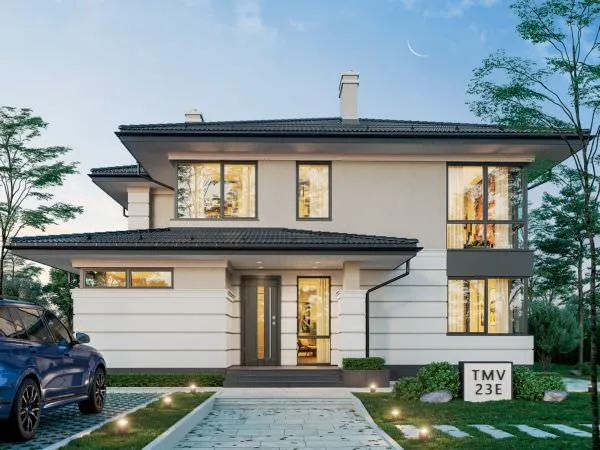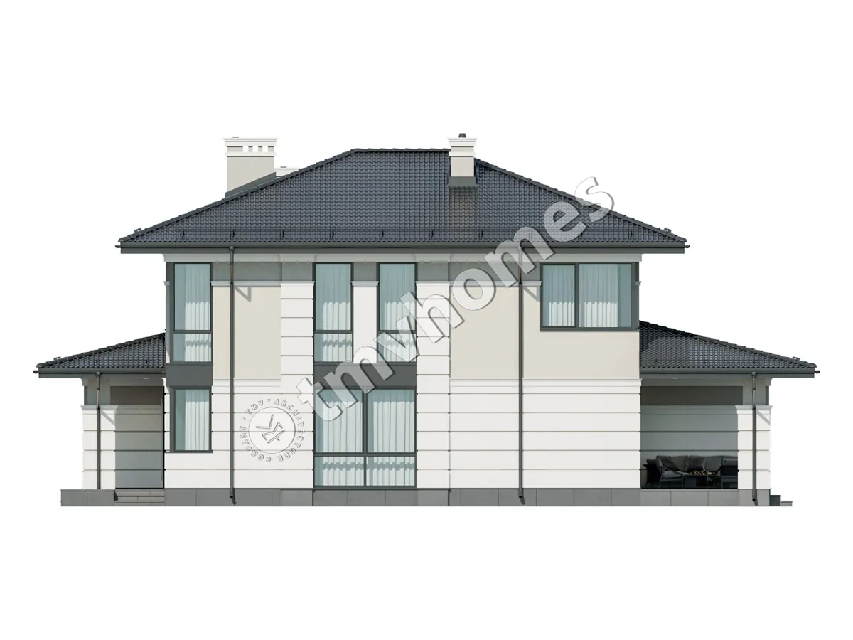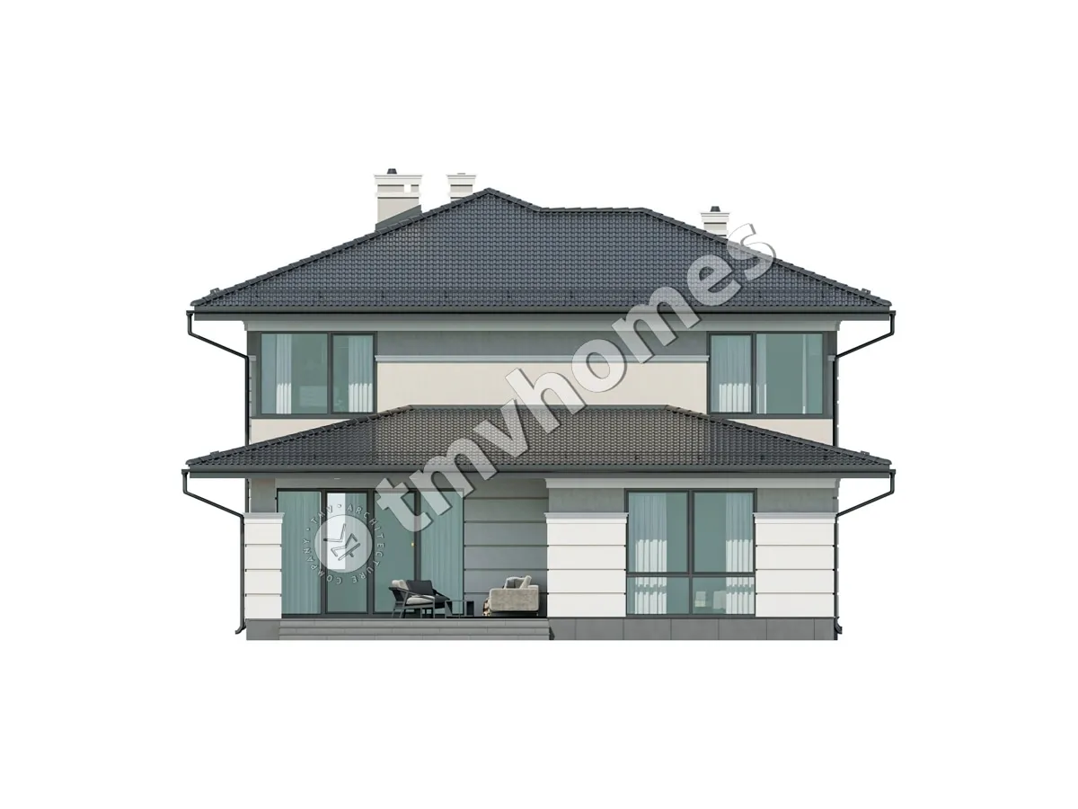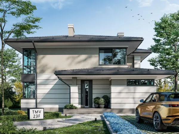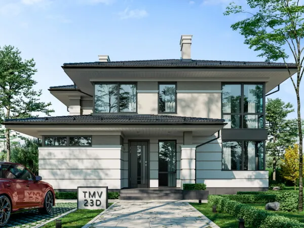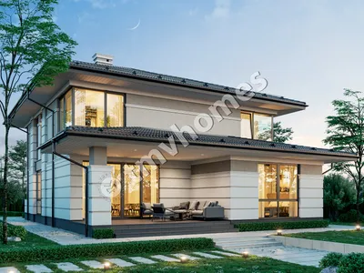Project TMV 23D - a modern two-storey house in Wright style with a terrace. Composition of the premises: entrance hall, hall, living room, kitchen-dining room, cabinet, 4 bedrooms, 3 bathrooms, laundry room, dressing room, boiler room.