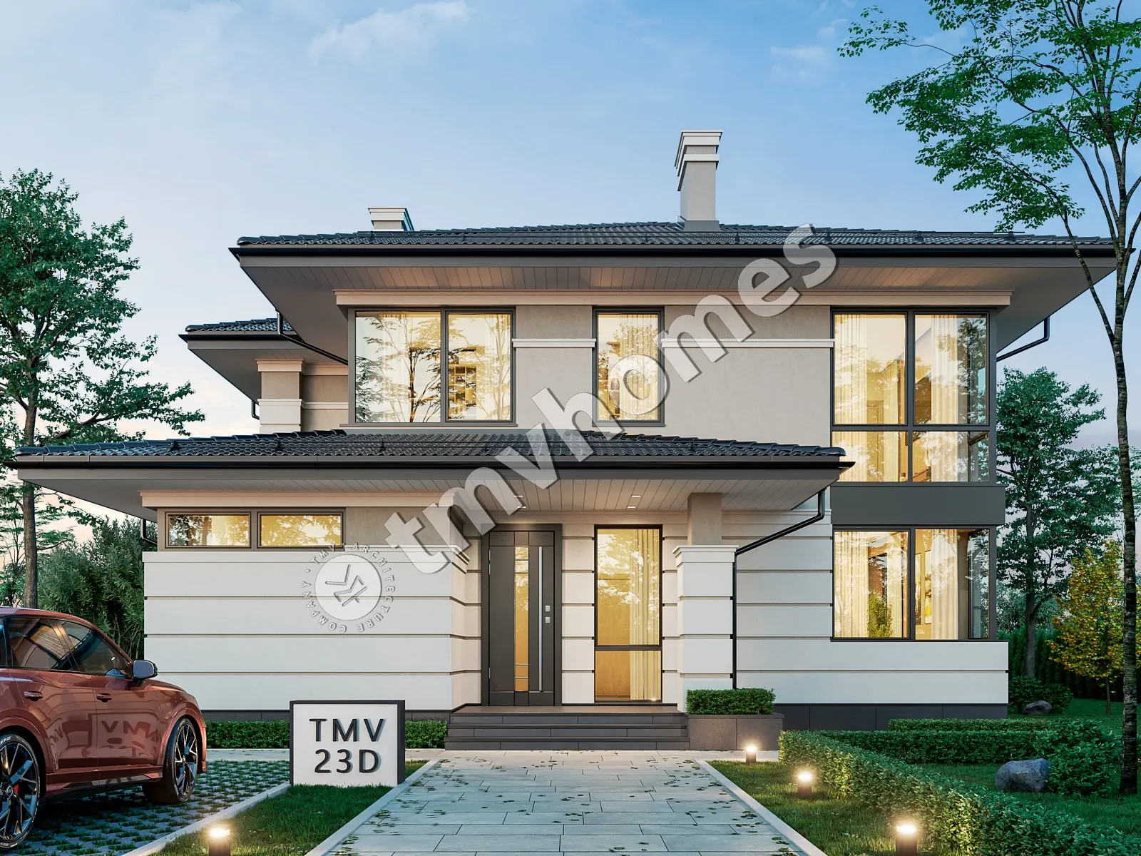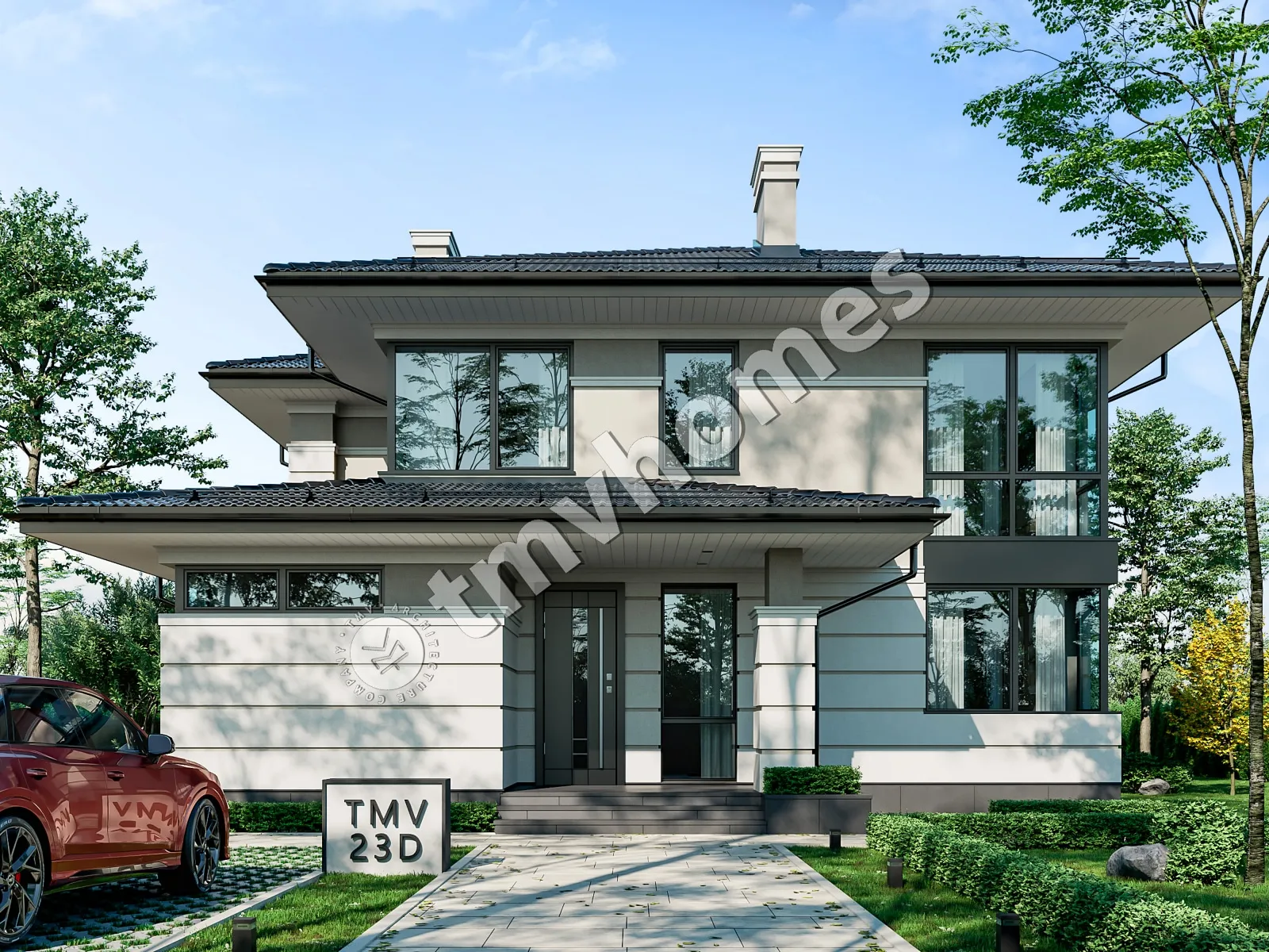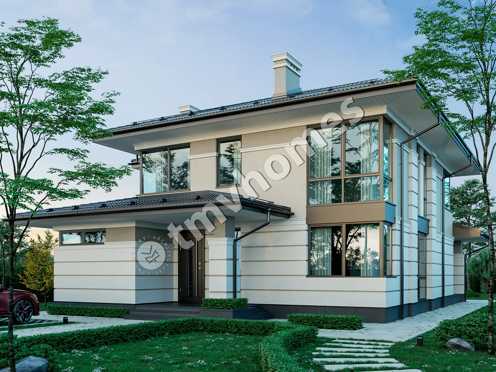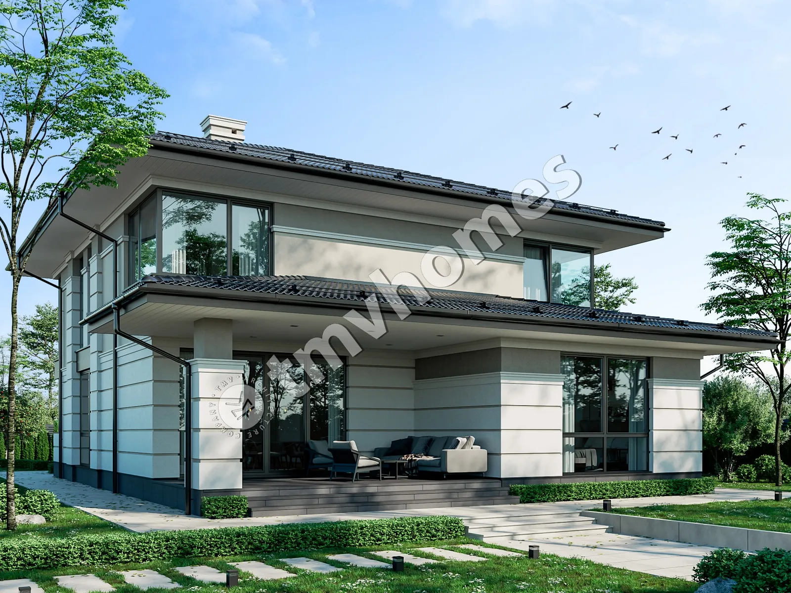 Project TMV 23D - a modern two-storey house in Wright style with a terrace. Composition of the premises: entrance hall, hall, living room, kitchen-dining room, cabinet, 4 bedrooms, 3 bathrooms, laundry room, dressing room, boiler room.
