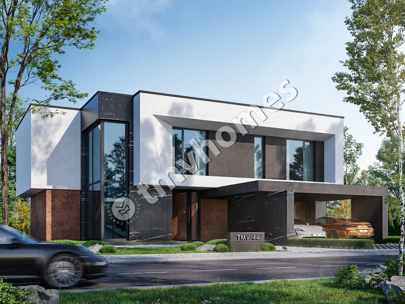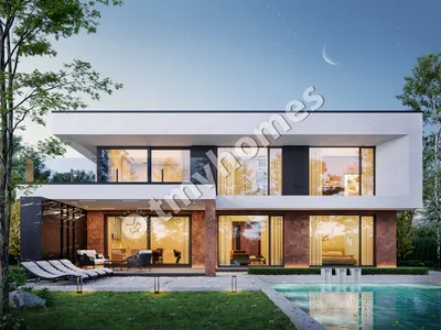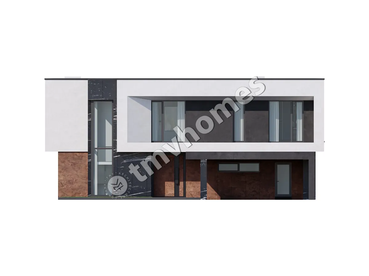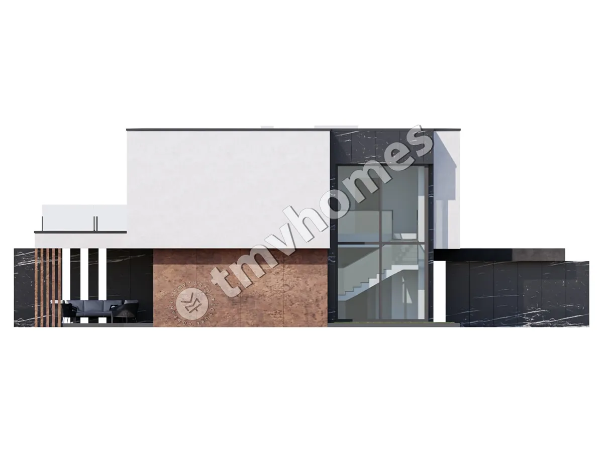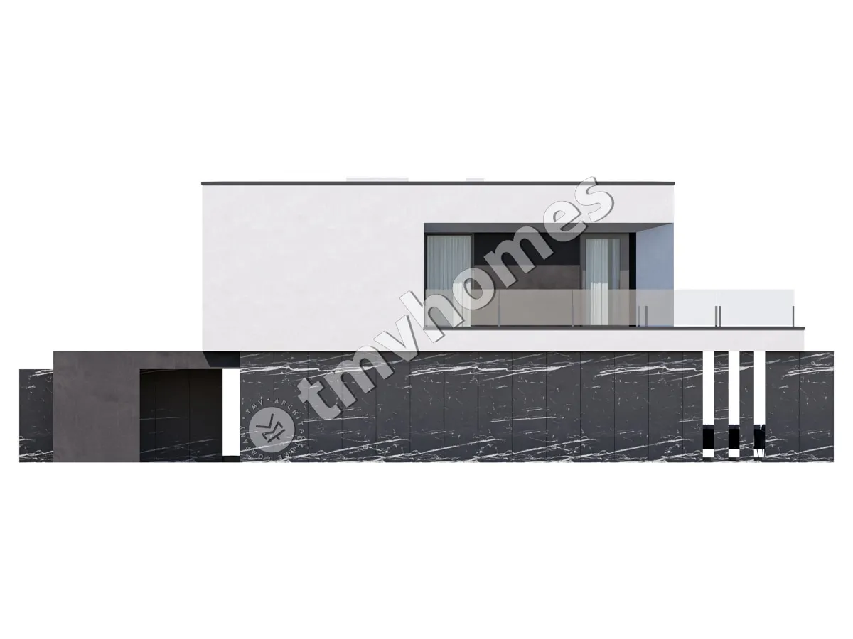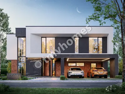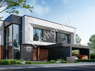Project TMV 44 - a modern two-storey high-tech house with an open plan, second light, terraces and a carport for 2 cars. Composition of the premises: hall, living room, kitchen-dining room, 4 bedrooms, 3 bathrooms, dressing room, storage room, boiler room.