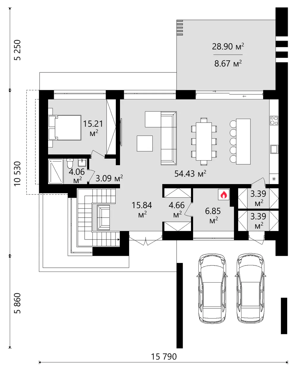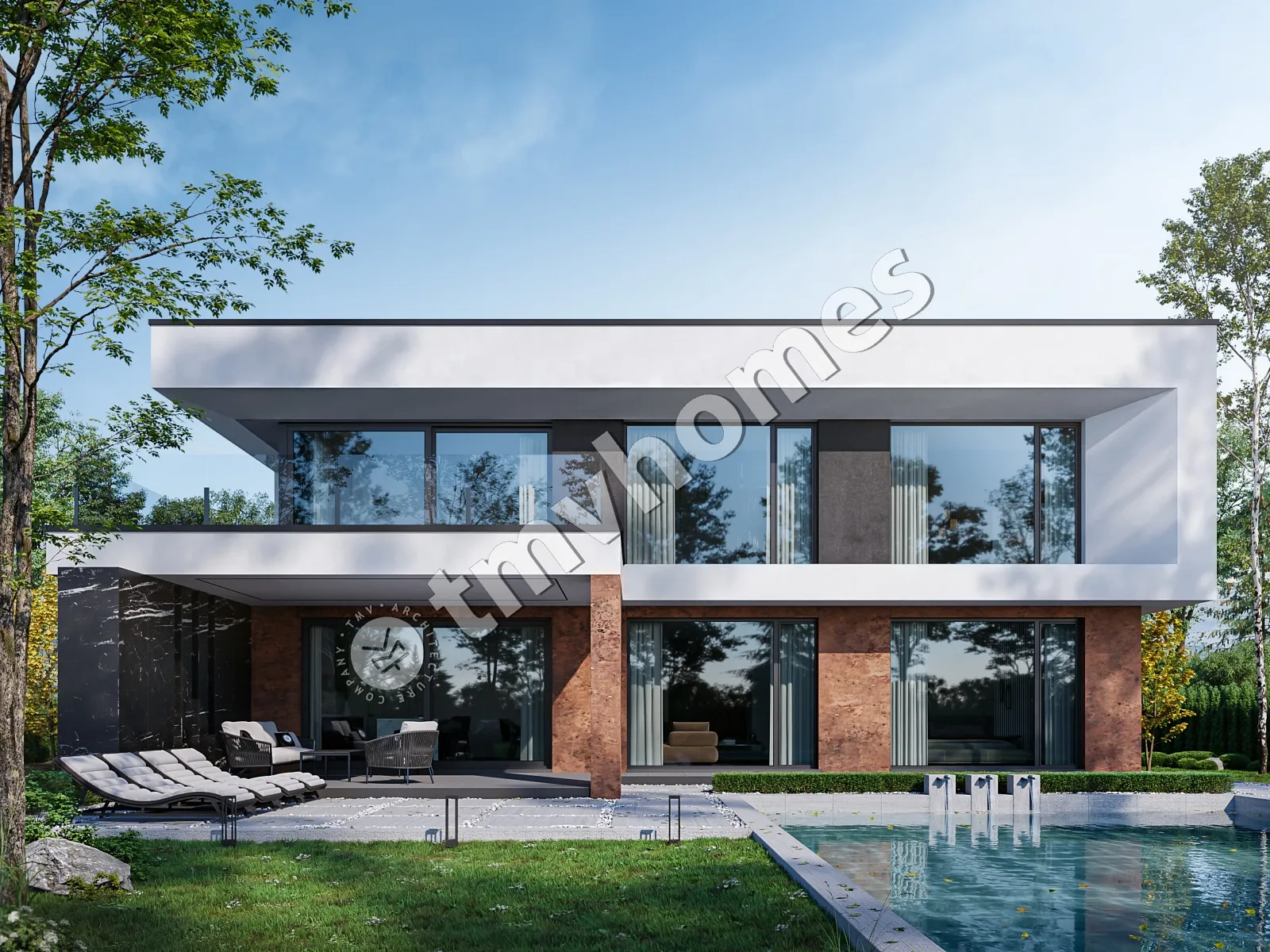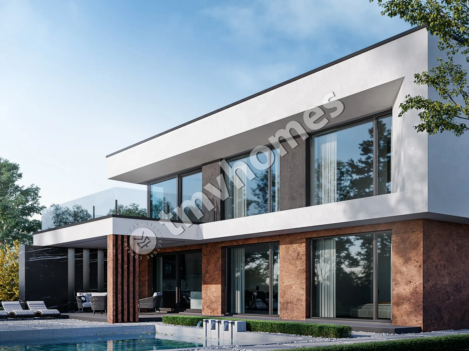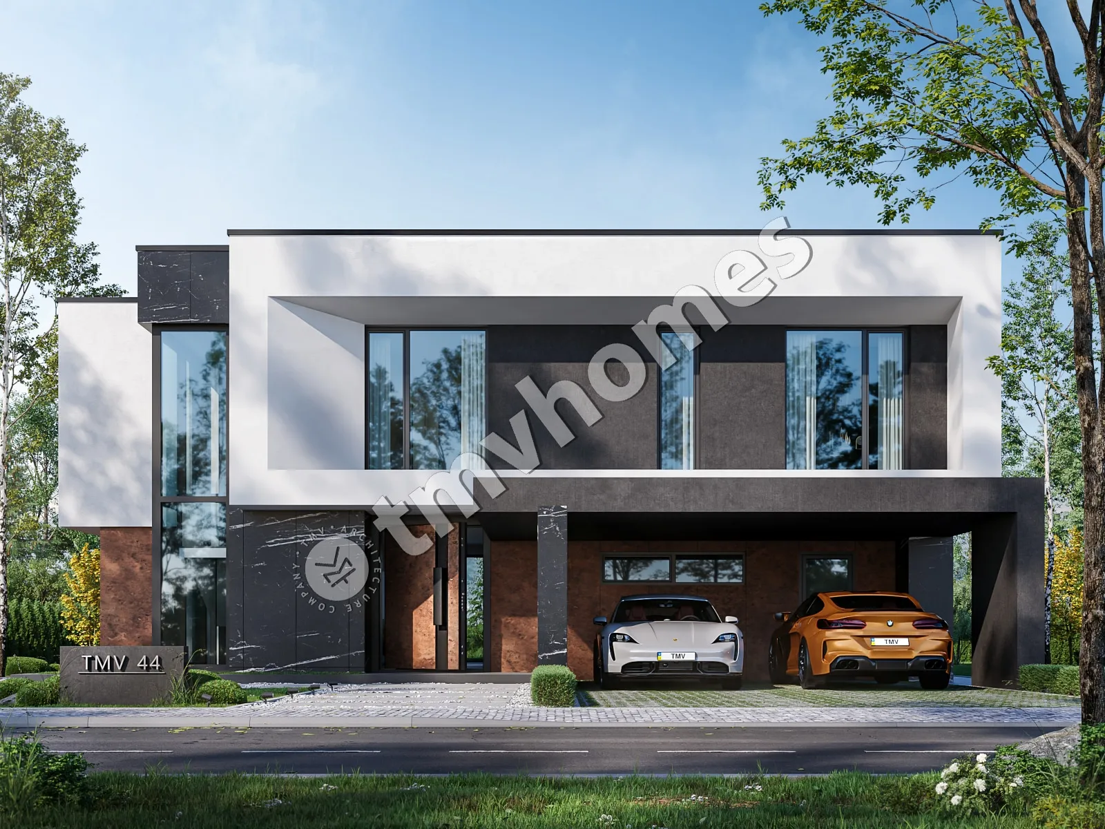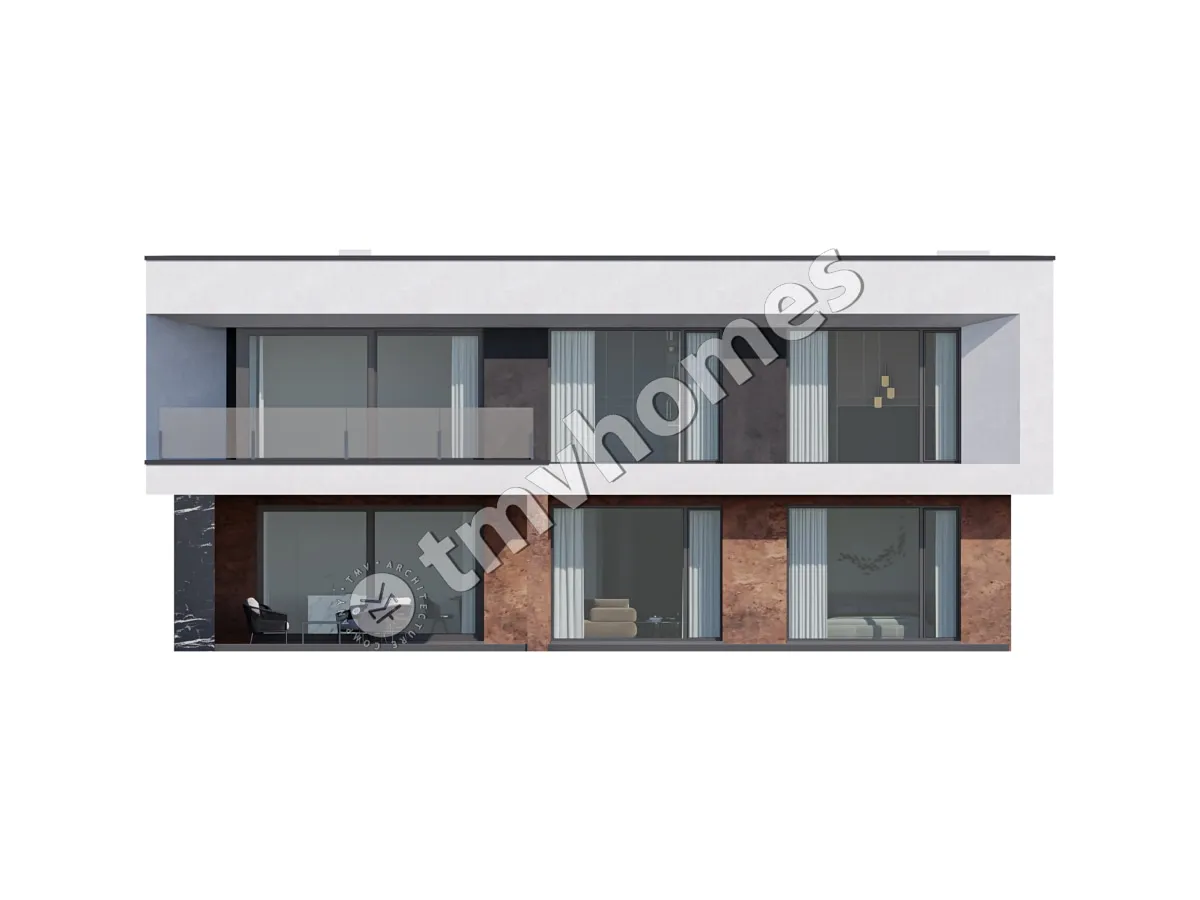 Project TMV 44 - a modern two-storey high-tech house with an open plan, second light, terraces and a carport for 2 cars. Composition of the premises: hall, living room, kitchen-dining room, 4 bedrooms, 3 bathrooms, dressing room, storage room, boiler room.