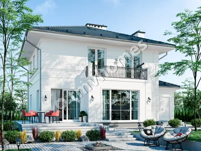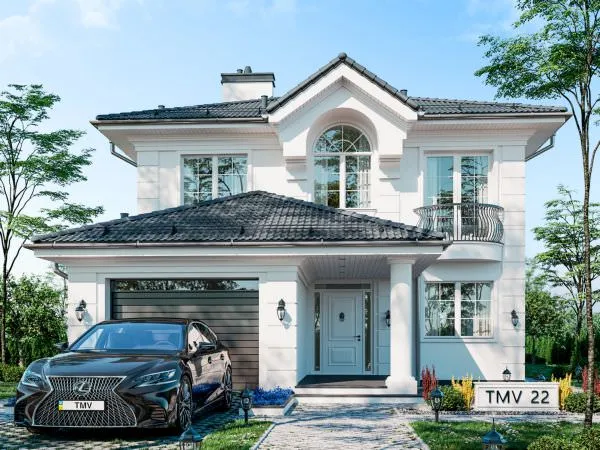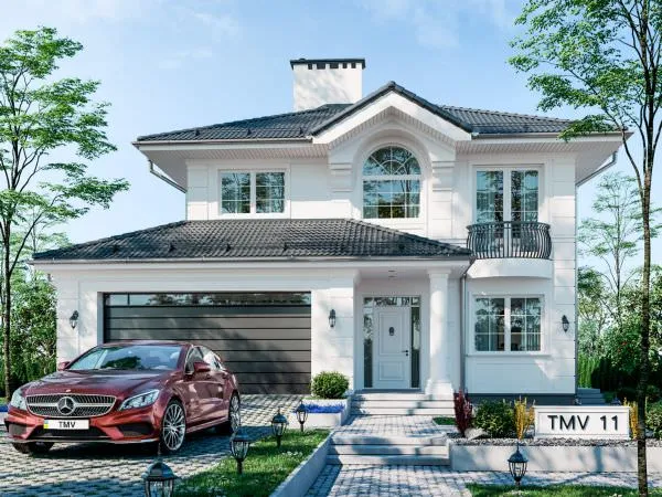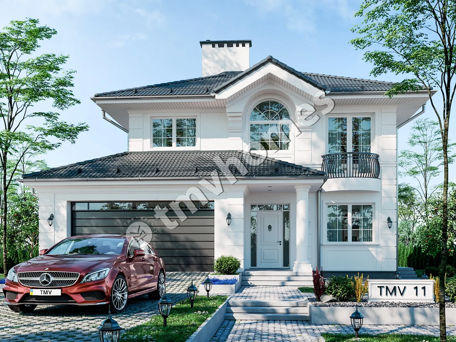 Проект TMV 11 - классический двухэтажный особняк с террасой и гаражом для 2 автомобилей. Состав помещений: прихожая, кухня-столовая, гостиная, кабинет, 3 спальни, 3 санузла, гардеробная, котельная.