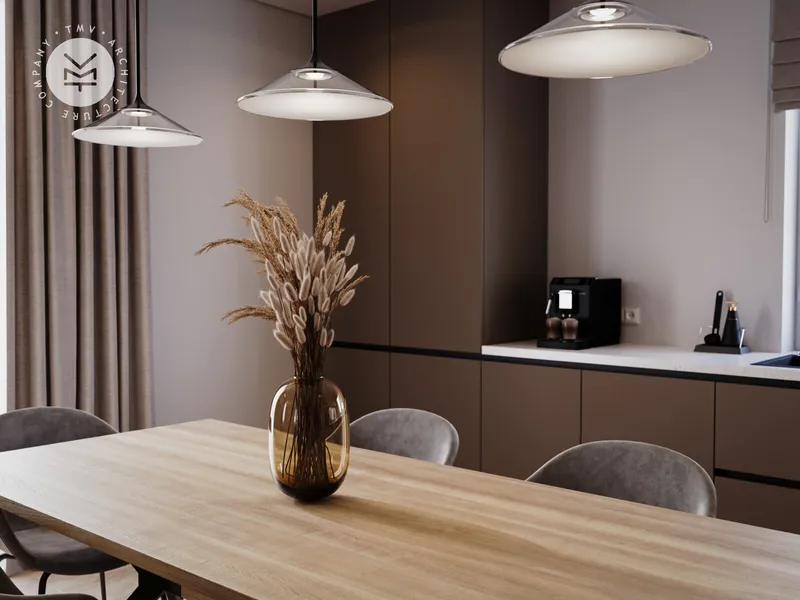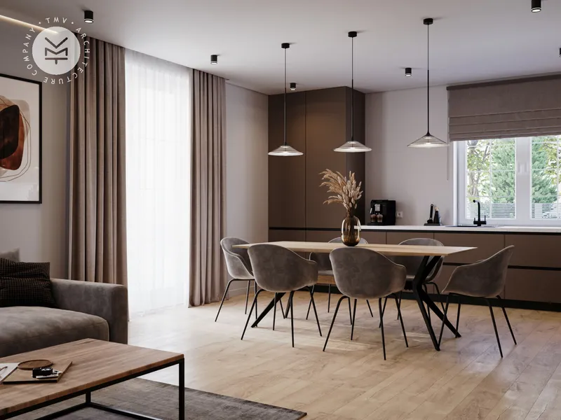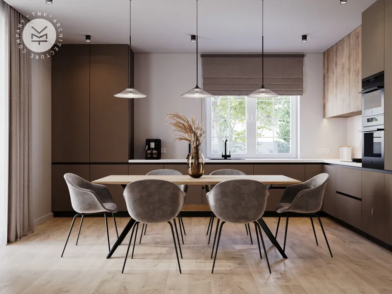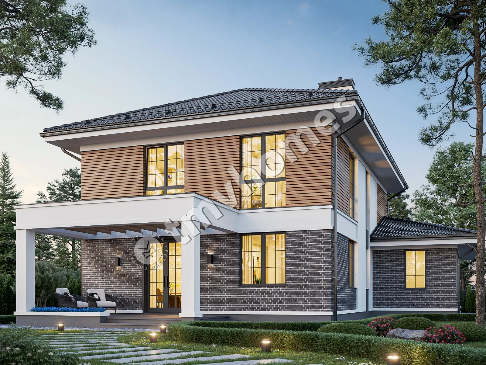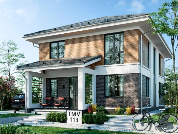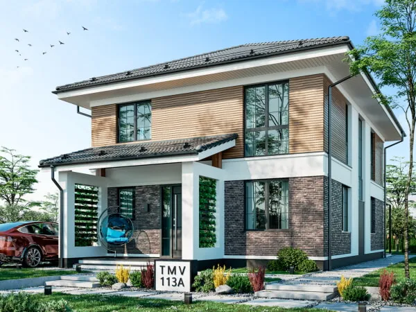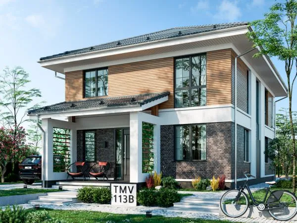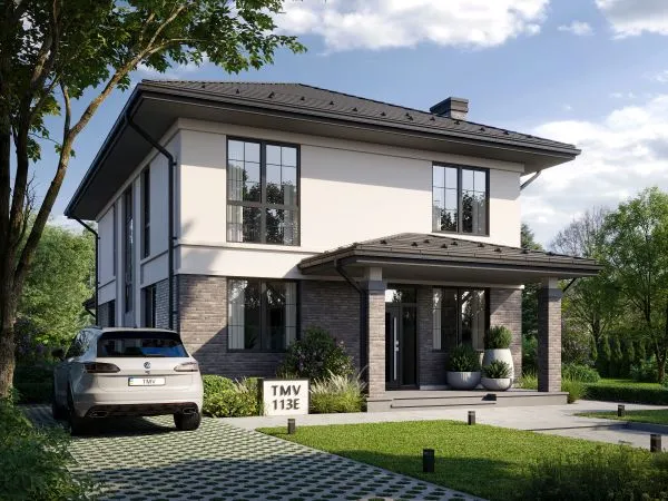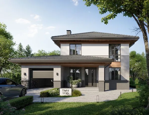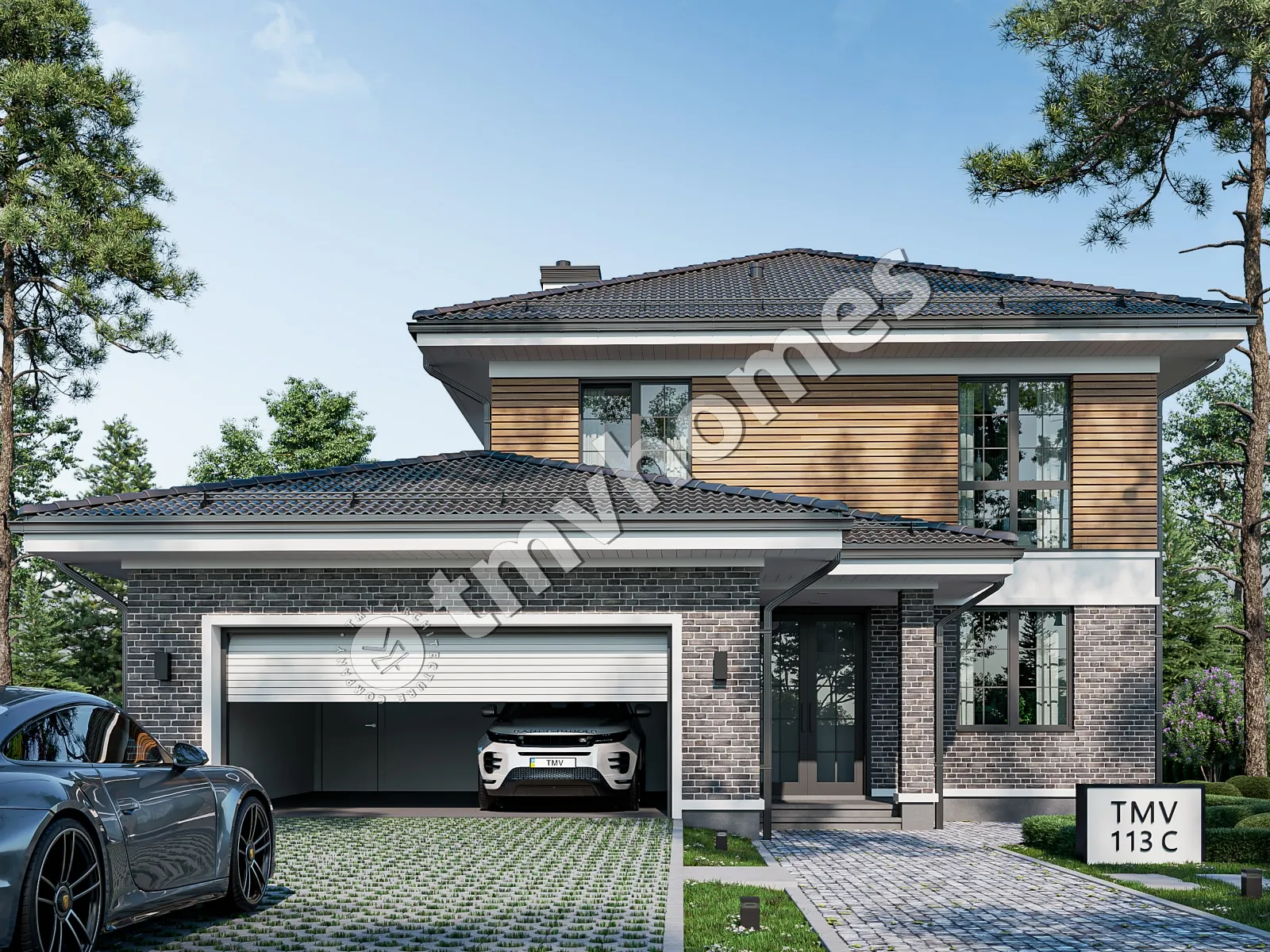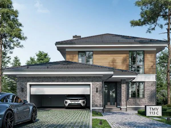 Проект TMV 113C - двухэтажный дом c террасой и гаражом для 2 автомобилей. Состав помещений: прихожая, гостиная, кухня-столовая, 4 спальни, 3 санузла, гардеробная, кладовая, котельная.