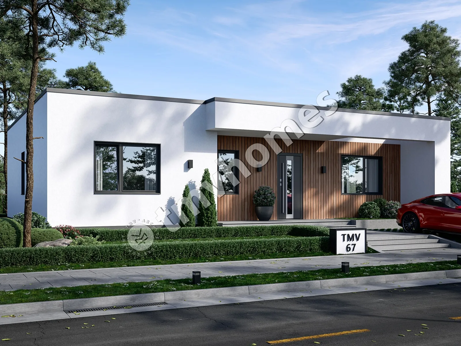 Проект TMV 67 - современный одноэтажный дом с плоской крышей, удобной планировкой и террасой. Состав помещений: прихожая, холл, гостиная, кухня-столовая, 3 спальни, 2 санузла, котельная.